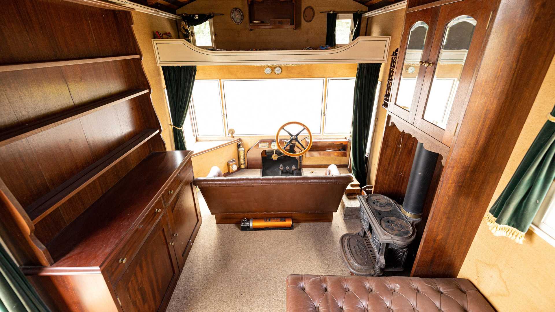 Im Wohnraum punktet der Oldie mit gleich vier Schlafplätzen sowie einem Holzofen, auf dem natürlich auch gekocht werden kann. Die Sitzbank im Fahrerhaus kann umgeklappt werden und dient somit als Sofa im Wohnbereich.