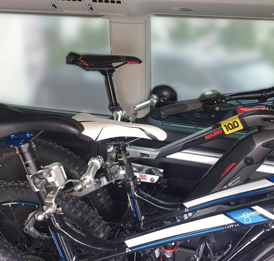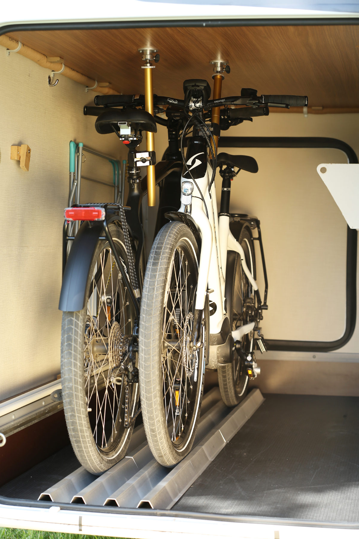 Das bike-holder-System ist vor allem eins: deutlich kompakter und flexibler als manch andere Lösung für den Transport von Rädern in Wohnmobilgarage oder Kastenwagen. Das System besteht aus verschiedenen Bauteilen, die individuell miteinander kombiniert werden können und so auf die jeweiligen Voraussetzungen anpassbar sind. Und wenn die Räder mal nicht mit kommen, bleibt außer einer recht kleinen Halterung an Wand oder Decke nichts im Fahrzeug zurück.