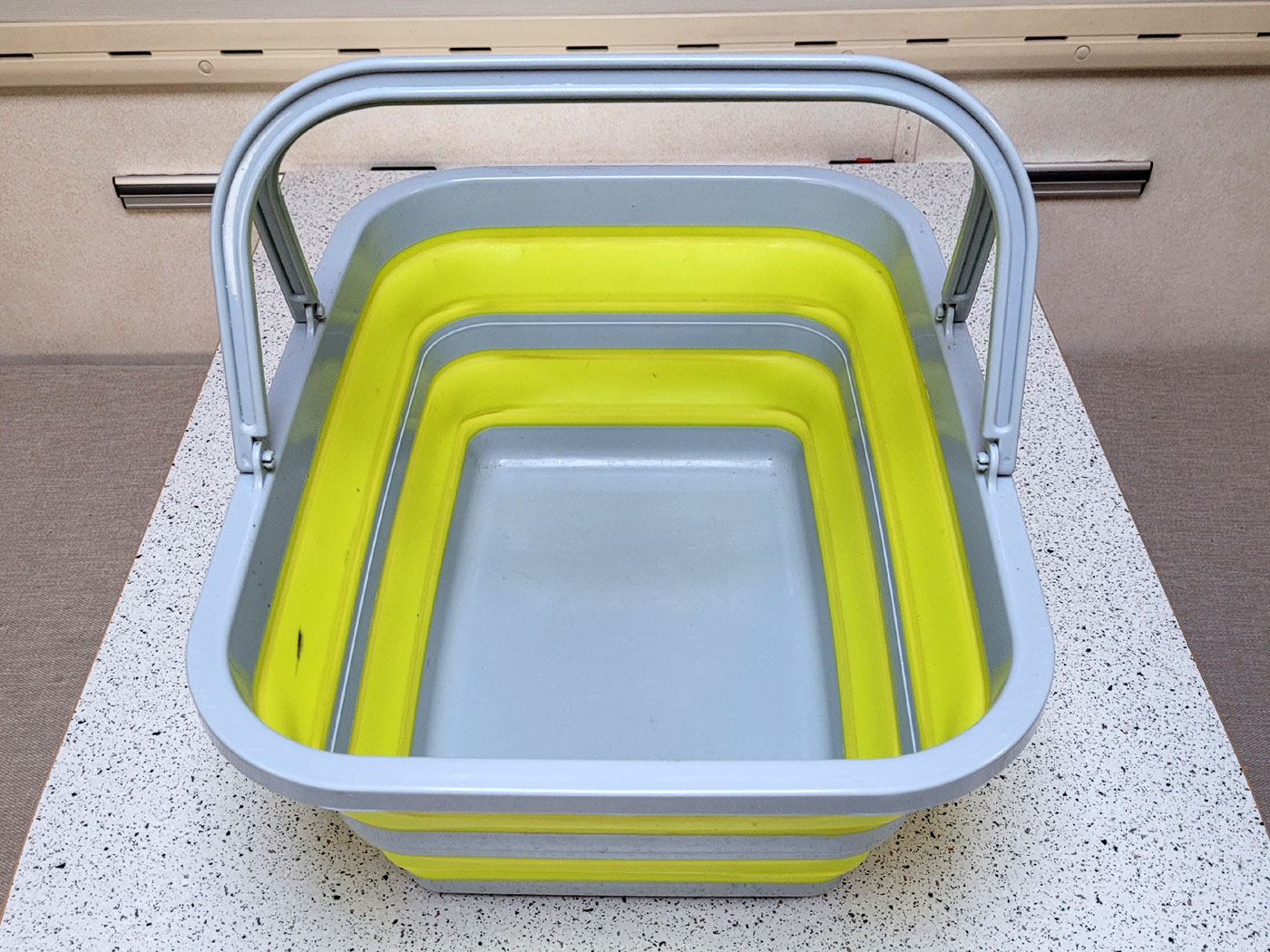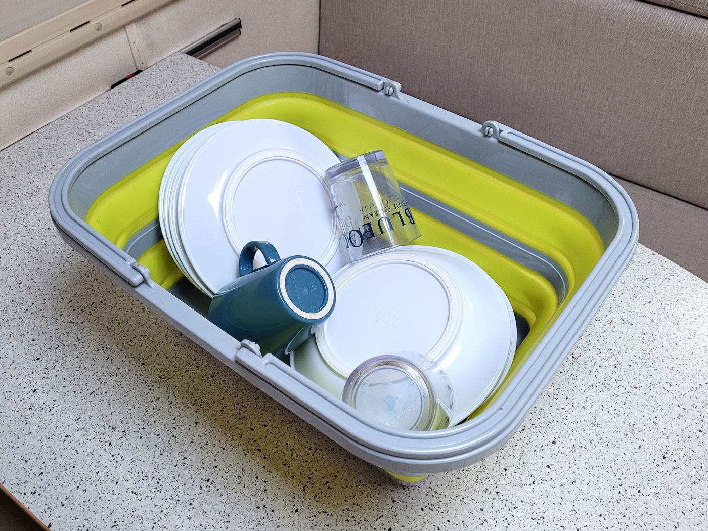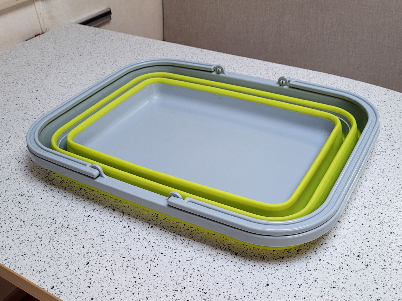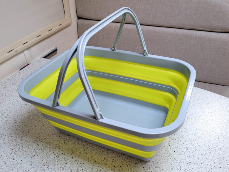 Den Einstieg mache ich mit einem vielleicht eher langweiligen, aber für mich überaus praktischen Utensil – einem Falt- und Spülkorb von Brunner. Das Ding misst ausgeklappt ca. 46 x 34 x 18 cm und wenn wann es zusammen“drückt“ nur noch 46 x 34 x 5 cm. In der Praxis verschwindet der Korb bei uns bei Nichtgebrauch in einem Spalt zwischen hinterem Doppelbett und angrenzender Küche.