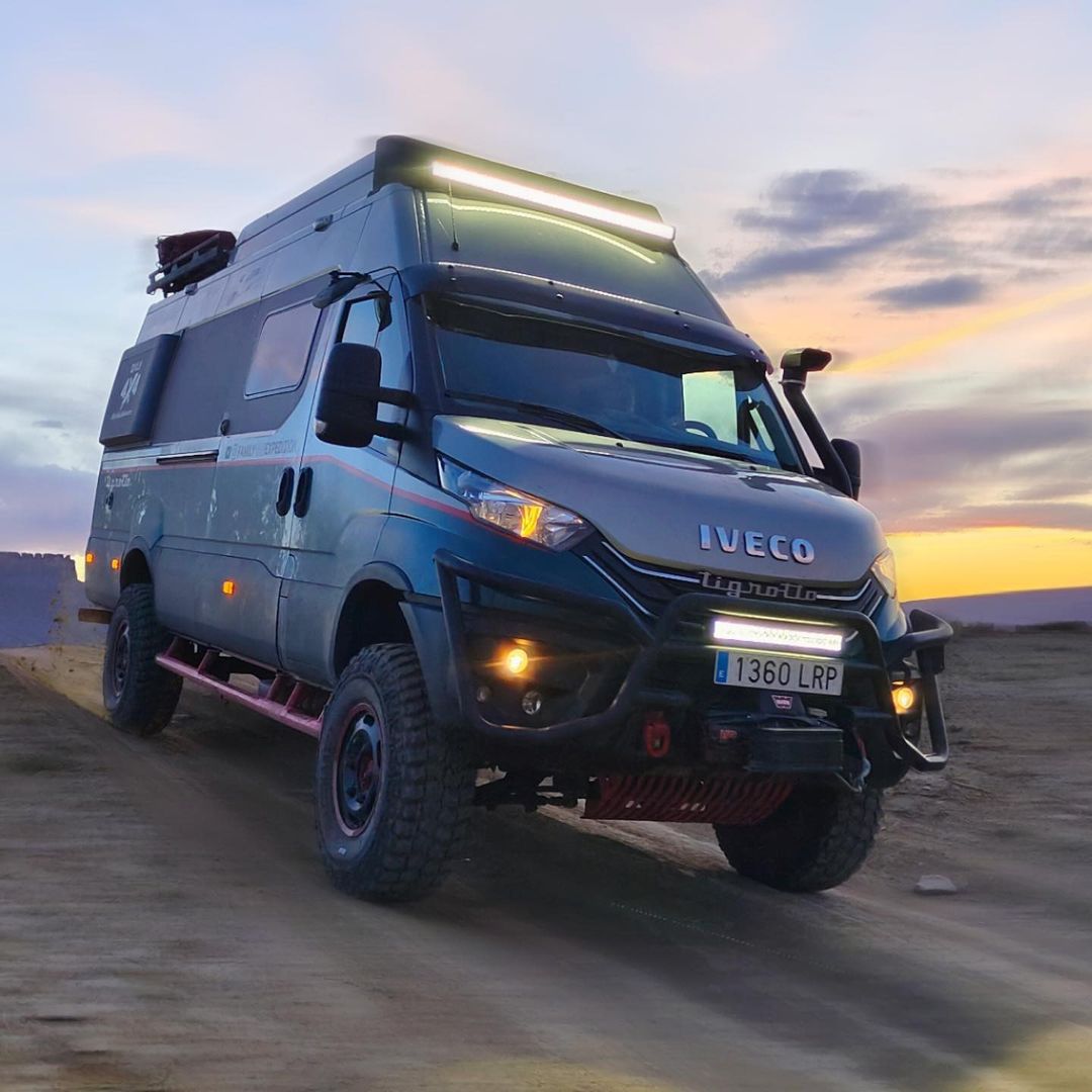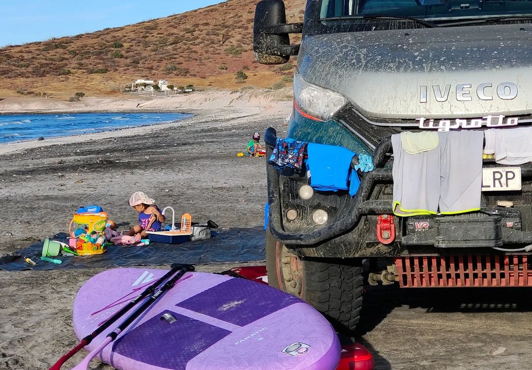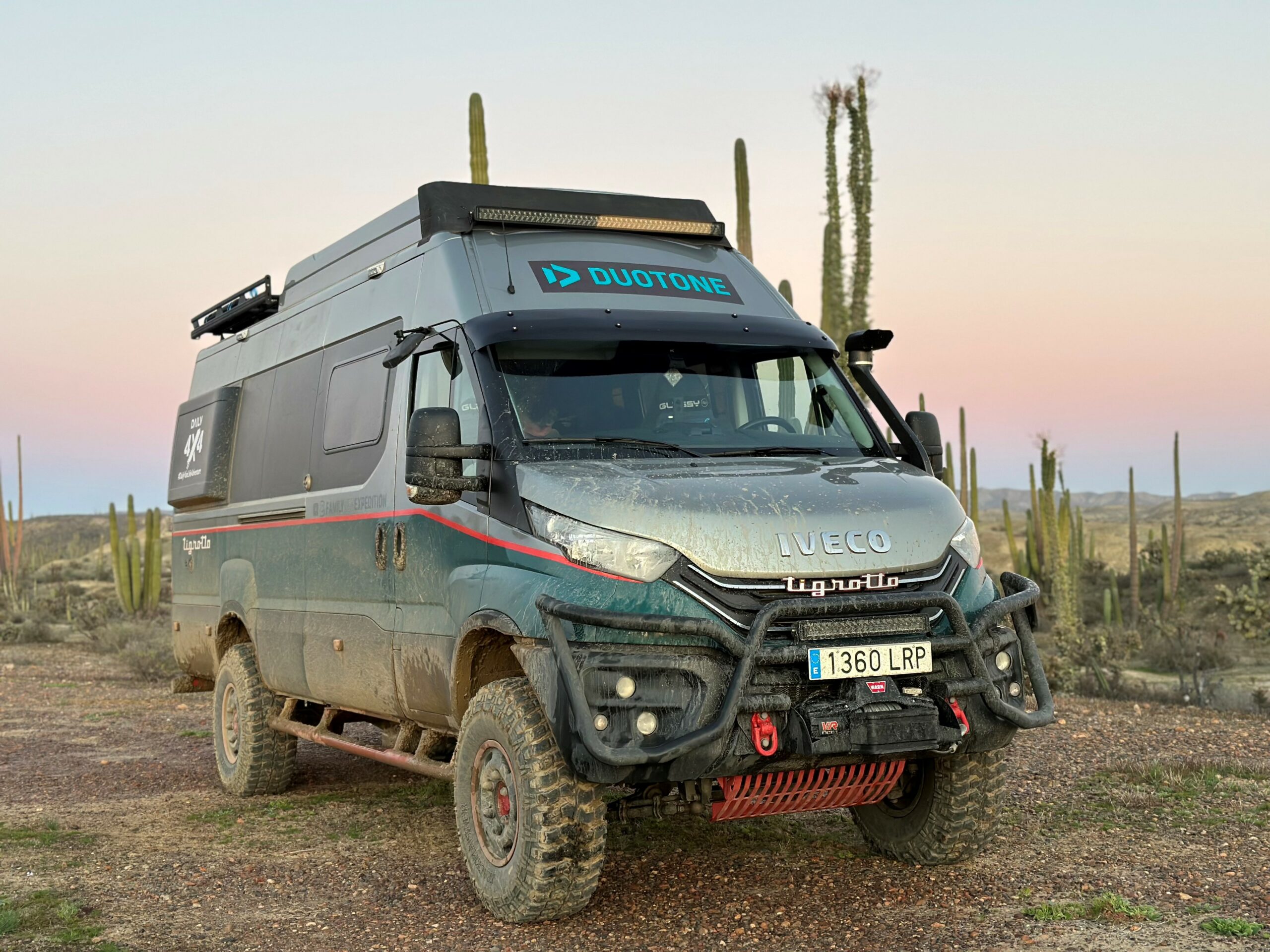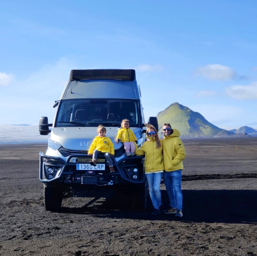 Hallo ihr alle. Wir sind „Family Van Expedition“. David ist Feuerwehrmann in Barcelona und professioneller Drohnenflieger. Mein Name ist Nuria und ich bin Profi-Kitesurferin und Content-Erstellerin. Zusammen mit unseren Kindern Koa (4) und Kaia (2) bereisen wir die Welt in unserem Expeditionsfahrzeug – einem IVECO Daily 4×4 von 2021 mit inzwischen 39.000 km auf dem Tacho.