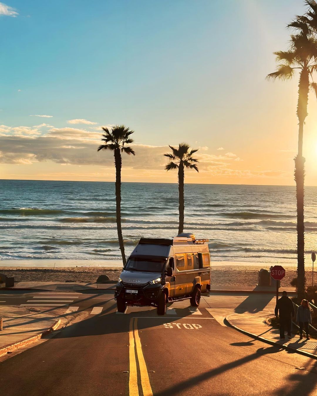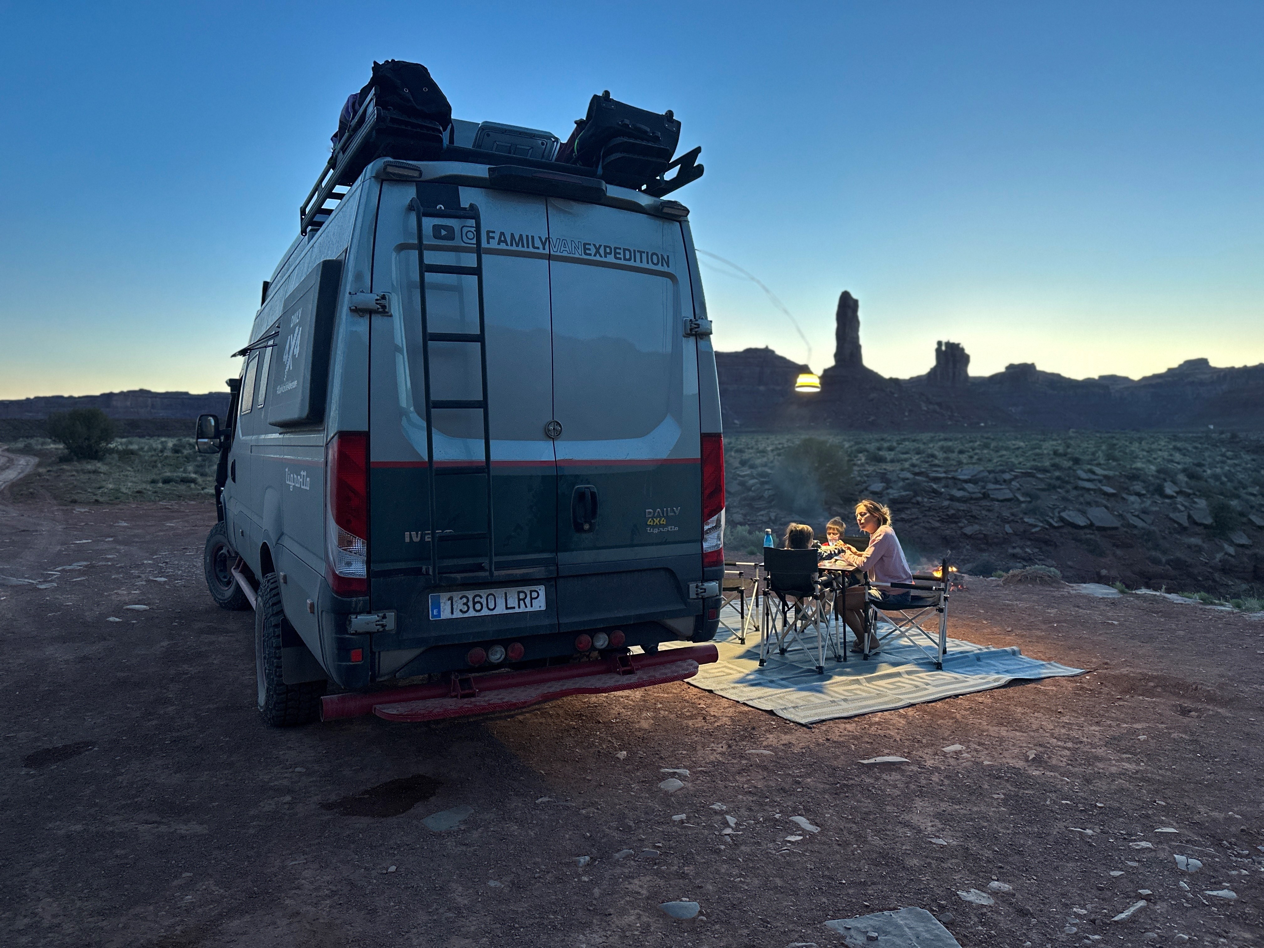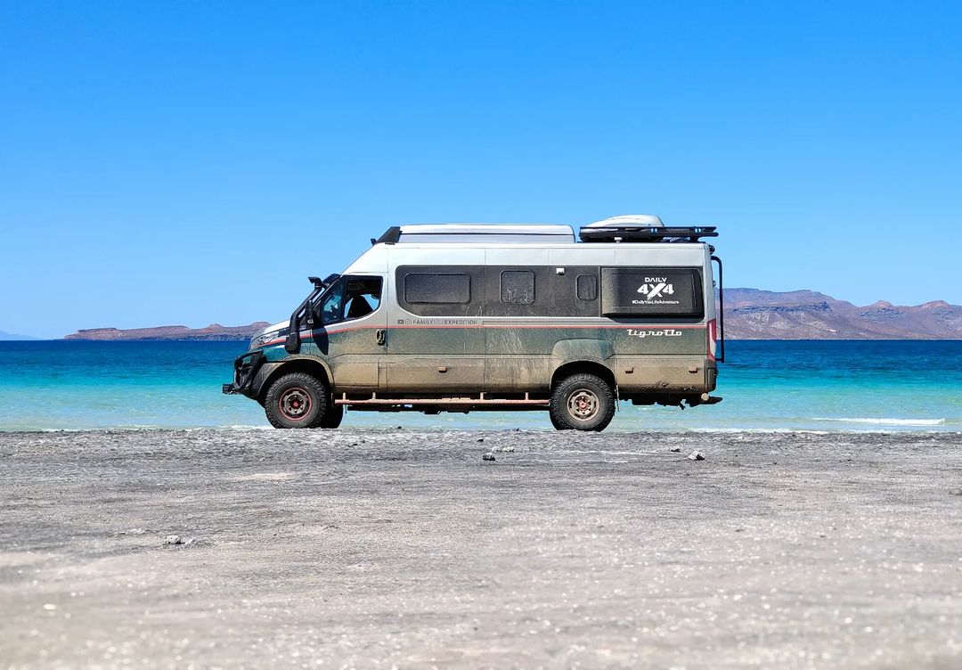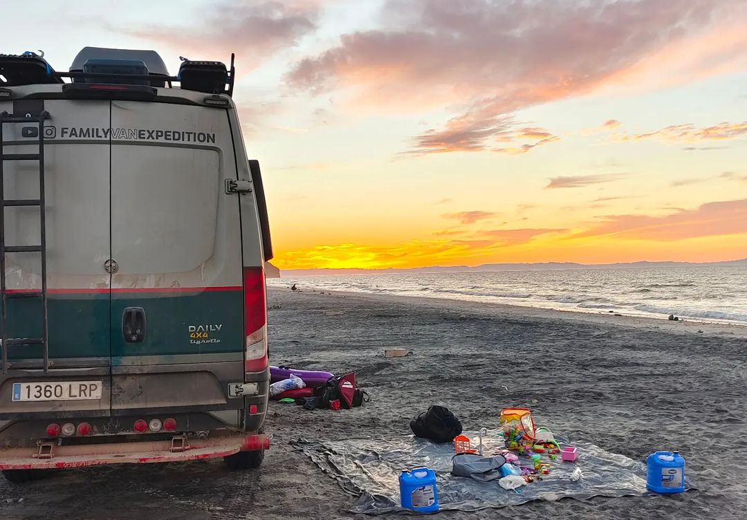 Hallo ihr alle. Wir sind „Family Van Expedition“. David ist Feuerwehrmann in Barcelona und professioneller Drohnenflieger. Mein Name ist Nuria und ich bin Profi-Kitesurferin und Content-Erstellerin. Zusammen mit unseren Kindern Koa (4) und Kaia (2) bereisen wir die Welt in unserem Expeditionsfahrzeug – einem IVECO Daily 4×4 von 2021 mit inzwischen 39.000 km auf dem Tacho.