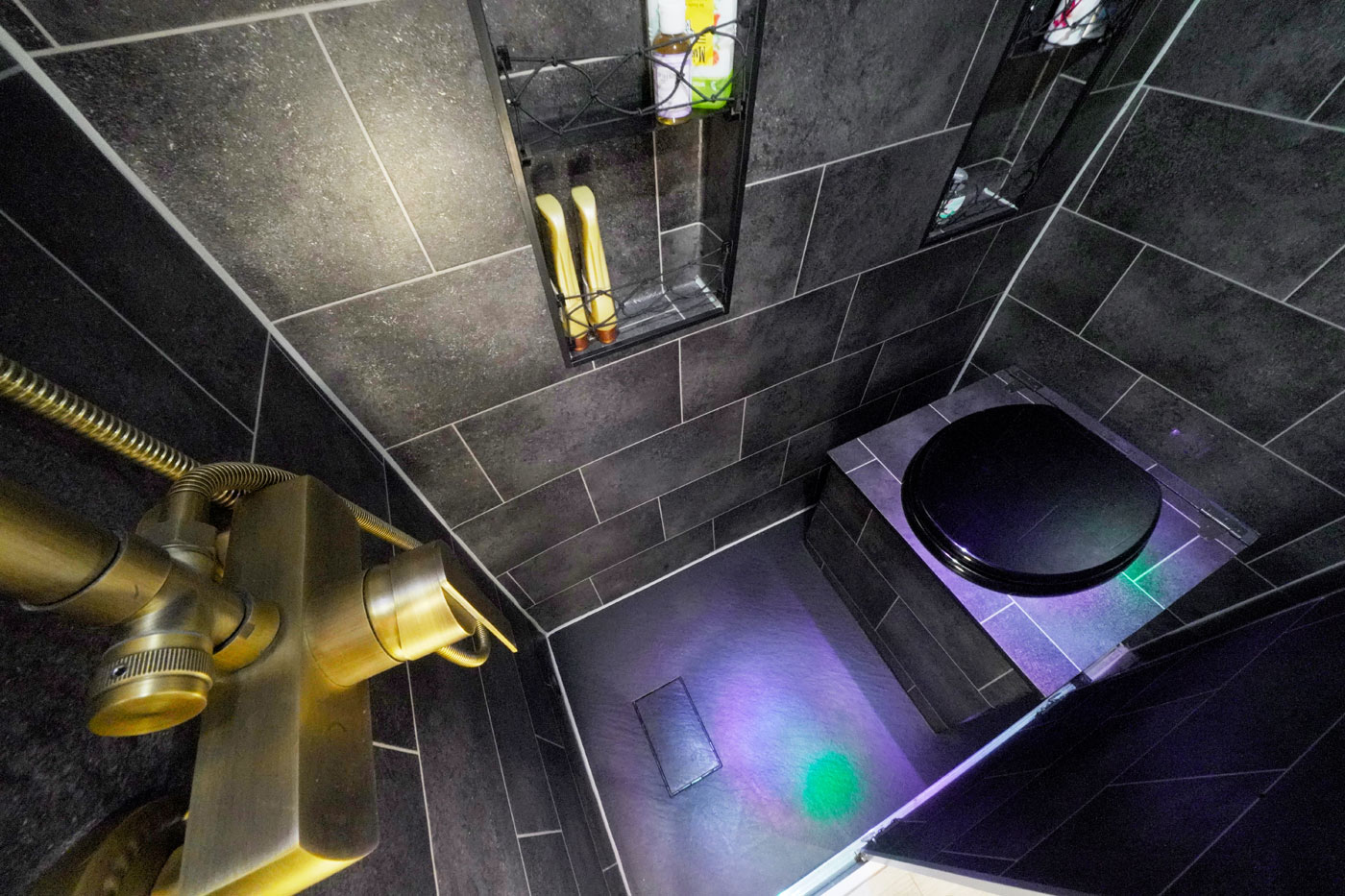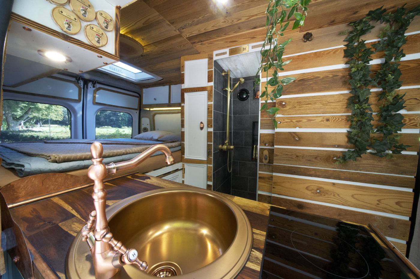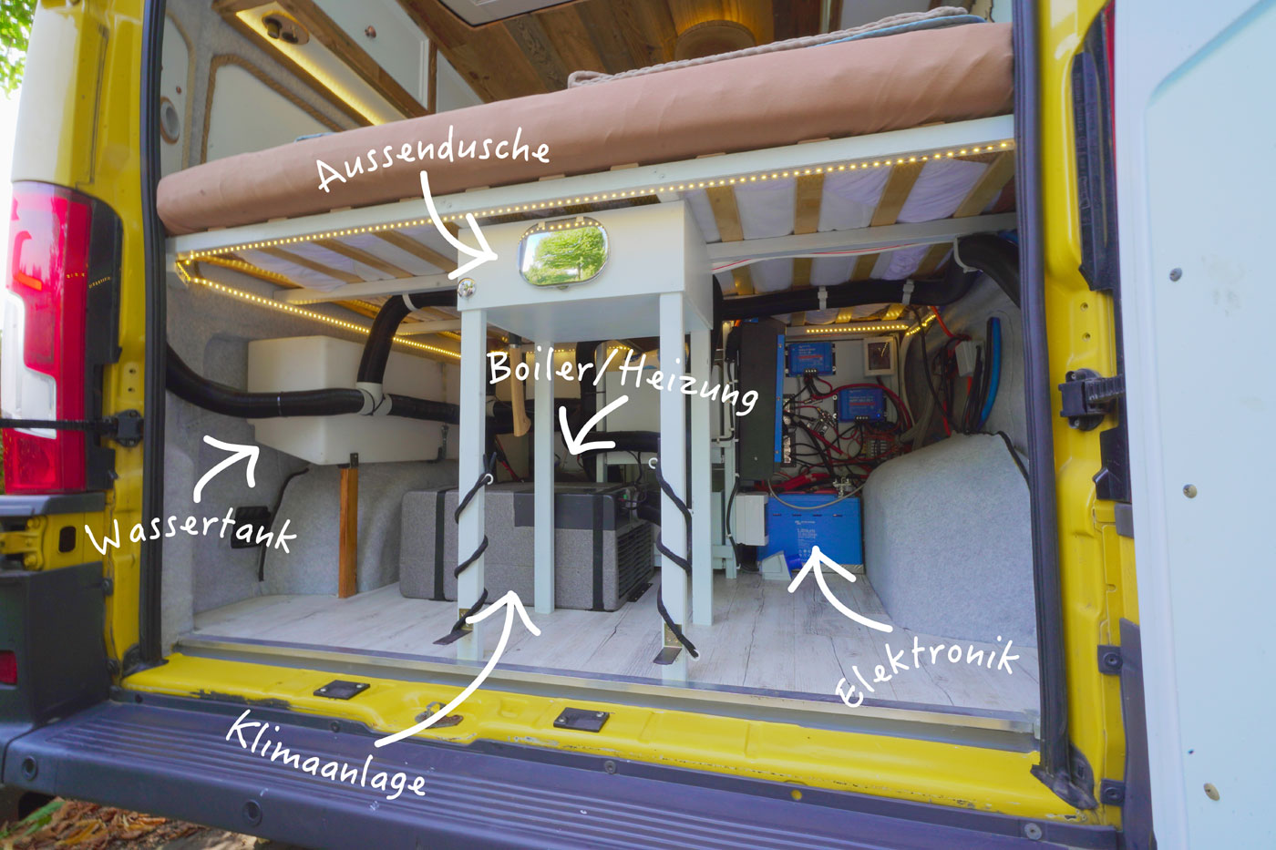 Wir haben eine Dusche, eine Trockentrenntoilette sowie ein Spülbecken in der Küche und eine Außendusche in unserem Van. Hierfür haben wir einen 100-Liter-Frischwasser-Radkasten-Tank unter dem Bett und einen 10-Liter-Warmwasser-Boiler, der mit Diesel (aus dem Fahrzeugkraftstofftank) oder 230V funktioniert. Unser Grauwassertank umfasst 30 Liter und befindet sich außerhalb des Fahrzeuges. Für den Urin haben wir separat einen 9,5-Liter-Behälter. Alle unsere Tanks (Frisch-, Grau- und Urin Tank) haben einen Füllstandsensor mit Anzeige-Display und können mit einem elektrischen Kugelhahn auf Knopfdruck oder manuell entleert werden