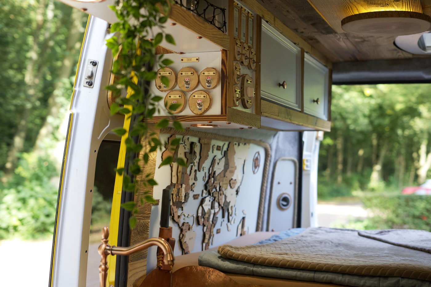 Eine kleine Besonderheit unseres Ausbaues ist für uns der Stil unseres Campervans. Wir hatten von Anfang an die Idee, in unserem Van mit den Farben Kupfer und dunklem Holz zu arbeiten – es sollte etwas Rustikales werden. Trotzdem wollten wir es im Van nicht zu dunkel haben, und haben uns dann für die Farbkombination Hellblau-Weiß entschieden, mit der wir unsere Möbel und Wände bestrichen haben. Für den Holz-Teil haben wir ein schönes recyceltes Altholz gefunden, und dieses für unsere komplette Decke und Details und Umrahmungen der Möbel verwendet. Das Kupferfarbene sticht in Form von Kupfernägel, Schrankgriffen, dem Wasserhahn, der Duscharmatur und dem Spülbecken raus. Mit unseren Kippschaltern und Beschriftungen haben wir zudem noch einen Touch Vintage in den Van gebracht.