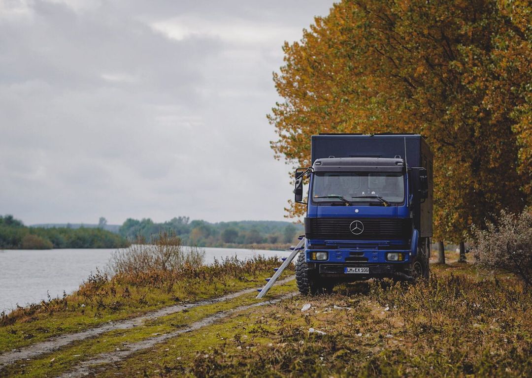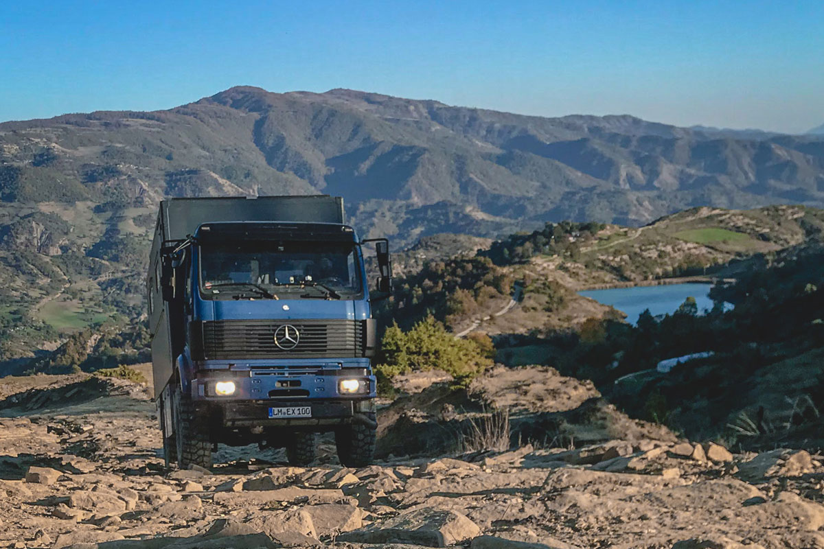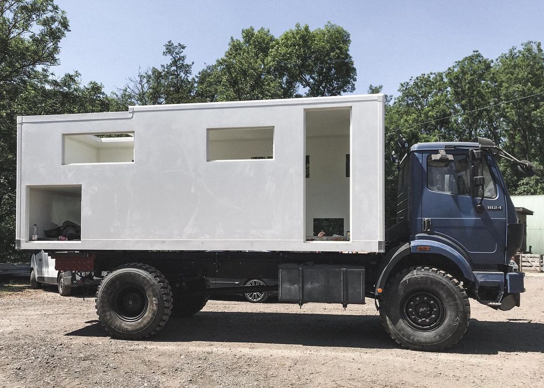 Zuerst haben wir uns einen reisefertigen MAN Kat1 gekauft. Im Gelände war er zwar unschlagbar, aber wir haben schnell gemerkt, dass er uns viel zu viel verbraucht. Dann haben wir ihn verkauft und nach einem anderen Fahrzeug Ausschau gehalten. Es hat lange gedauert, bis wir einen LKW gefunden haben, der in unseren Augen perfekt war – und mit einer großen Wohnkabine (mind. 5,5 Metern) klarkommt. Letztendlich haben wir im Januar 2020 einen Mercedes 1824 einer Öl-Raffinerie mit Pritsche und Kran gekauft. Und bis jetzt sind wir mit unserer Entscheidung sehr zufrieden.