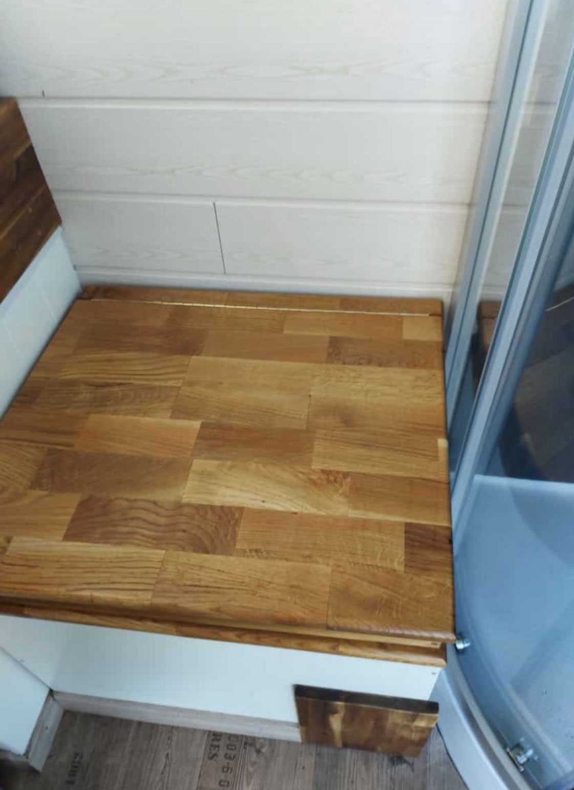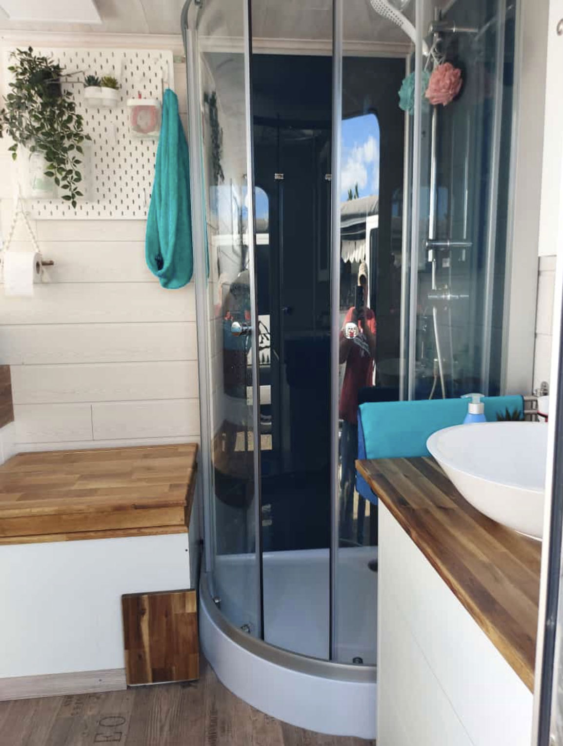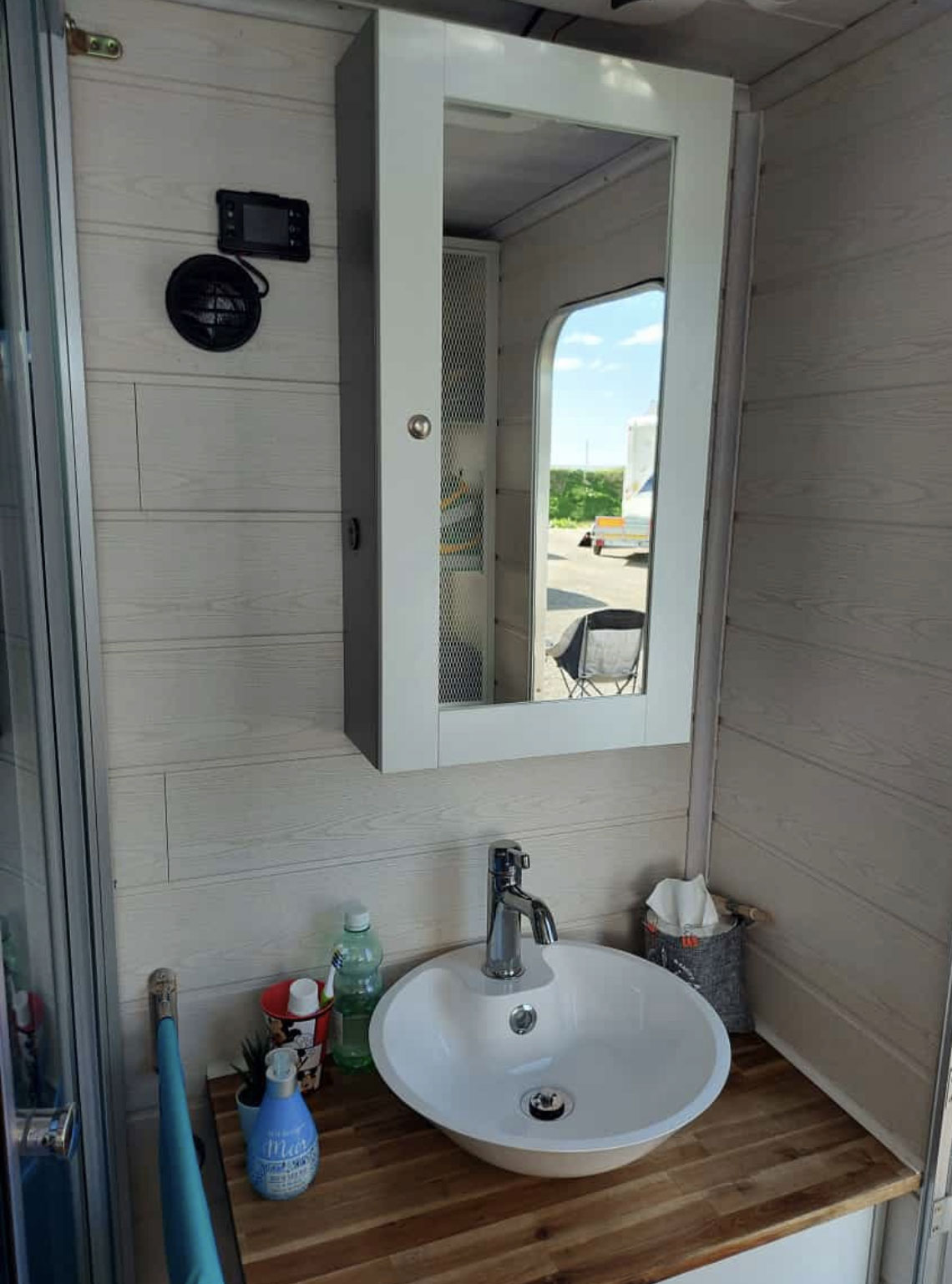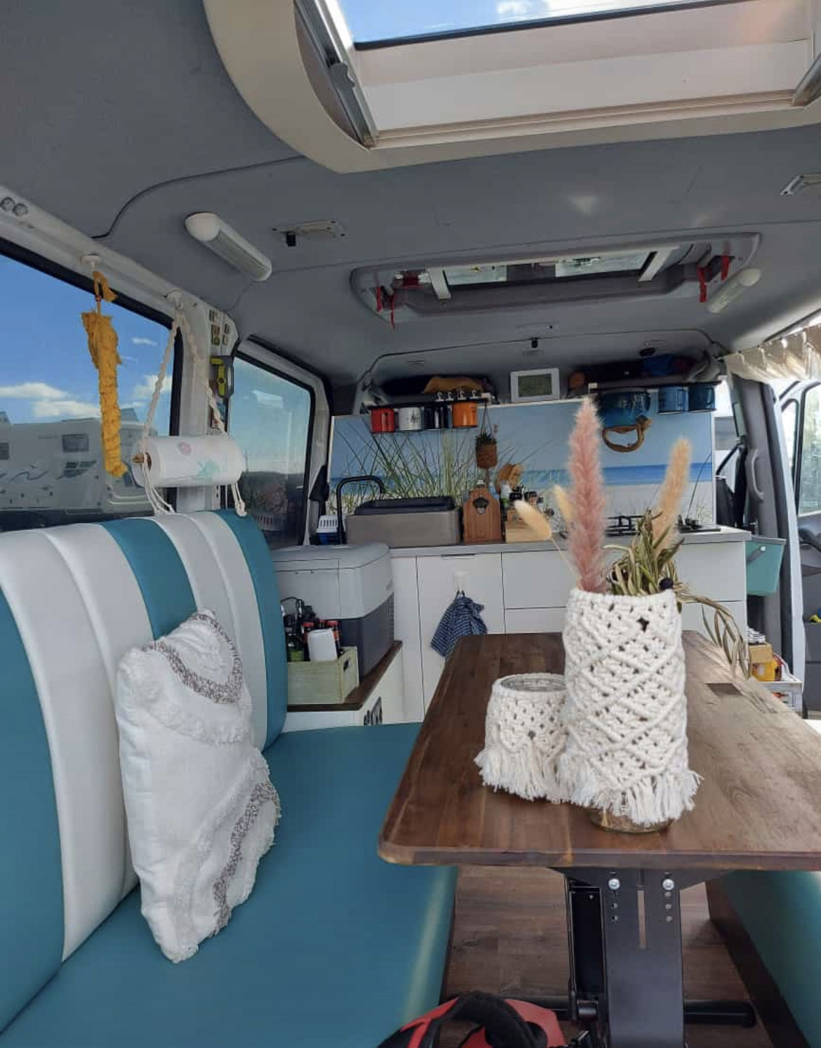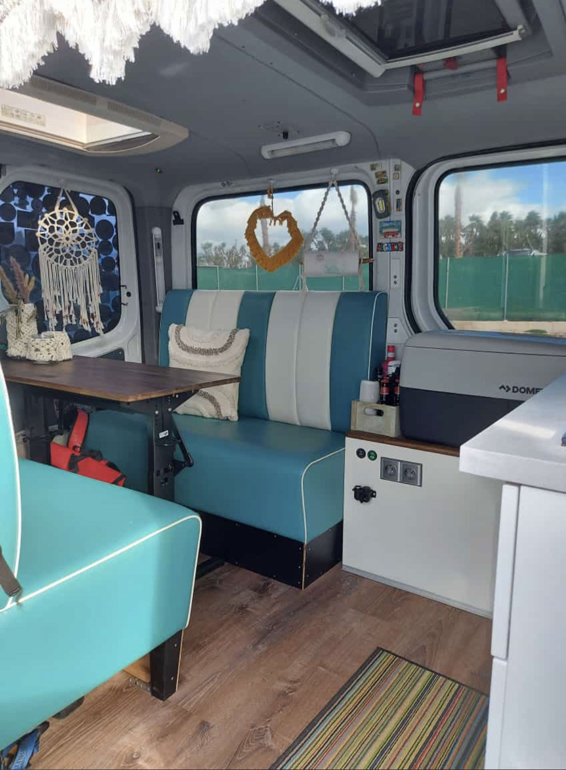 Verbaut wurde unter anderem eine neue Küche mit einem Aufsatzwaschbecken, dem wiederverwendeten Gasherd, einer 12V Kühlbox, sowie zwei Sitzbänke mit Tisch im American Diner Look. Im Anhänger sind eine Komplettdusche, eine Trockentrenntoilette, ein Waschtisch mit Spiegelschrank, diverse Hängeschränke und ein großes Bett untergebracht.