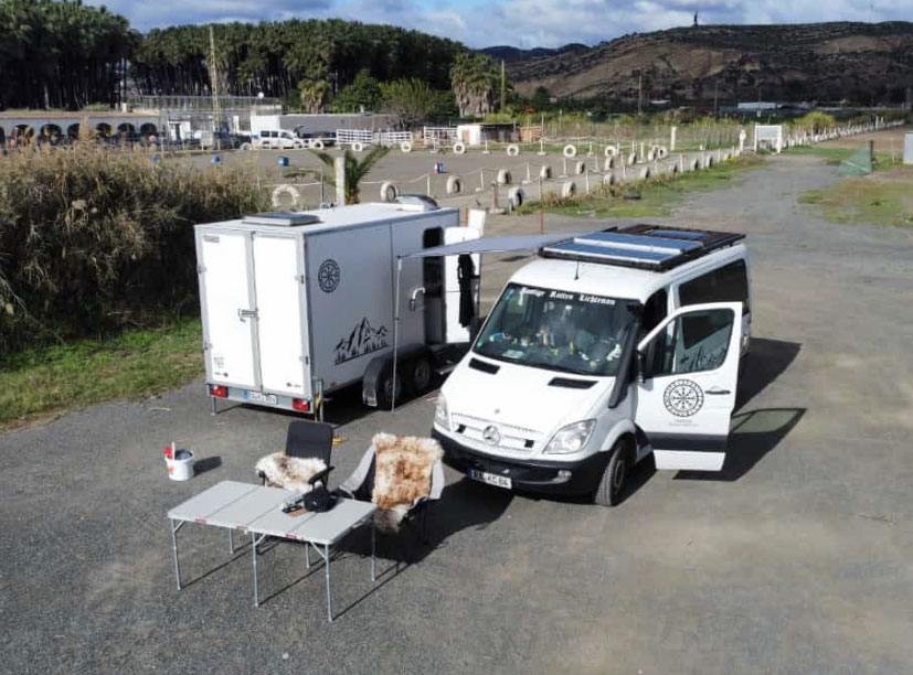 Der große Vorteil dieses Gespanns ist, dass man den Anhänger abstellen kann und mit dem Sprinter in jeder kleineren Stadt oder dergleichen fahren und auf jedem Parkplatz parken kann. Zudem hat man aber die Größe und den Platz eines größeren Wohnmobils.