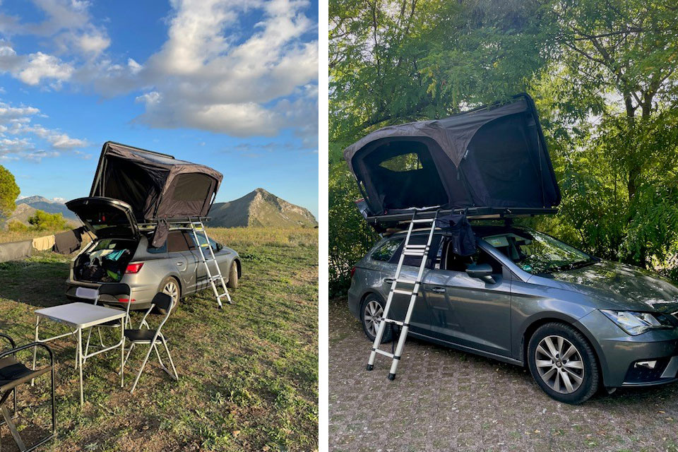 Auf Reisen gehen wir mit unserem Seat Leon Kombi (Diesel, Automatik) und einem qeedo Freedom Slim L-Dachzelt. Unser Leon ist echt ein Alleskönner und hat uns schon als Familienkutsche und Umzugshelfer große Dienste erwiesen. Das große Platzangebot kommt uns natürlich auf unseren Reisen zu Gute. Und da die hinteren Scheiben getönt sind, kann man auch nicht ganz so einfach hineinschauen.