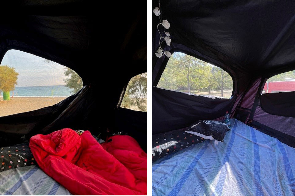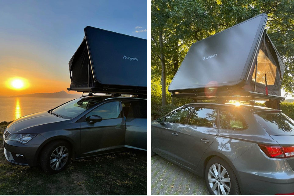 Das qeedo Freedom Slim L ist ein Hartschalen-Dachzelt mit einer Liegefläche von 1,40 Meter. Das riecht uns völlig aus und zudem passt es super auf den Leon. Das Aufbauen geht super schnell und einfach mit wenigen Handgriffen. Durch die vielen Fenster ist es super schön hell im Dachzelt und auch die Staumöglichkeiten gefallen uns. Zusätzlich zum Dachzelt haben wir uns noch ein Tarp von qeedo gekauft, dass wir am Zelt befestigen können. Somit haben wir auch einen guten Sonnen- und Regenschutz.