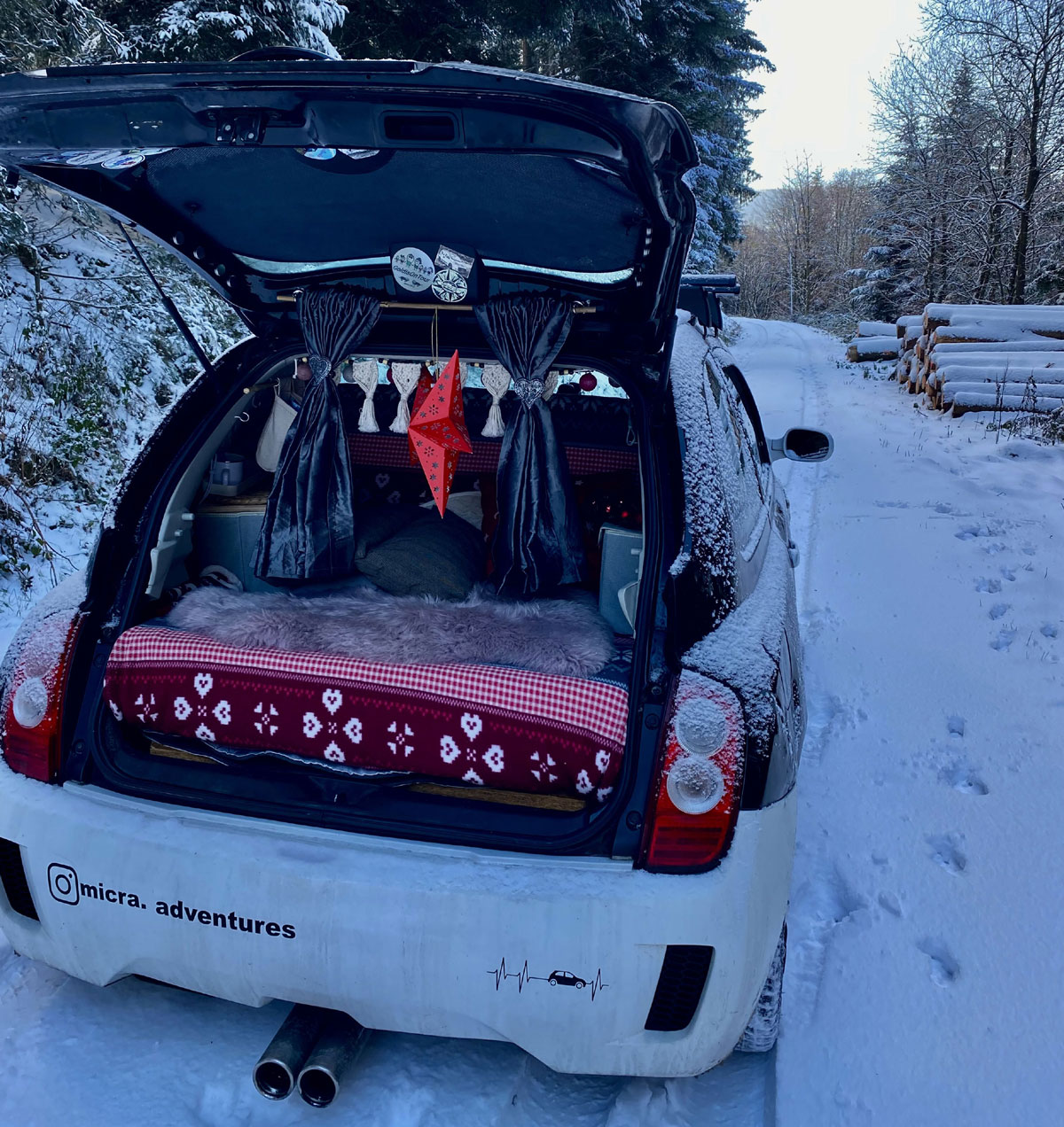 Hi, ich bin Mo von Micra.Adventures und wohne im schönen Nordschwarzwald. Dort habe ich zwar noch eine Wohnung, aber im Grunde lebe ich die meiste Zeit in meinem voll ausgestatteten Nissan Micra K12 von 2008 mit 220.000 Km auf dem Tacho. Das besondere an Billy – so heißt mein Micro-Camper – ist natürlich, dass er als Kleinwagen zu einem autarken Camper umgebaut wurde. Billy hat eine Kompressor Kühlbox, Powerbanks, Frischwasser-Vorrat, eine Toilette und eine „Dusche“. Alles in allem kann ich ca. 1,5 Wochen autark stehen. Man glaubt kaum, wieviel Platz der Micra bietet. Nachdem ich den Beifahrersitz noch ausgebaut habe, ist es geradezu luxuriös ☺️