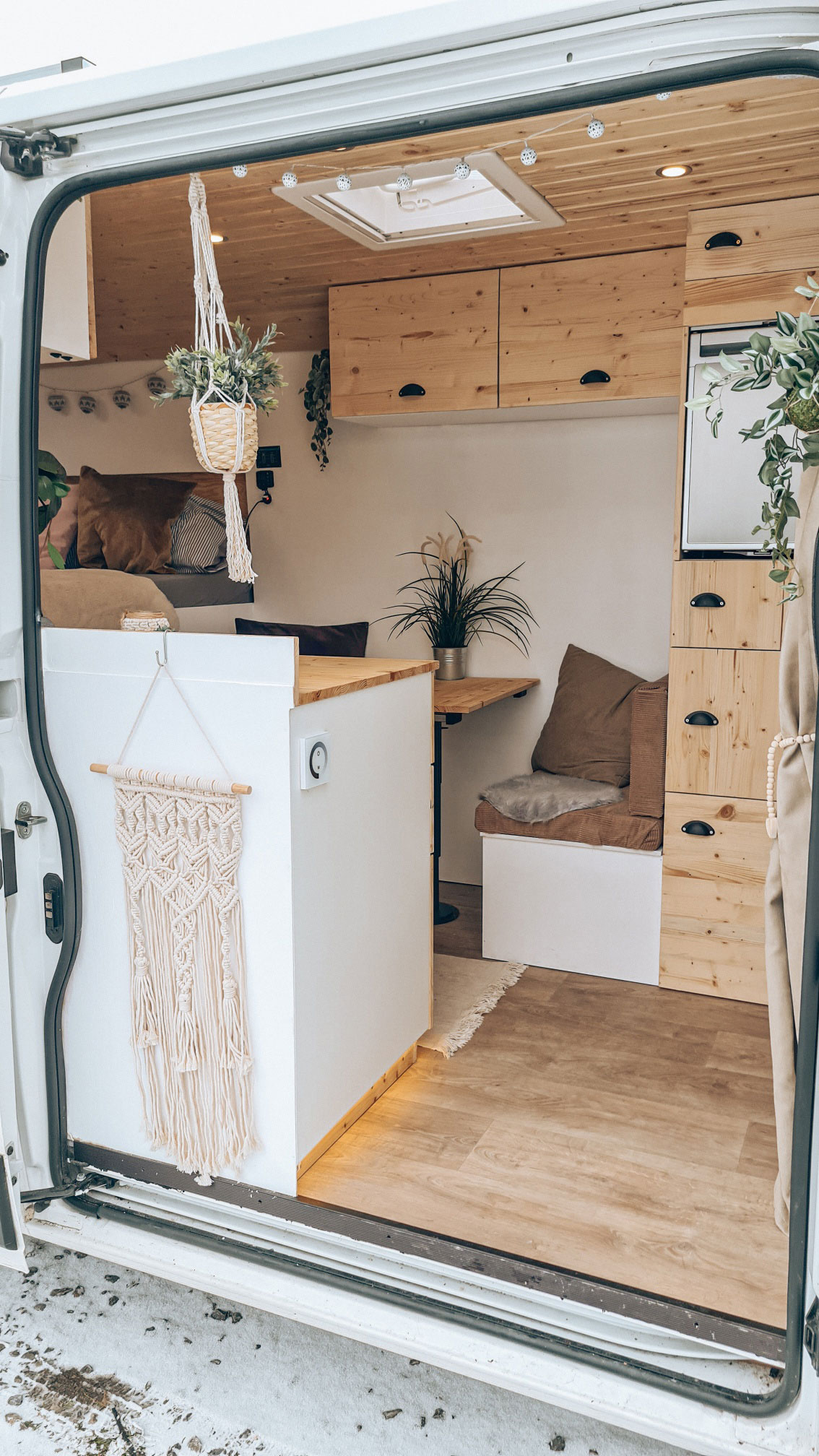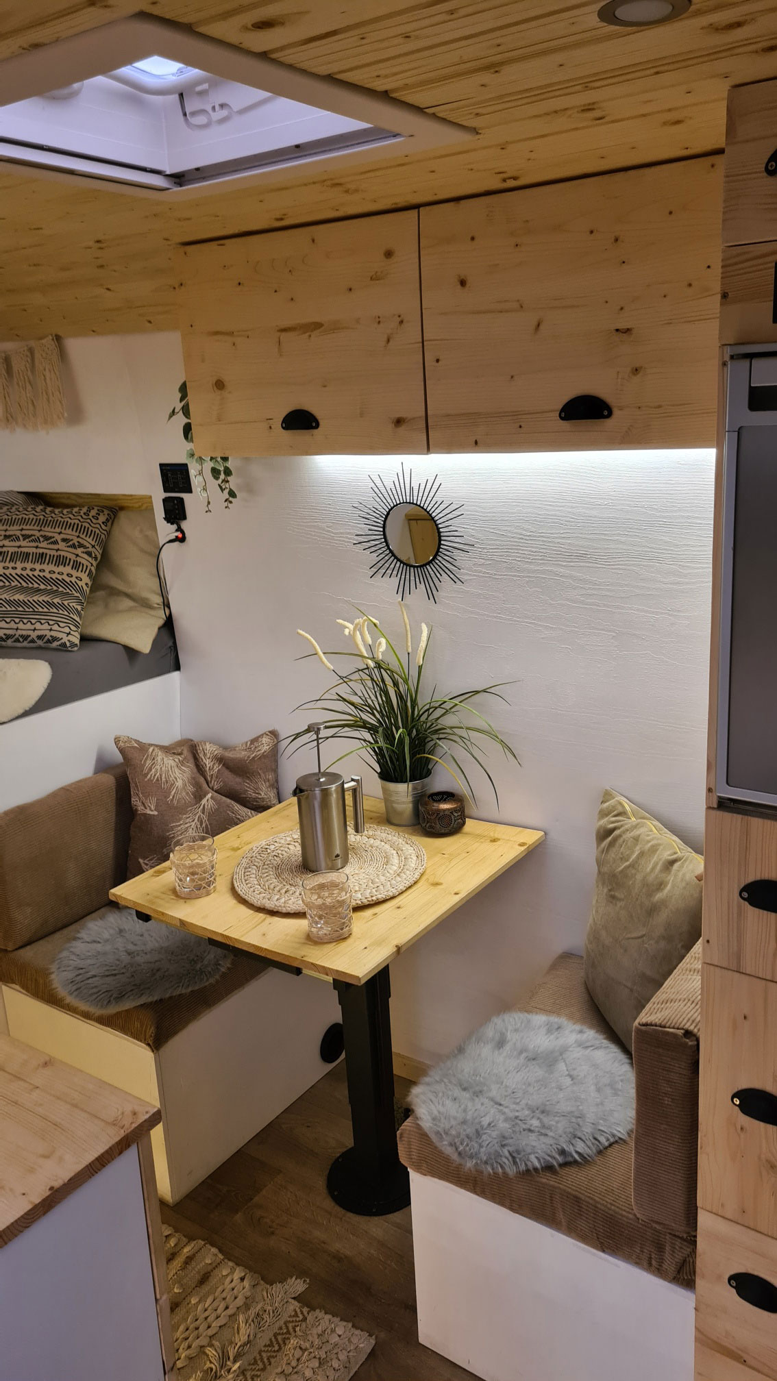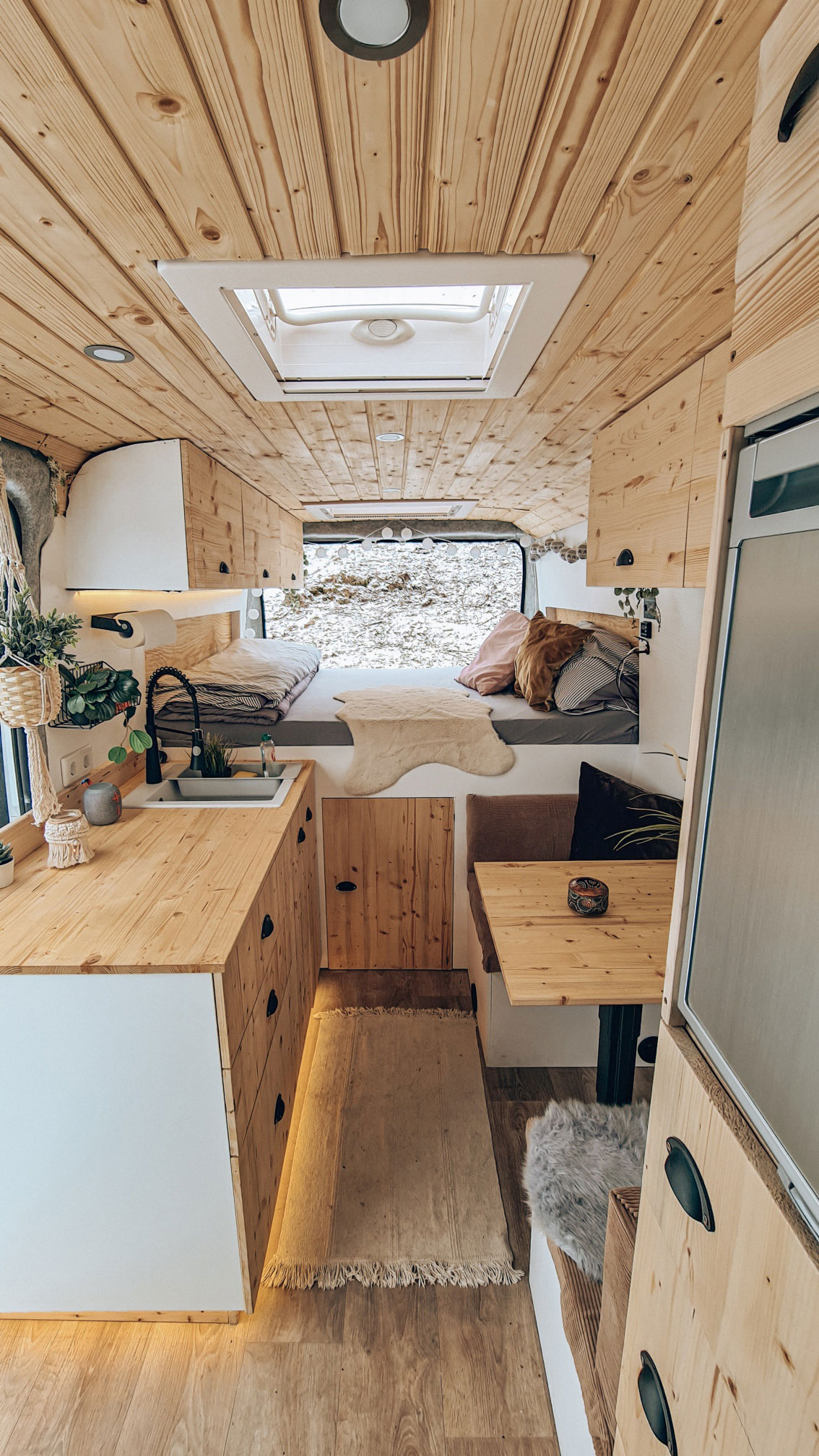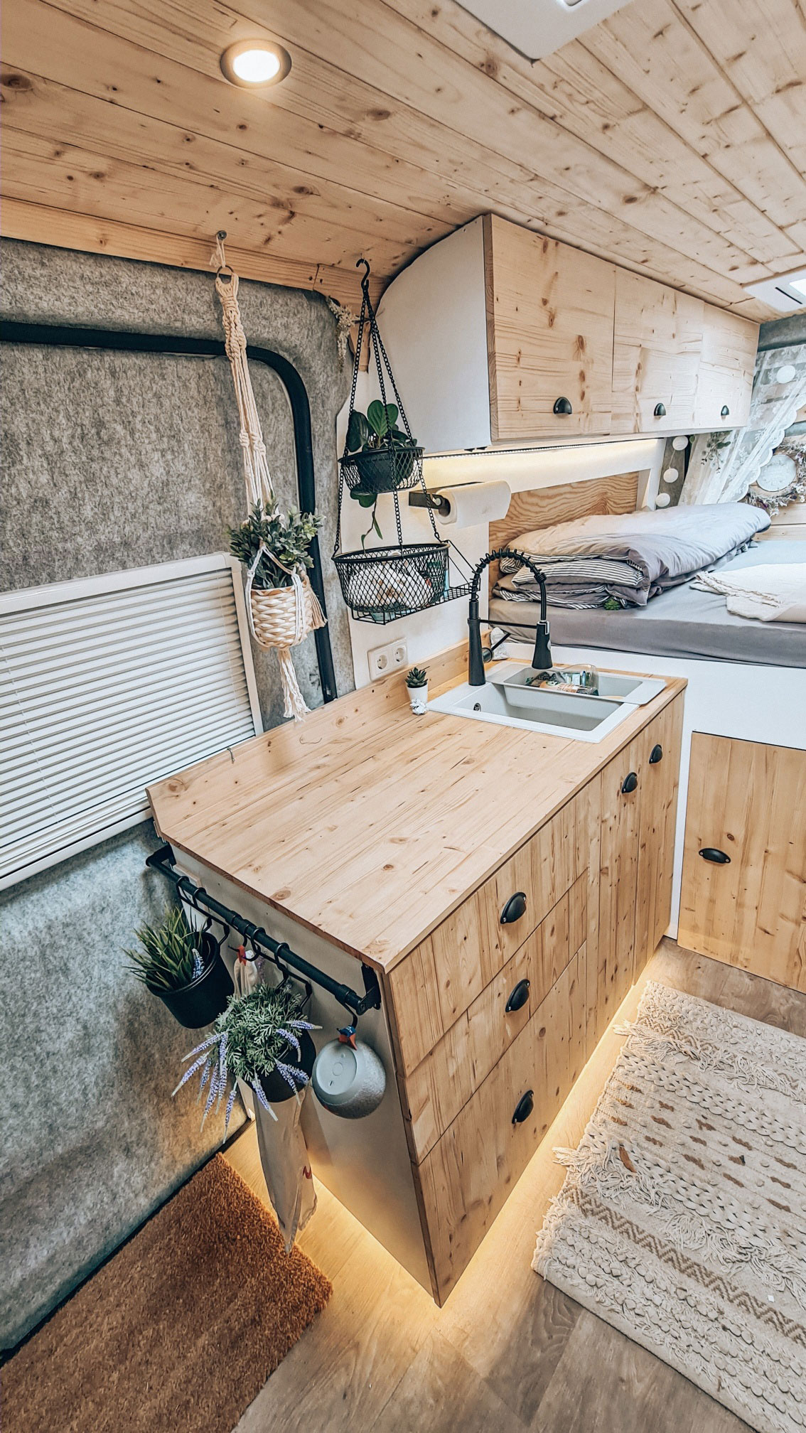 Wir haben ein großes und ein kleines Dachfenster verbaut, was sich mit dem Seitenfenster an der Schiebetür super ergänzt. Da es auch schon unser 2. Van ist, haben wir uns dieses Mal dazu entschieden, eine Ikea Küche einzubauen, mit der wir sehr zufrieden sind. Wir haben beim Ausbau viel Wert auf ein natürliches Design gelegt und daher sieht man bei uns auch viel Holzoptik zusammen mit weißen Wänden. Als nächstes wollen wir unseren Van von außen noch folieren.