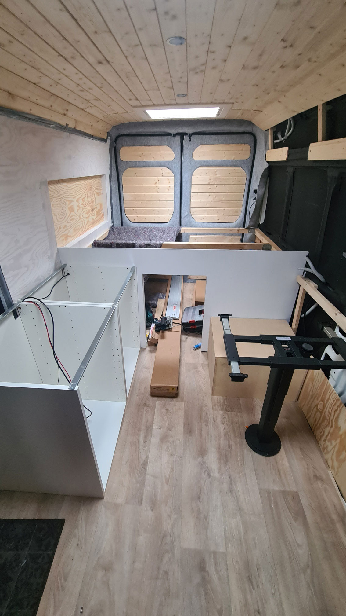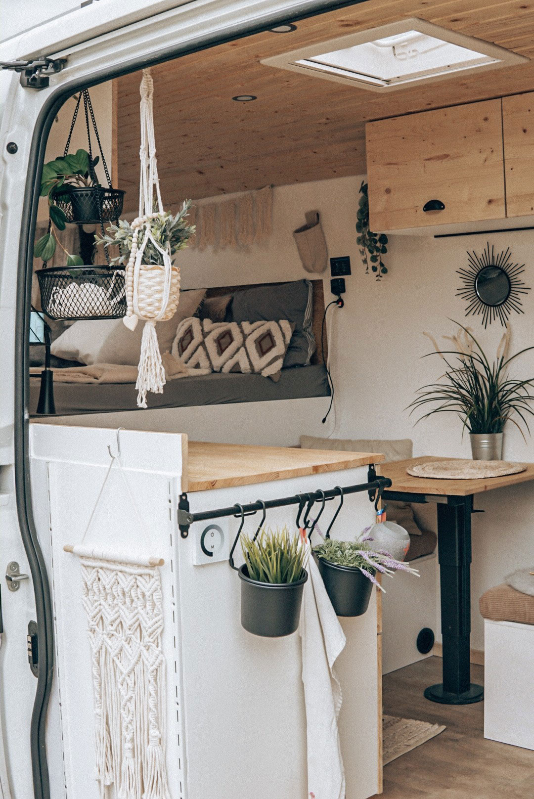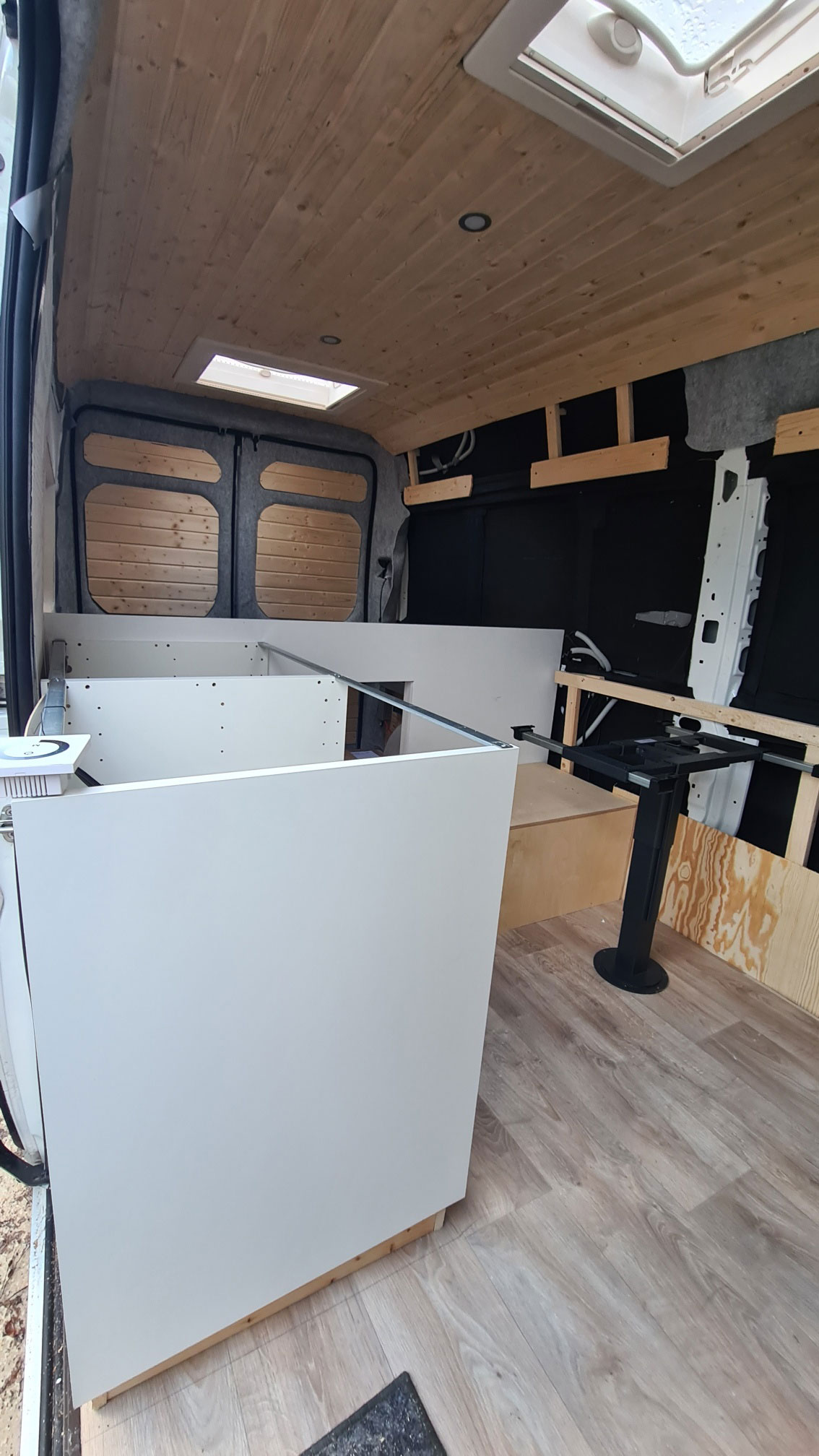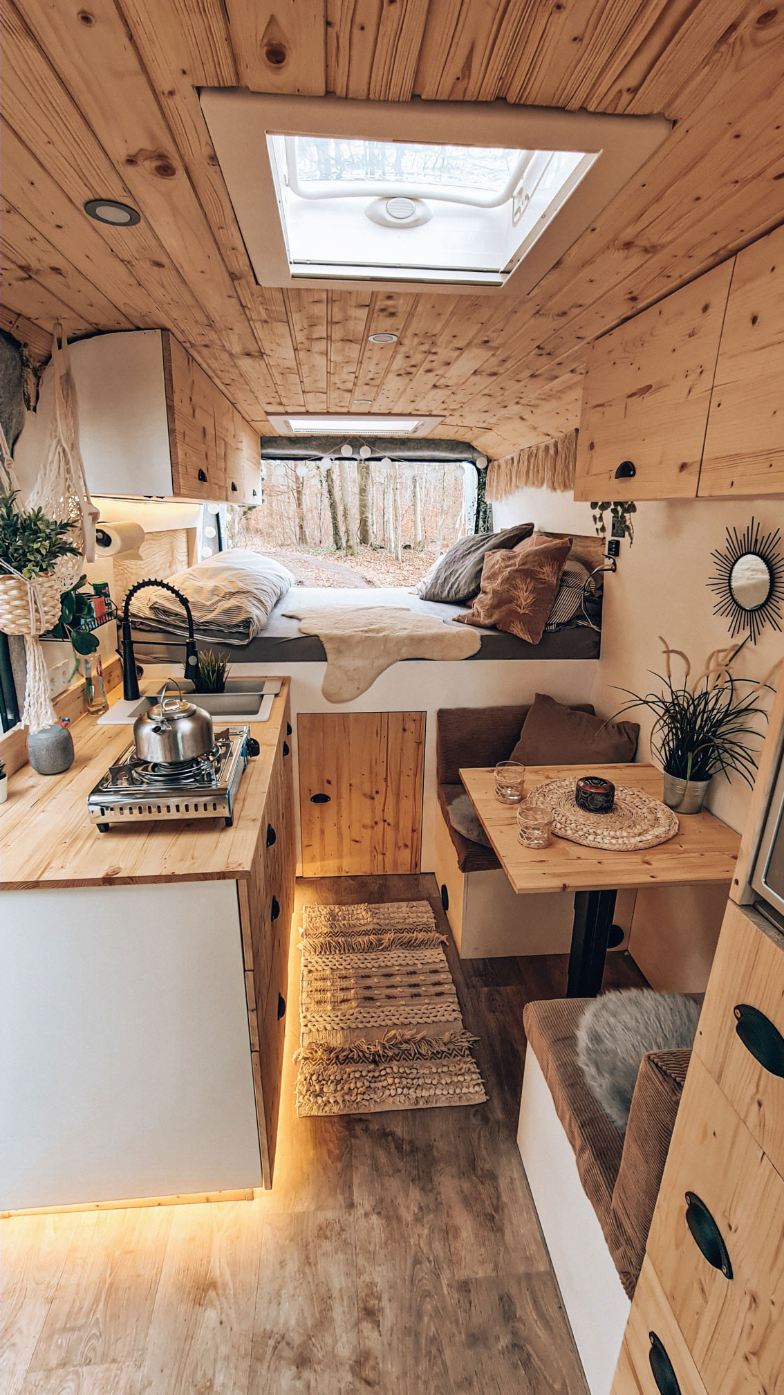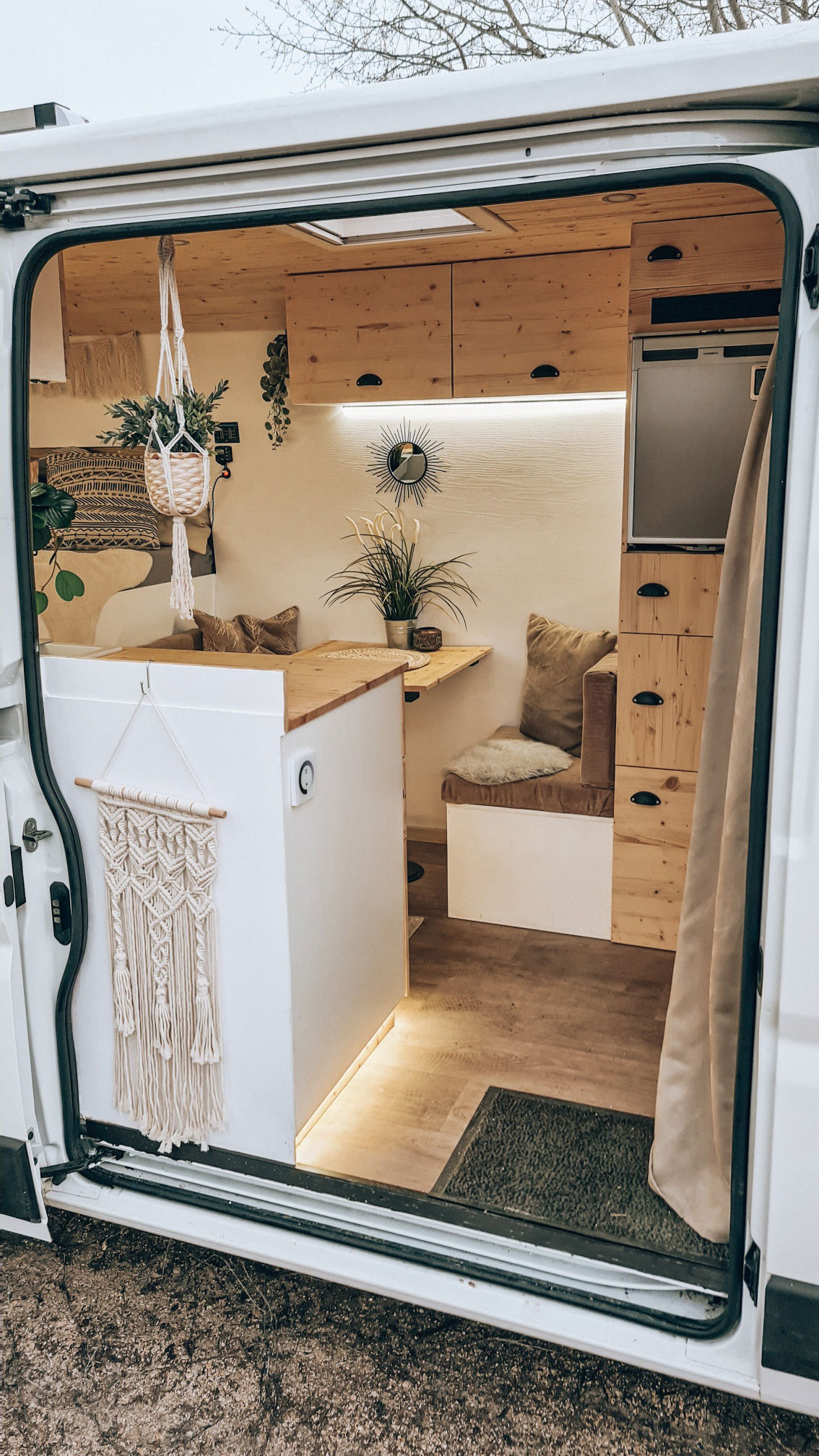 Wir haben ein großes und ein kleines Dachfenster verbaut, was sich mit dem Seitenfenster an der Schiebetür super ergänzt. Da es auch schon unser 2. Van ist, haben wir uns dieses Mal dazu entschieden, eine Ikea Küche einzubauen, mit der wir sehr zufrieden sind. Wir haben beim Ausbau viel Wert auf ein natürliches Design gelegt und daher sieht man bei uns auch viel Holzoptik zusammen mit weißen Wänden. Als nächstes wollen wir unseren Van von außen noch folieren.