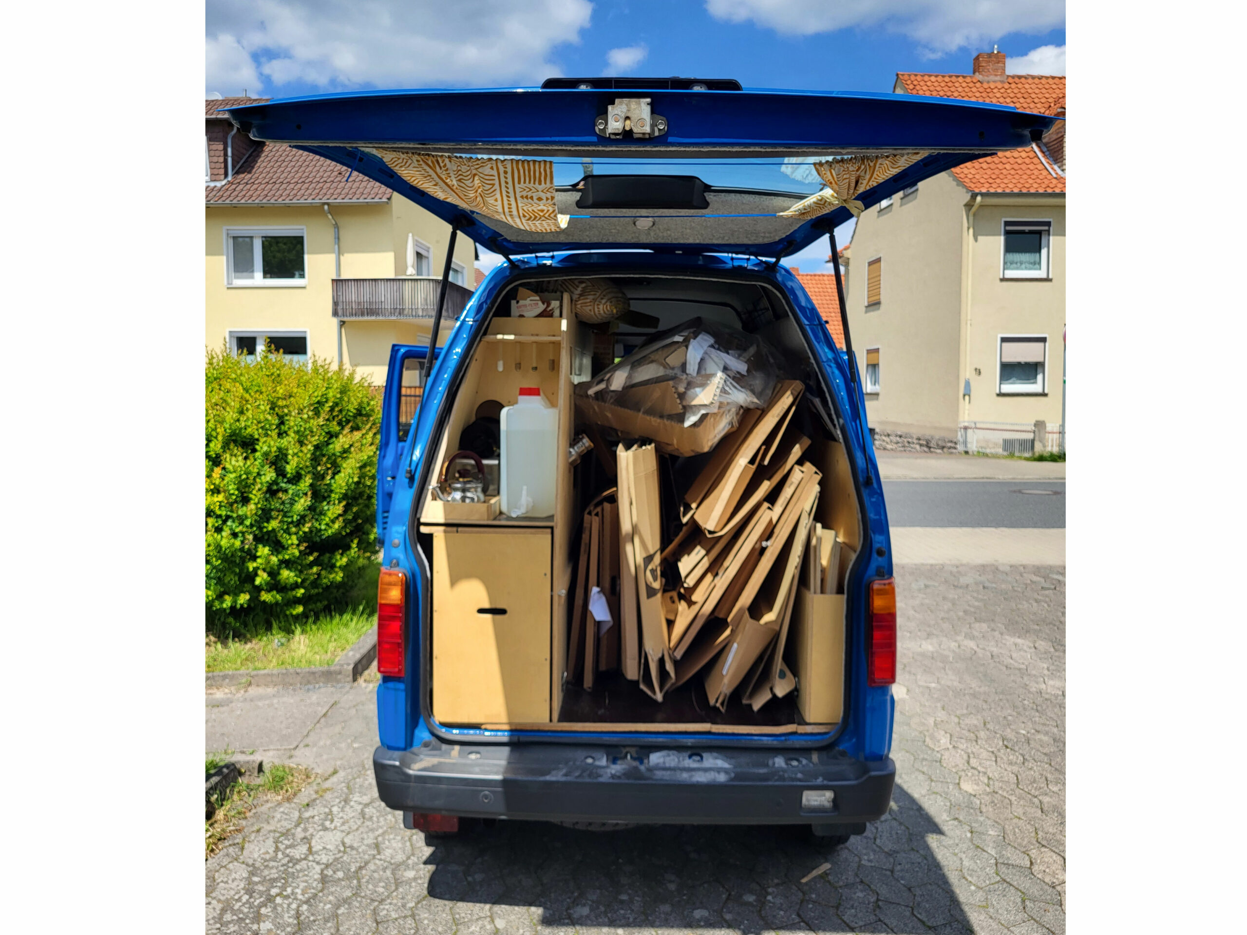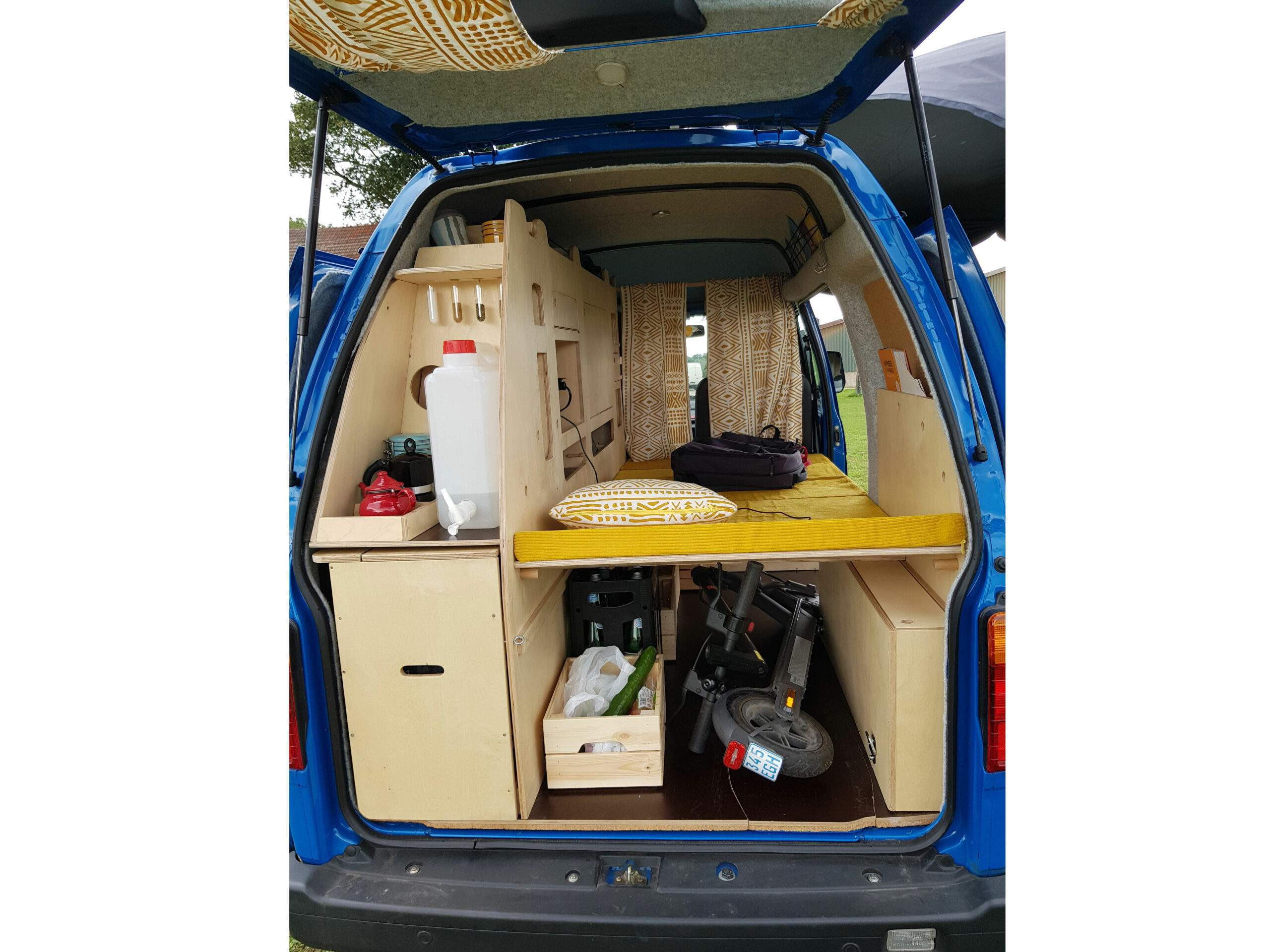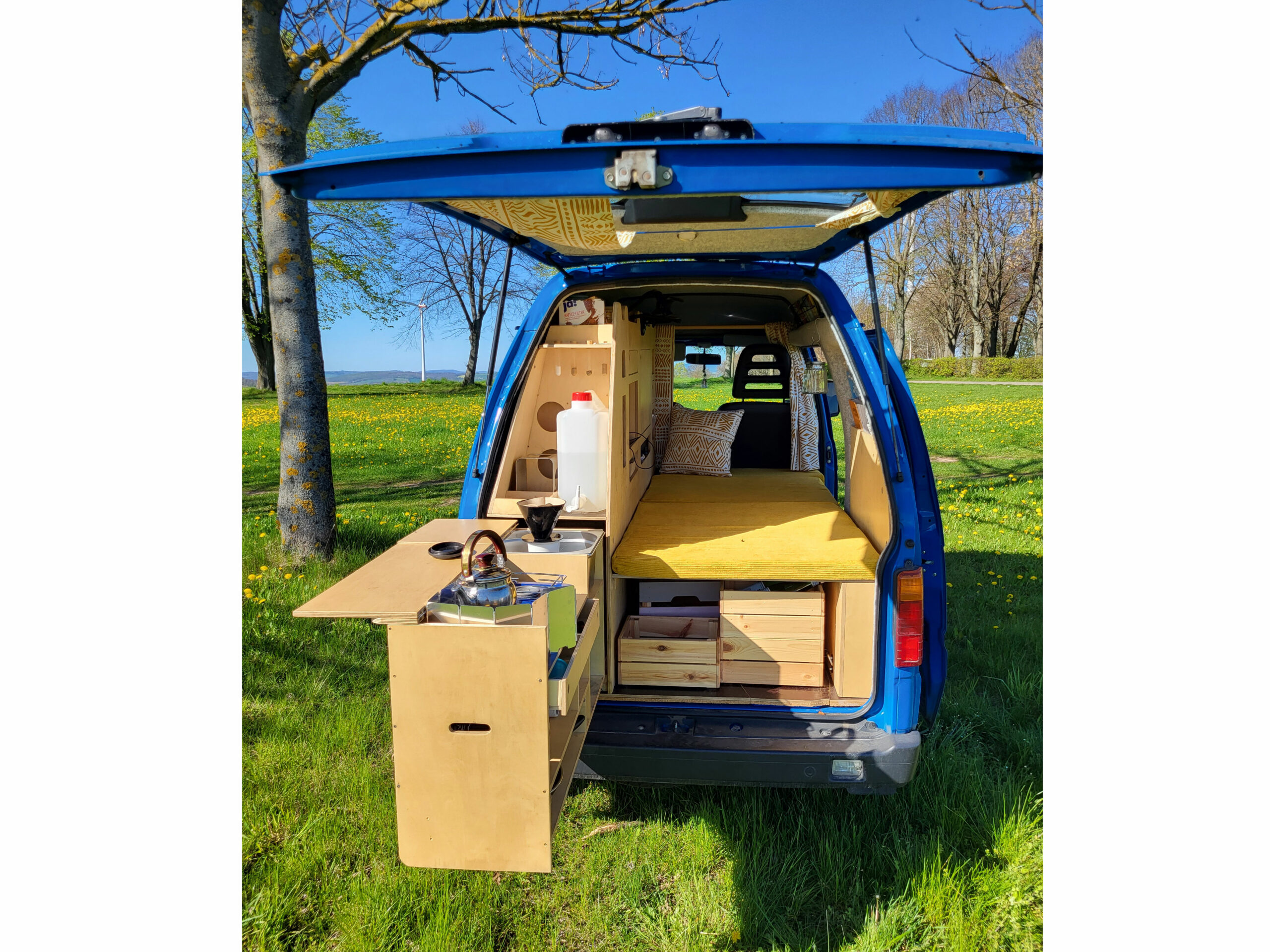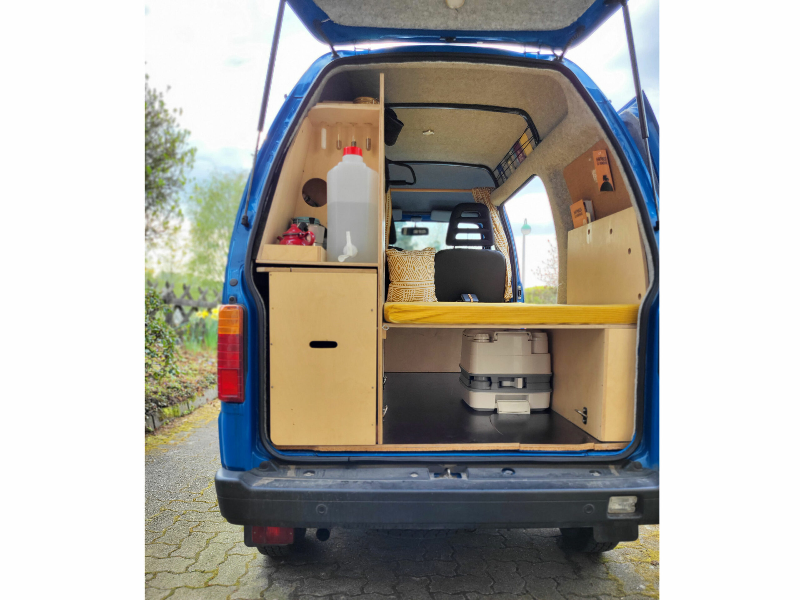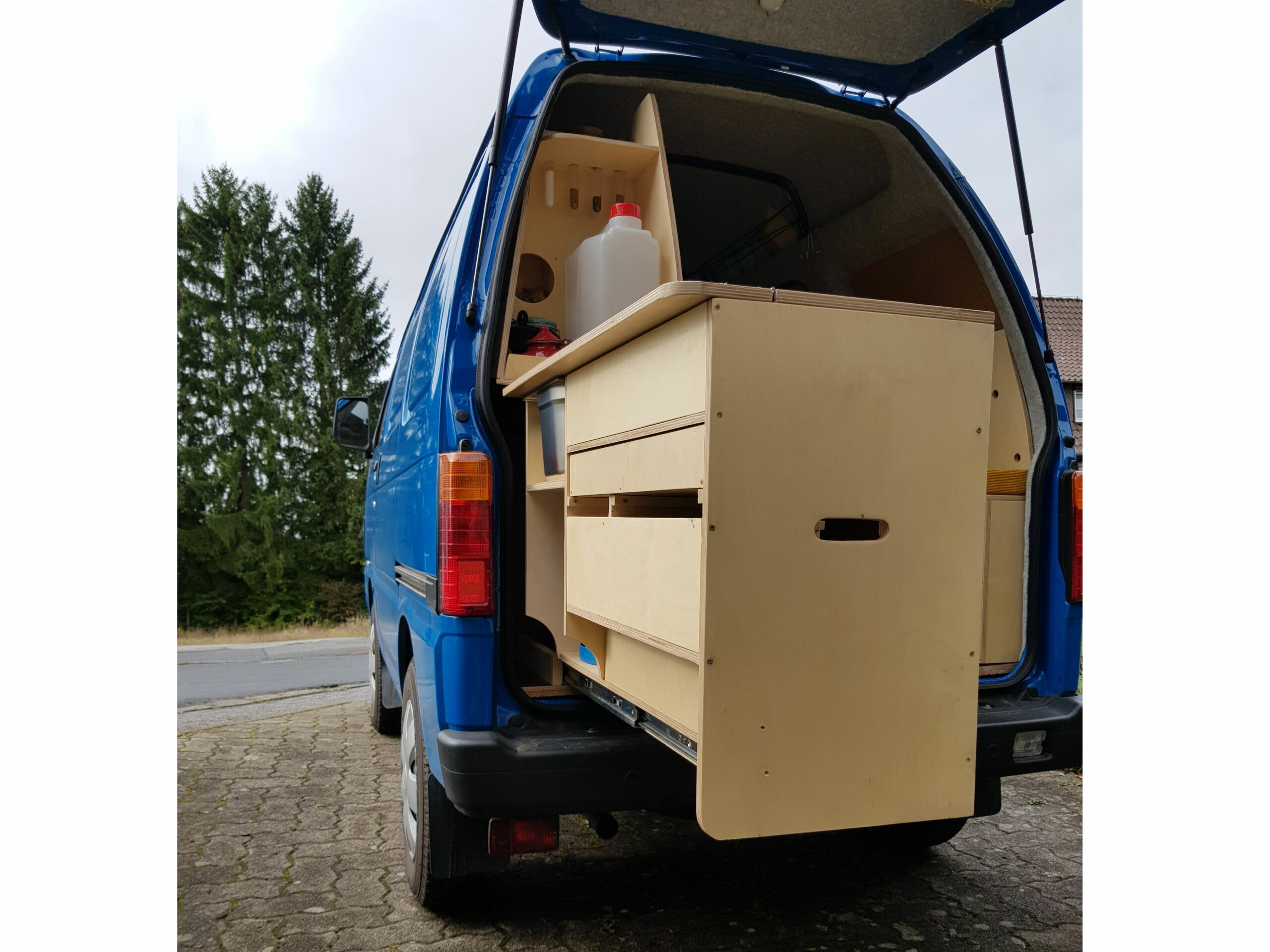 Das Konzept heißt „minimal mobil“. Verbaut sind ausschließlich Holz (Multiplex Birke 12&9mm) und Metall (Schrauben, Klavierbänder, Spüle etc.). Der Ausbau besteht aus einem Multifunktionsregal, das in alle möglichen Szenarien geklappt oder ggf. auch zurückgebaut werden kann, so dass Purzel bei Bedarf auch wieder als Transporter dienen kann.