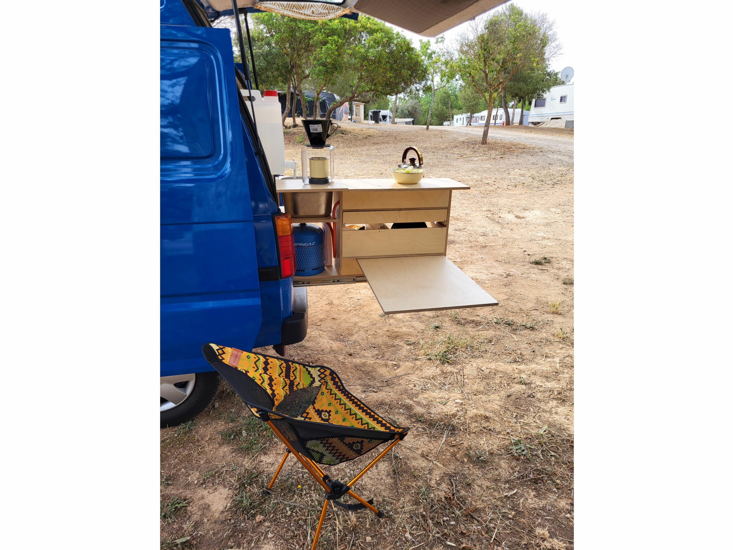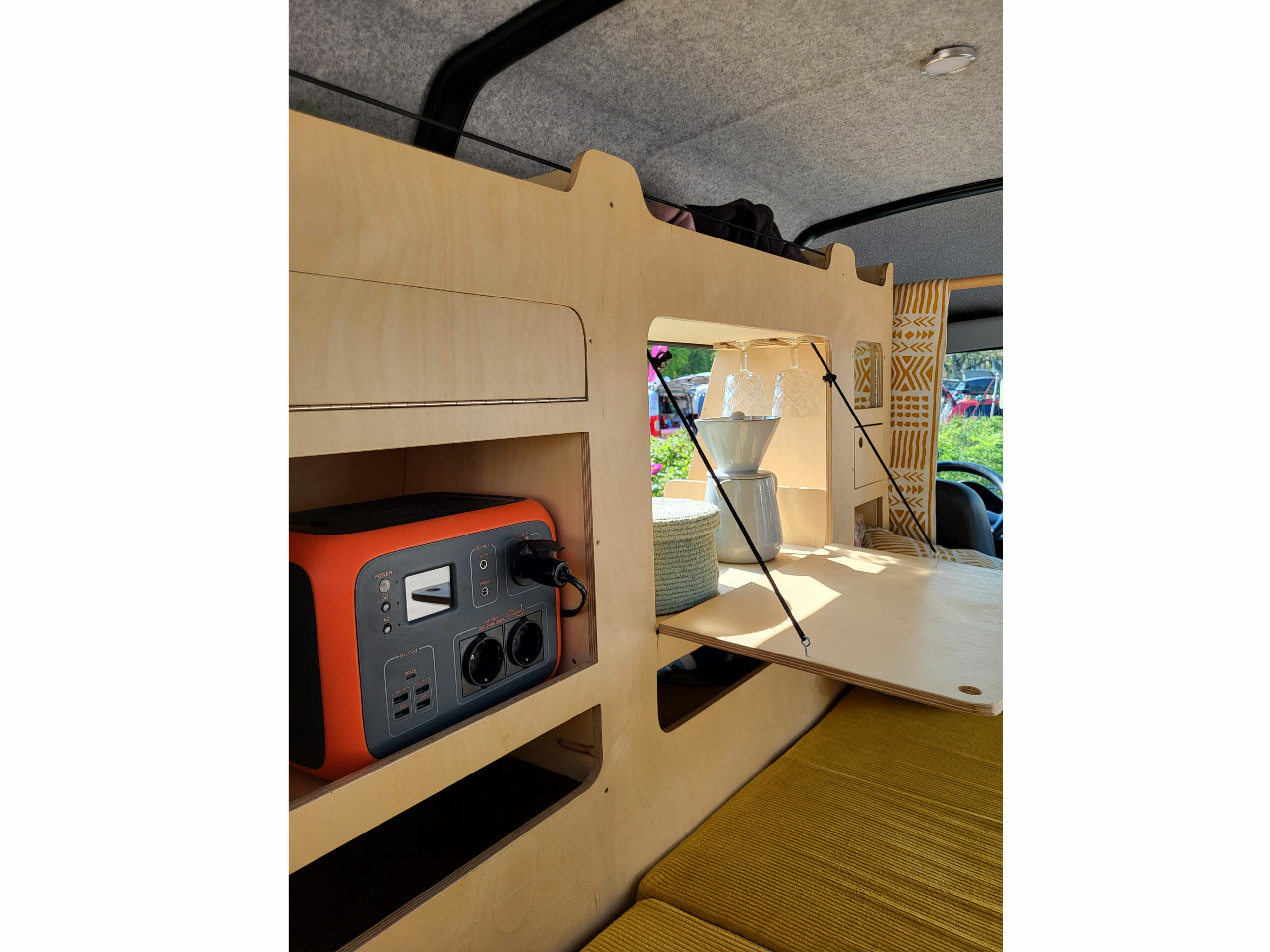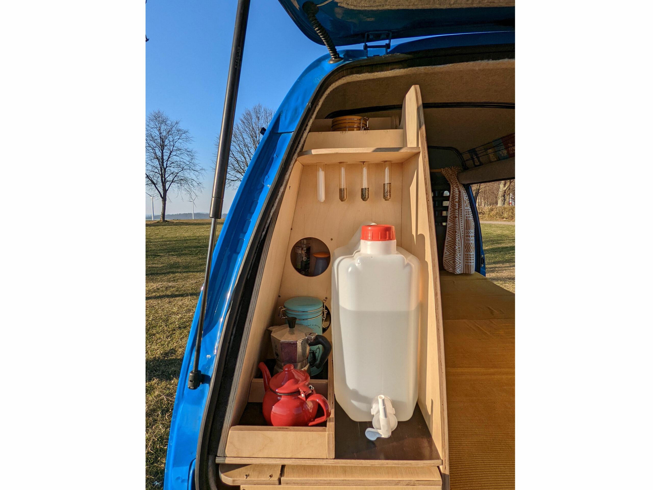 In meiner Küche ist das Wichtigste mein Kaffeefilter nebst -halter – und eine Bialetti, falls das Filterpapier ausgeht. Ich liebe Filterkaffee. Ansonsten koche ich gerne auf meinem Zweiflammenkocher… ein ganz einfaches Modell. Im Innenraum sind zwei LED-Lampen verbaut, die die Küche (bei offener Heckklappe) und den Innenraum beleuchten. Diese Beleuchtung nutze ich allerdings selten. Im Innenraum genügen mir meist das indirekte Licht der Powerbox (Lampe auf der Rückseite) und meine kleine LED-Lichterkette.