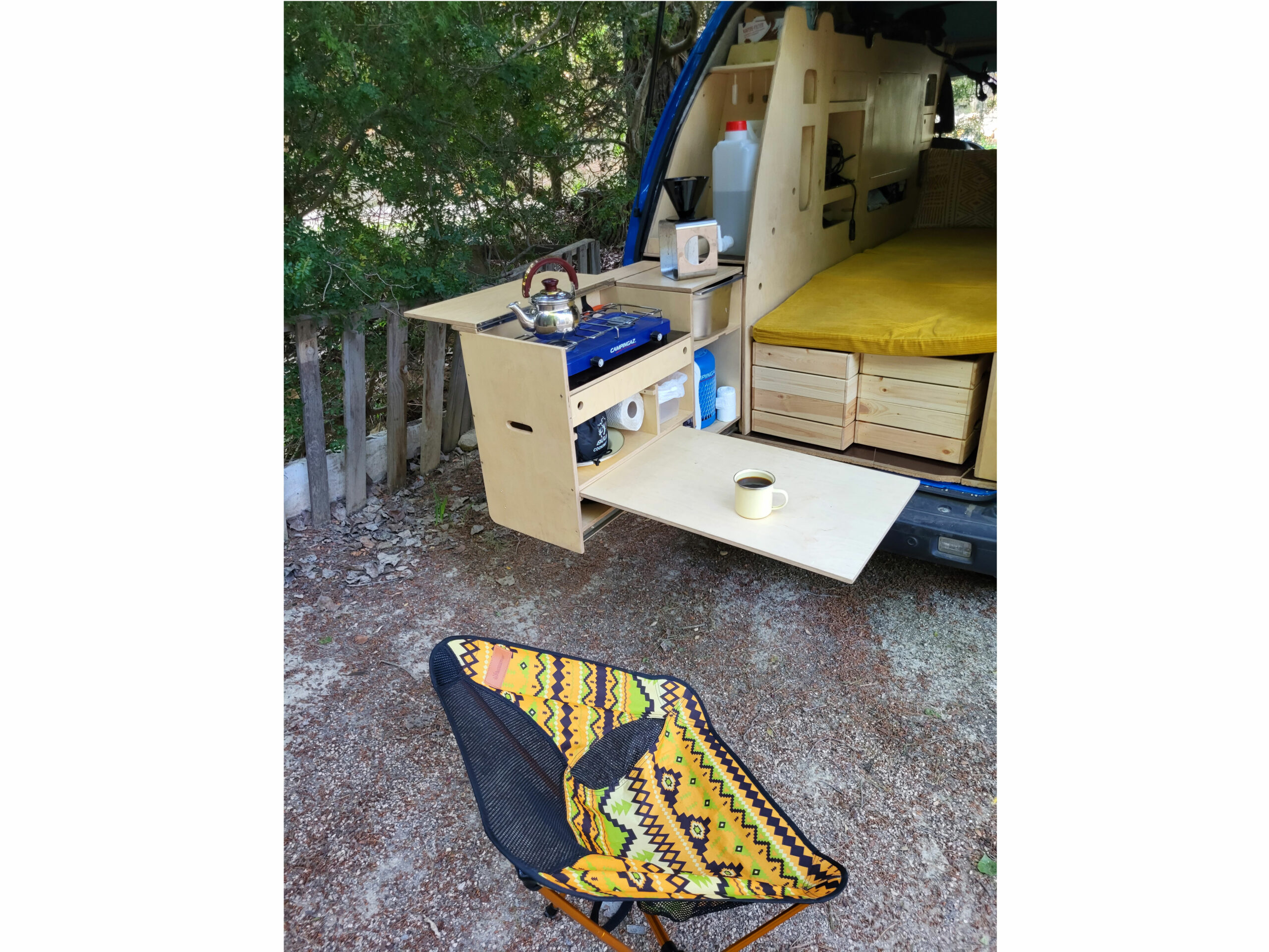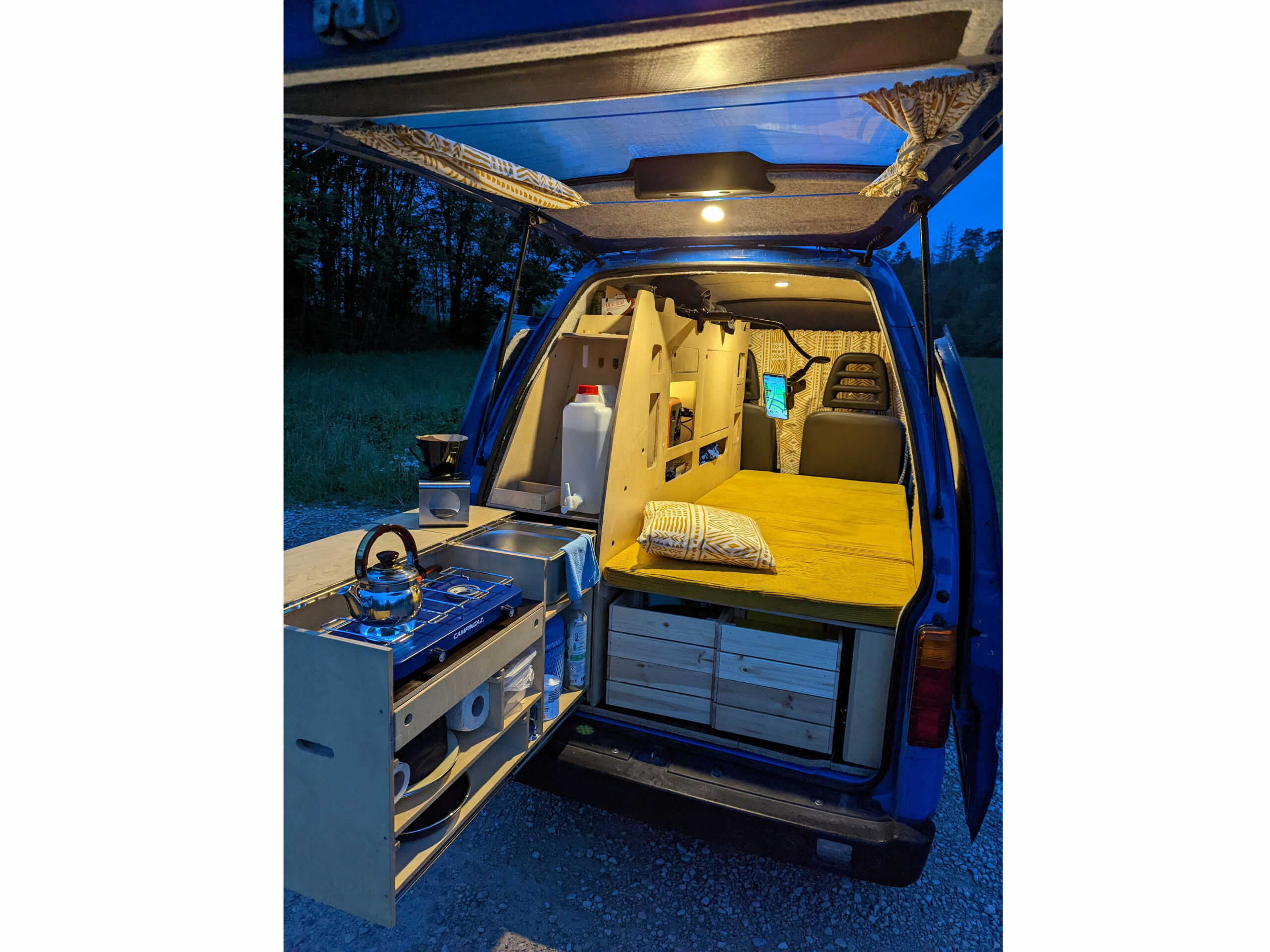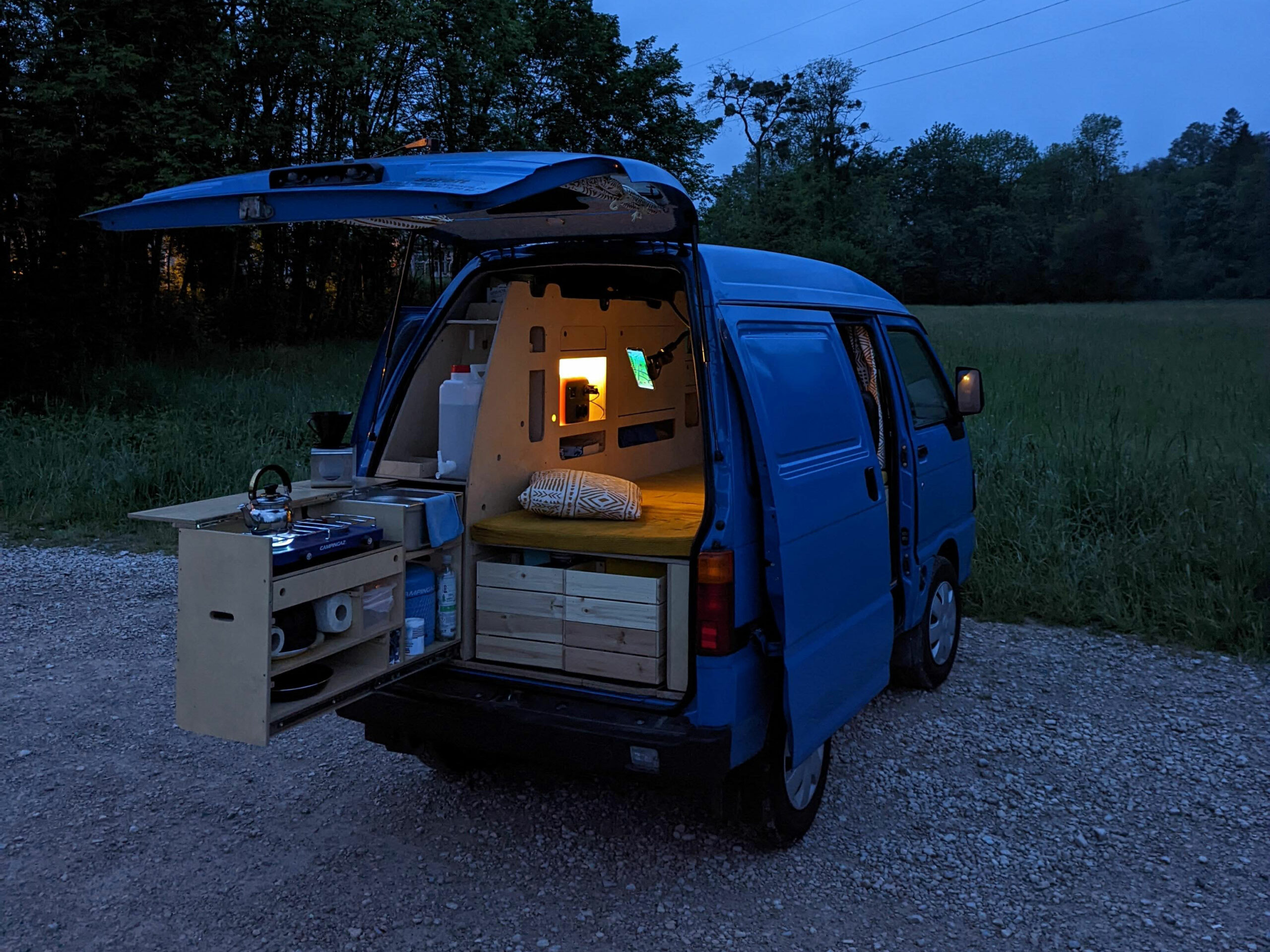 In meiner Küche ist das Wichtigste mein Kaffeefilter nebst -halter – und eine Bialetti, falls das Filterpapier ausgeht. Ich liebe Filterkaffee. Ansonsten koche ich gerne auf meinem Zweiflammenkocher… ein ganz einfaches Modell. Im Innenraum sind zwei LED-Lampen verbaut, die die Küche (bei offener Heckklappe) und den Innenraum beleuchten. Diese Beleuchtung nutze ich allerdings selten. Im Innenraum genügen mir meist das indirekte Licht der Powerbox (Lampe auf der Rückseite) und meine kleine LED-Lichterkette.