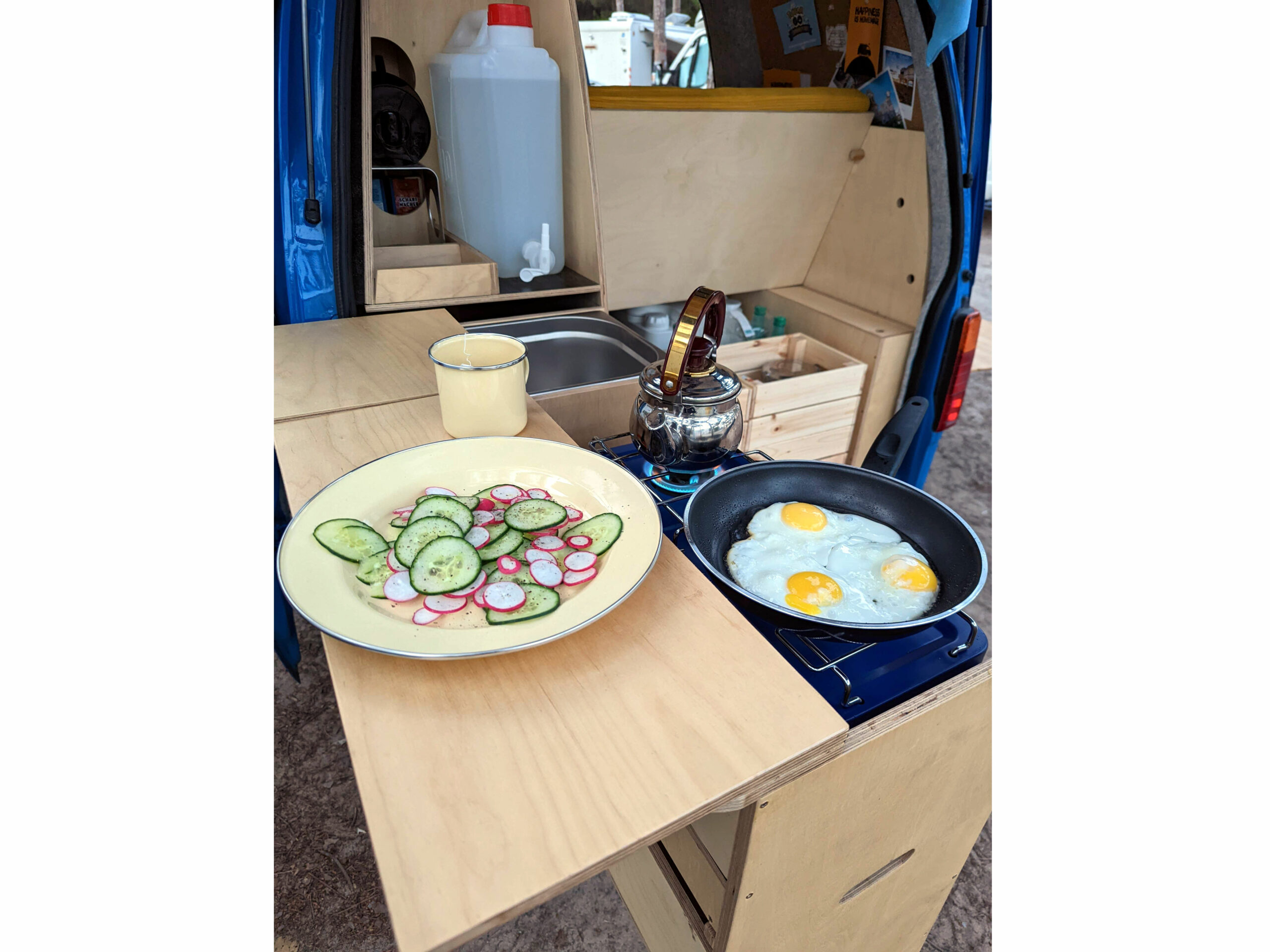 Wie vorher schon gesagt, war der Ausbau für mich perfekt und ist es nach wie vor. Ich würde rein gar nichts ändern. Außerdem hat mir Körmi noch ein paar „Upgrades“ eingebaut. Das betraf hauptsächlich die Küche. Ich konnte hier von den Erfahrungen ihrer zweijährigen Reise in ihrem Piaggio Porter profitieren.