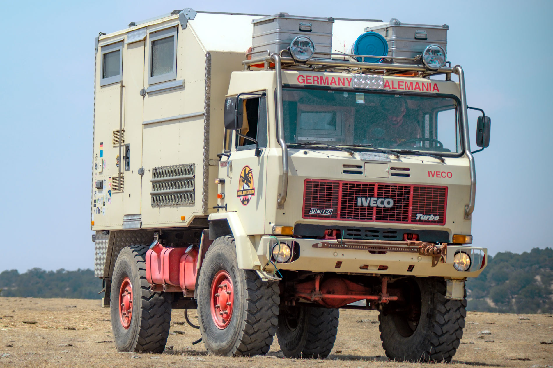 Unser Dino ist ein Iveco B80C80 und ein ehemaliges französisches Feuerwehrauto. Baujahr 1990 und Kilometerstand liegt bei ca 150.000 km. Unser Kilometerzähler zählt manchmal nicht mit, deswegen die Ca.-Angabe 😁. Dino hat Portalachsen, wie beim Unimog, für noch mehr Bodenfreiheit, er wiegt 7,5 Tonnen und ist 3,50 m hoch.