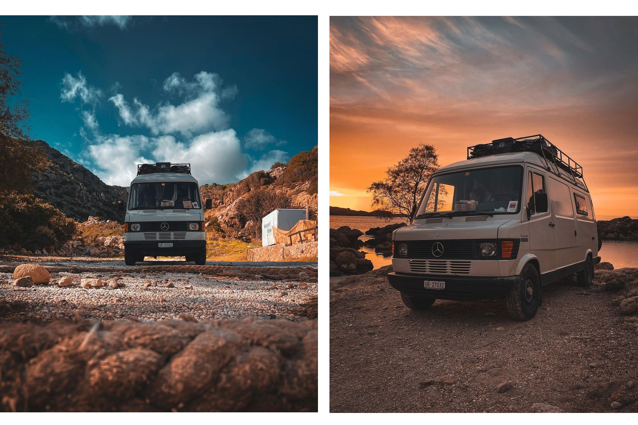 Elsa ist ein 1987er Mercedes-Benz 309d mit mittlerweile mehr als 300.000 km auf dem Tacho. Wir haben Elsa schon als Wohnmobil gekauft, aber alles rausgenommen und selbst nach unseren Wünschen neu ausgebaut. Beim Thema Elektro haben wir uns für eine Goal Zero Yeti 1000 in Kombination mit Solar-Panelen entschieden, weil wir uns so eine komplexe Elektro-Installation sparen konnten. Was bei unserem Van sicher ins Auge sticht, ist unsere Dachterrasse. Mit Hilfe von einem guten Kollegen haben wir einen Rahmen geschweißt und dann einen wunderschönen Holzboden montiert. So können wir wunderschöne Sonnenuntergänge von unserer ganz persönlichen Dachterrasse aus genießen.
