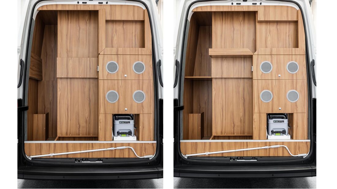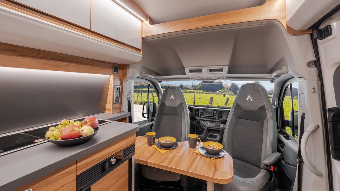 Der Affinity M Duo kommt serienmäßig mit einer Gas-Heizung, einem zweiflammigen Gaskocher, einem stattlichen 200-Liter-Frischwassertank und einem passenden Abwassertank. Beide sind frostsicher im Doppelboden montiert. Ebenfalls mit an Bord sind zwei Gasflaschen, eine Wohnraumbatterie mit 120 Ah, ein 70-Liter-Kühlschrank und gleich zwei Dachfenster mit Ventilator (über der Küche und im Bad).