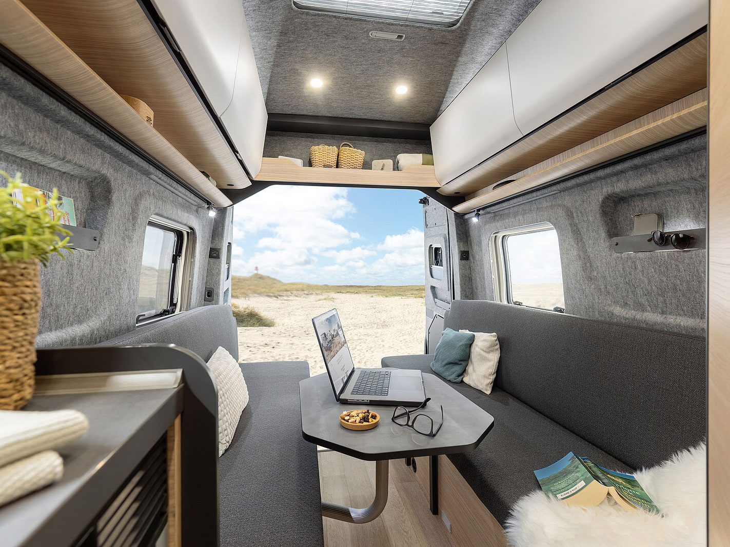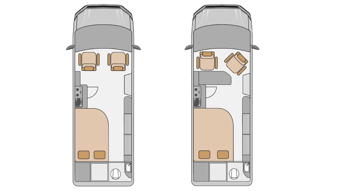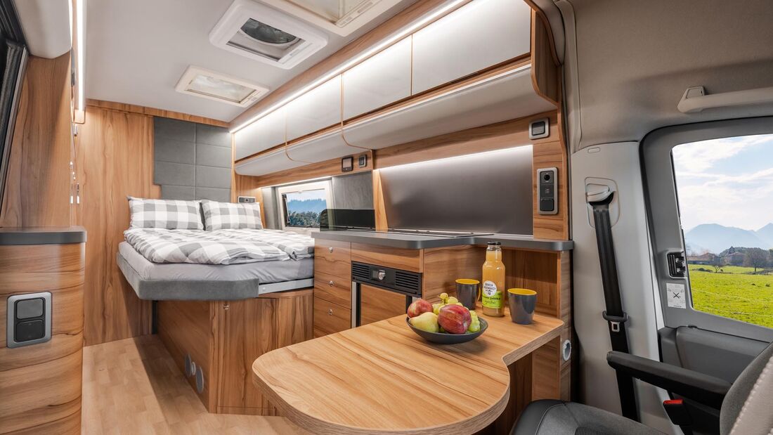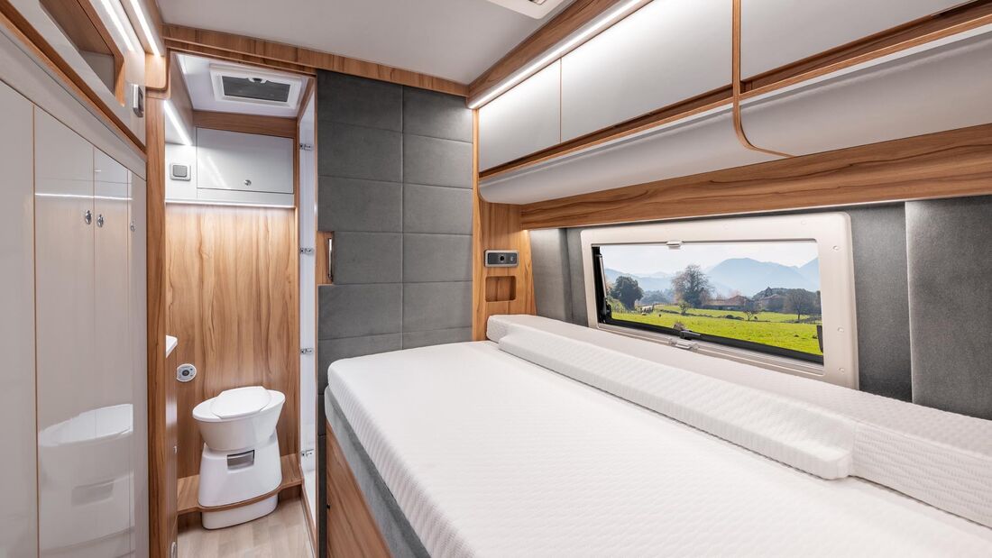 Das neue Modell ist ganz auf die Nutzung von Paaren ausgelegt. Das zeigt nicht nur das längs auf der Fahrerseite im Heck verbaute französische Bett (1,32 x 1,90 Meter), sondern auch die Abwesenheit von zusätzlichen Sitzplätzen. Lediglich Fahrer und Beifahrer finden auf ihren drehbaren Sitzen Platz. Noch hinter dem Bett befindet sich das Bad, das sich über die ganze Fahrzeugbreite erstreckt und dessen Zugang sich auf der Beifahrerseite neben dem Bett befindet. Klo und Dusche sind getrennt nutzbar, der Zugang zur Klo-Kassette erfolgt durch die Hecktür.