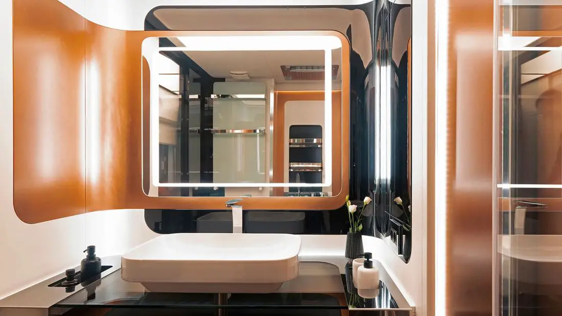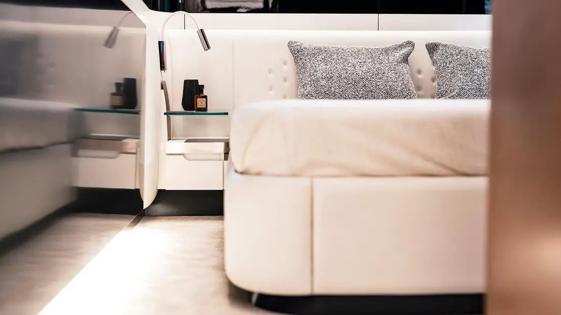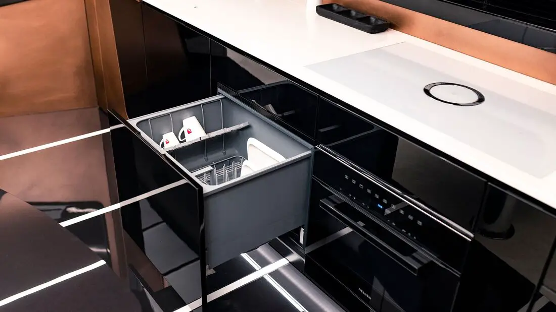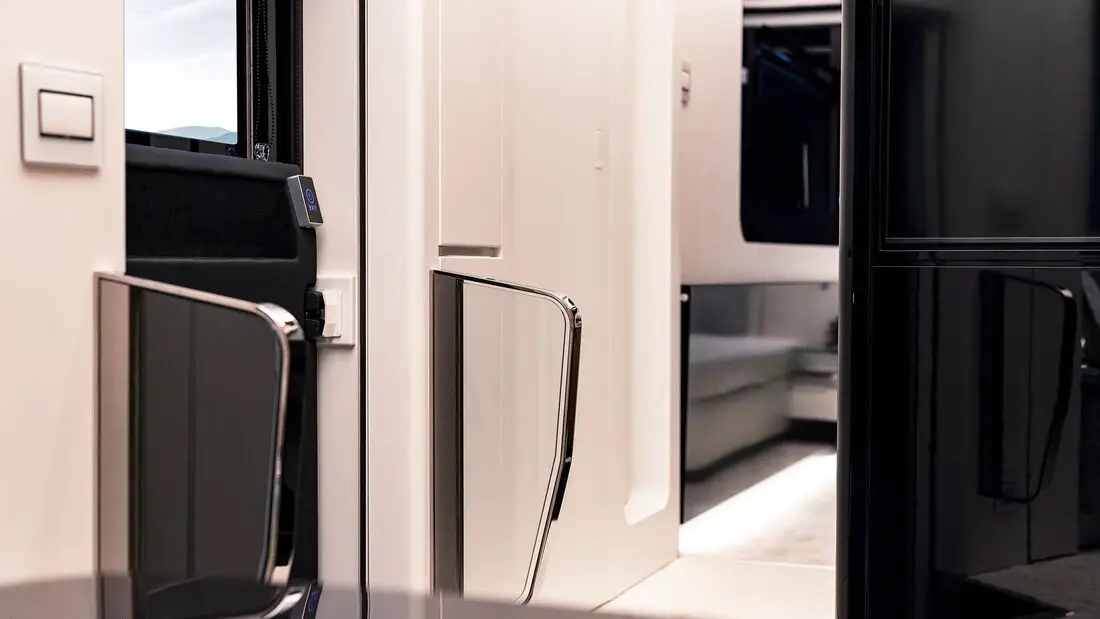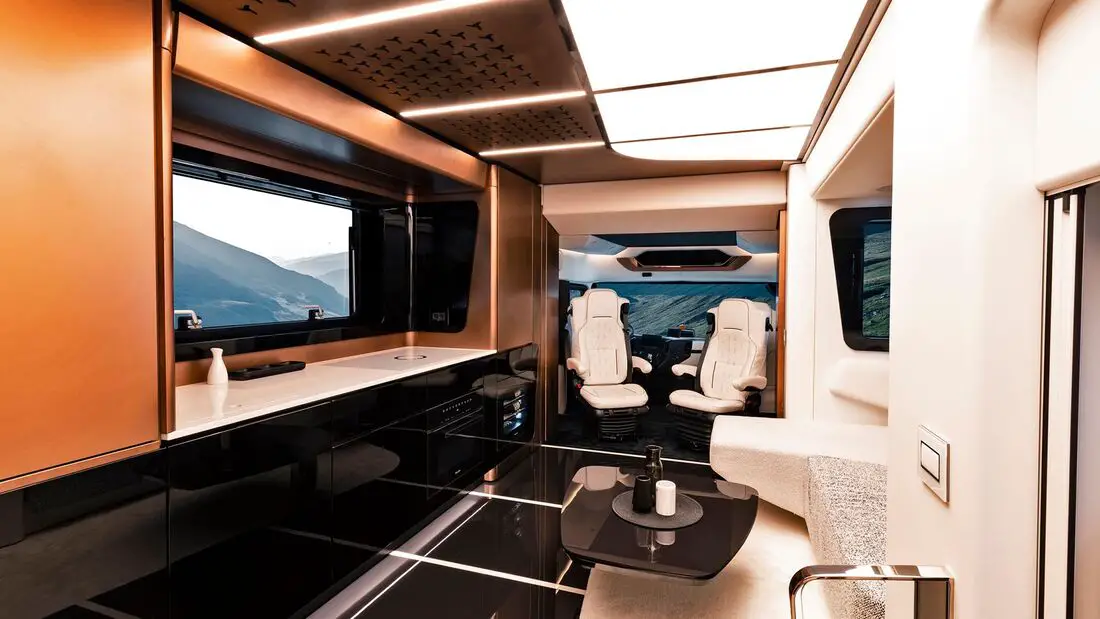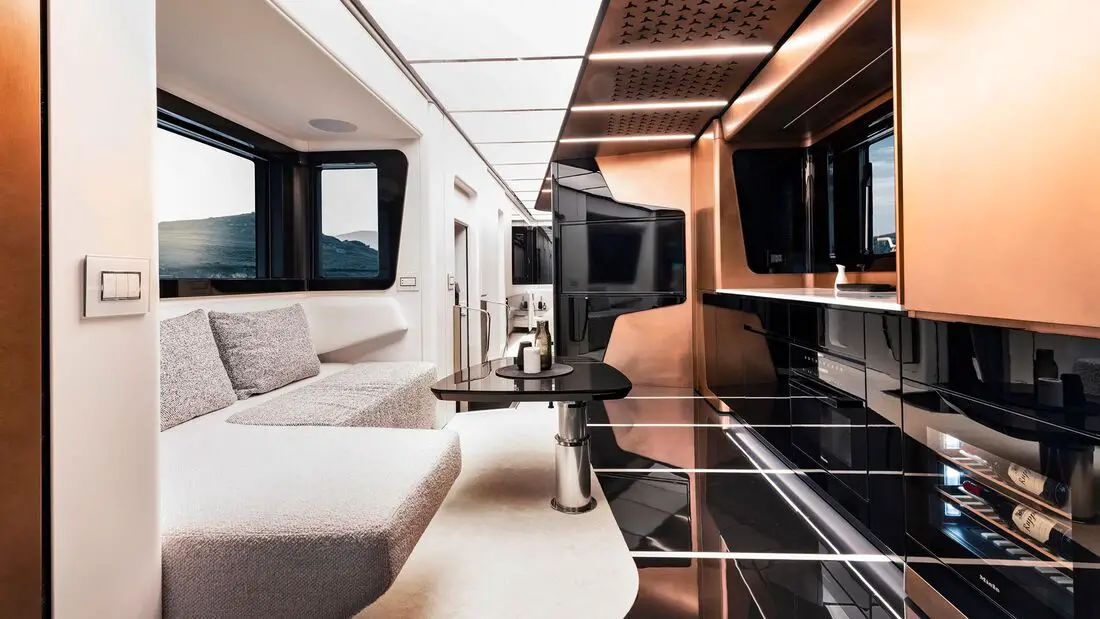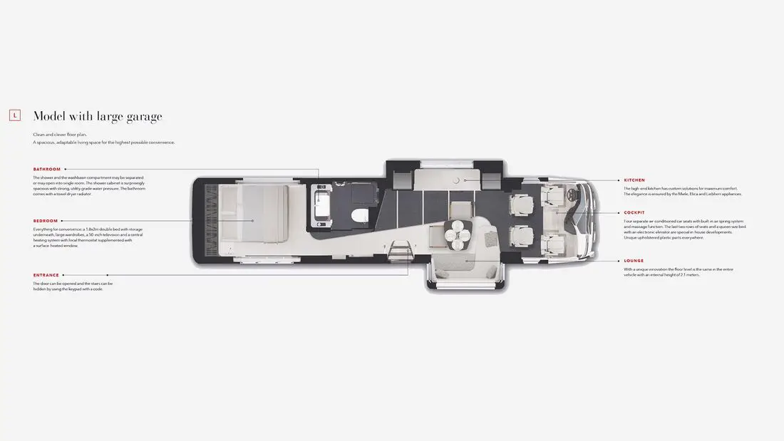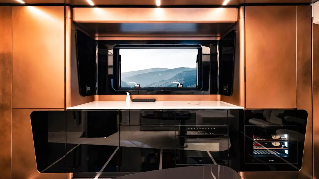 Generell mangelt es an Bord des Dembell L natürlich nirgends an Annehmlichkeiten. Alle Einbauten bestehen aus Marmor, Stahl, Leder und Echtholz, die verbauten Geräte von Liebherr, Miele, Harman & Kardon und Bose. Das Interieur-Design stammt vom italienischen Design-Büro Galeazzi e Minotti, die normalerweise im Yachtbau tätig sind, ihren maritimen Style nun aber in einem Luxus-Camper einfließen lassen.