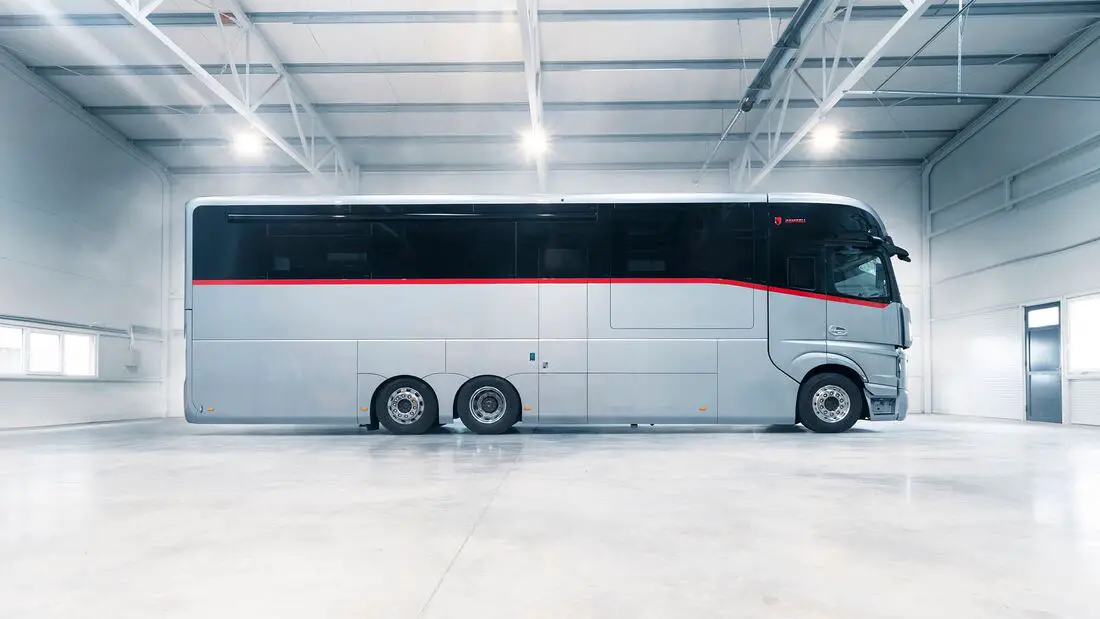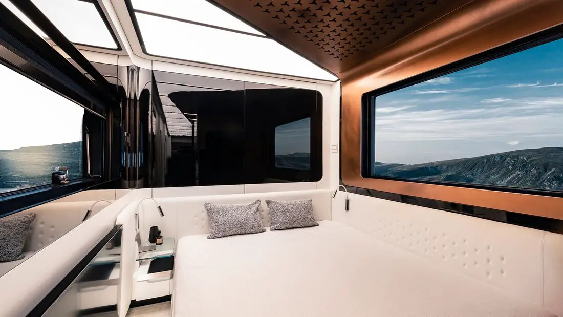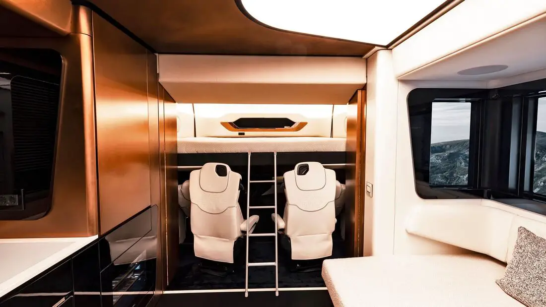 Im Cockpit, des auf dem Mercedes Actros basierenden Mobils finden sich vier einzelne Ledersitze. Darüber gleitet bei Bedarf ein großes Hubbett herunter. Und zack, machen die vier Sitzplätze im Fahrerhaus auch Sinn.