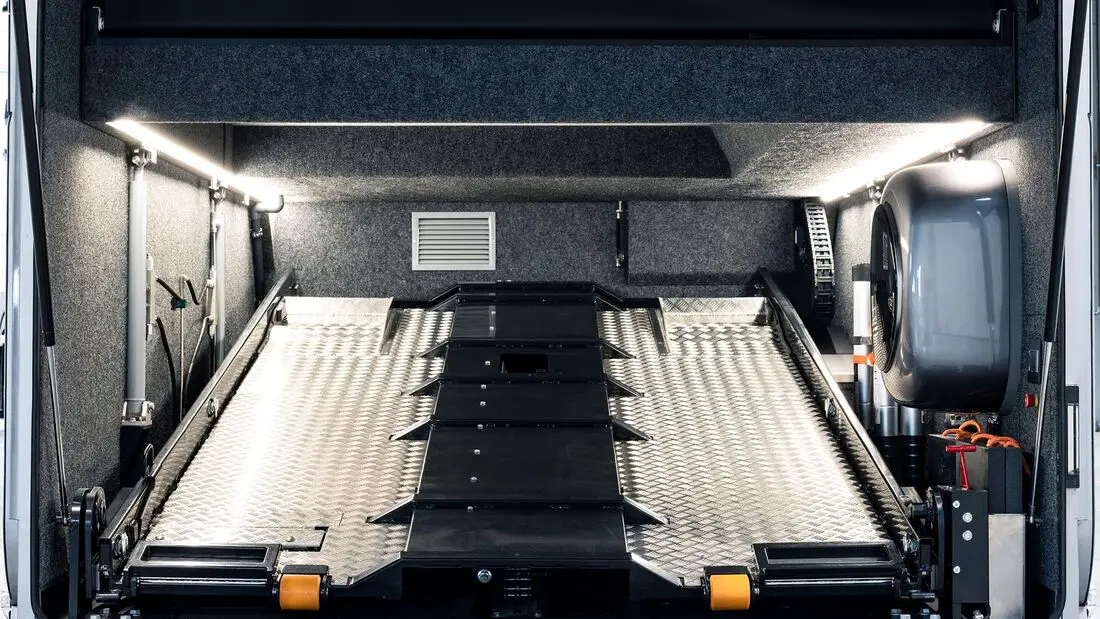 Und es kommt noch besser. Um das „Beiboot“ einzuholen muss es nur auf die ausgefahrene Rampe gefahren werden. Diese zieht es dann vollautomatisch ein. In diesem Zusammenhang muss dann allerdings das darüber liegende Bett etwas nach oben weichen, was im Innenraum dazu führt, dass es nun eine Stufe zwischen Bad und Schlafbereich gibt. An den Annehmlichkeiten des 1,80 x 2,00 Meter messenden Bettes, ändert dies natürlich nichts.
