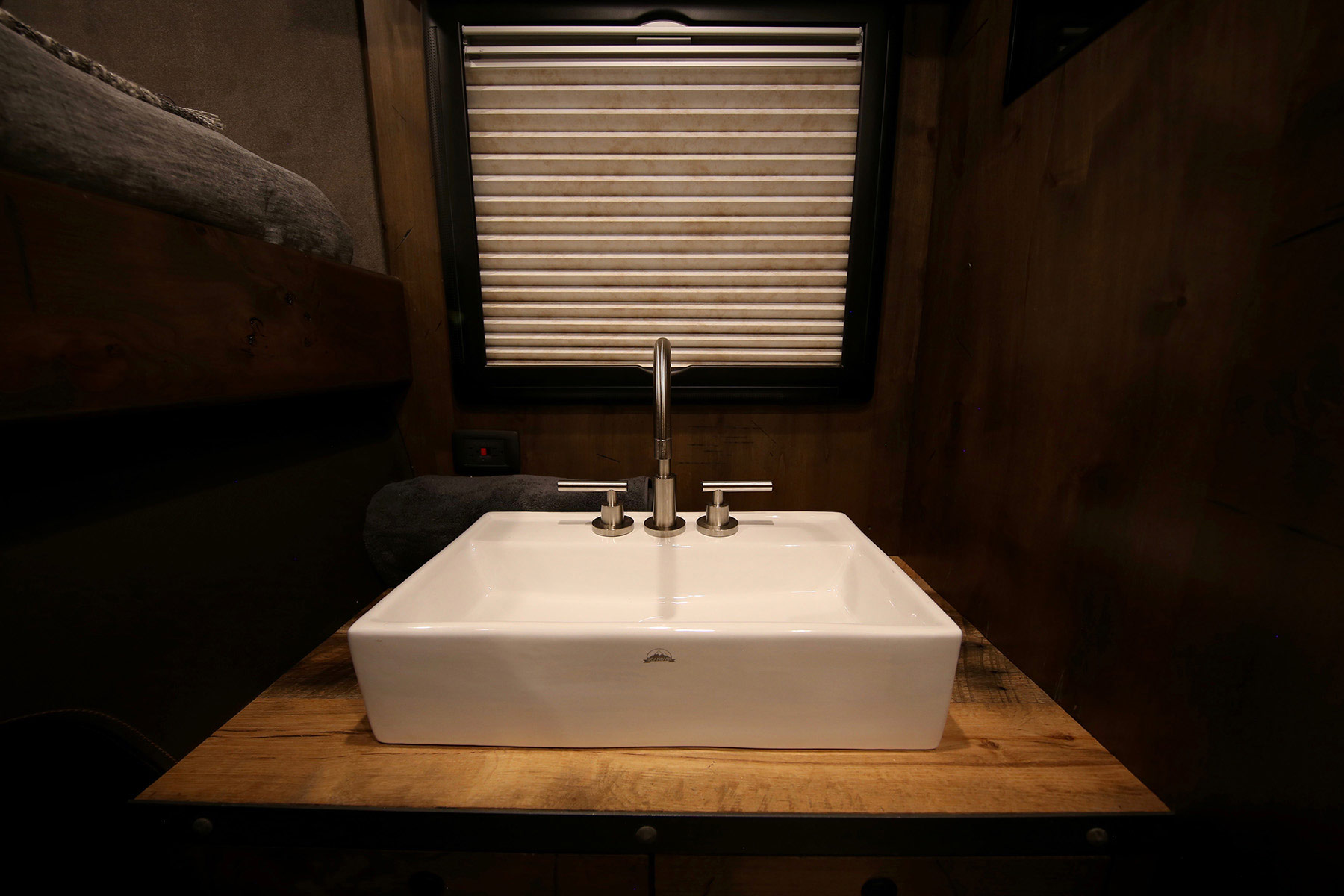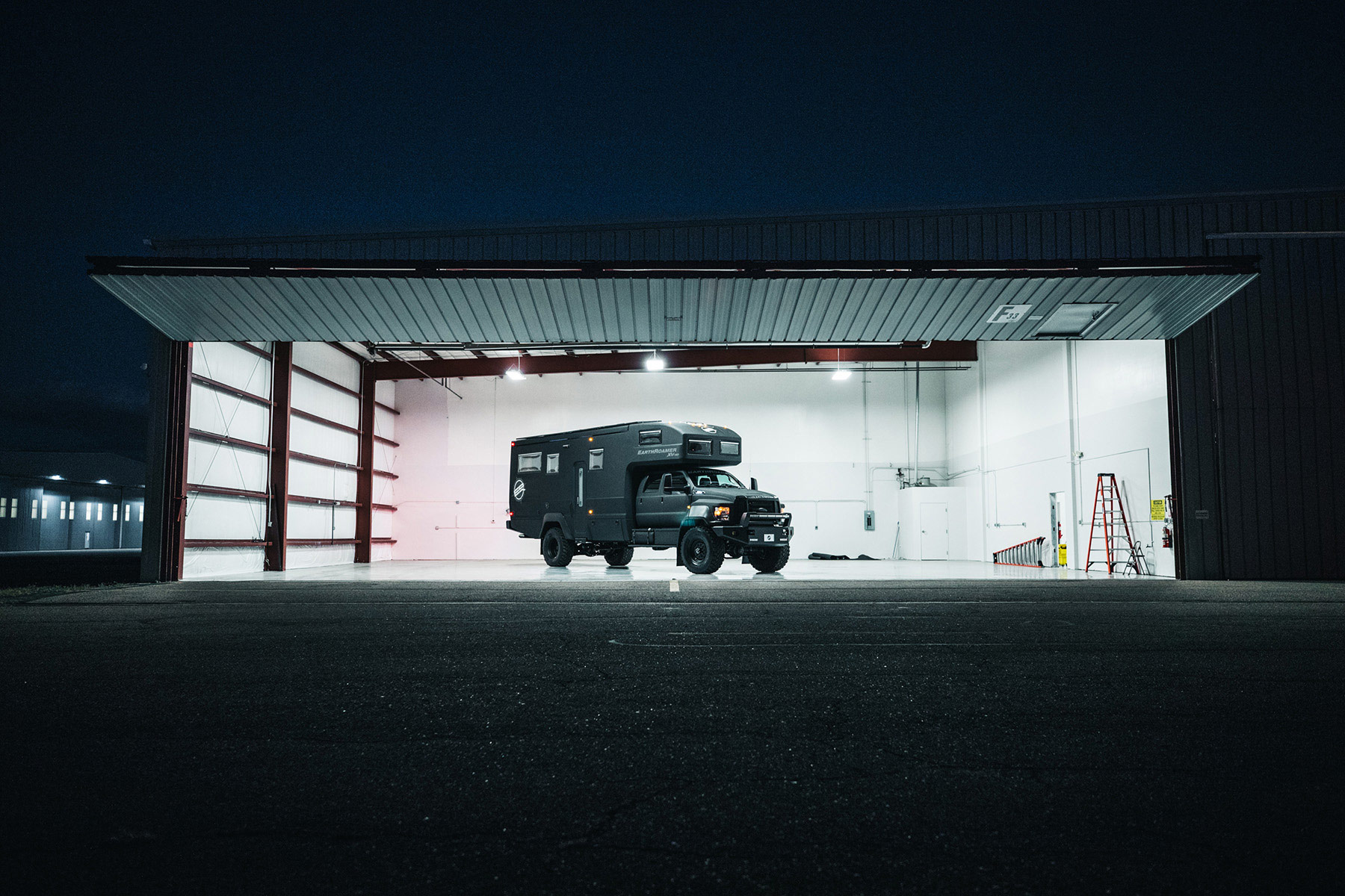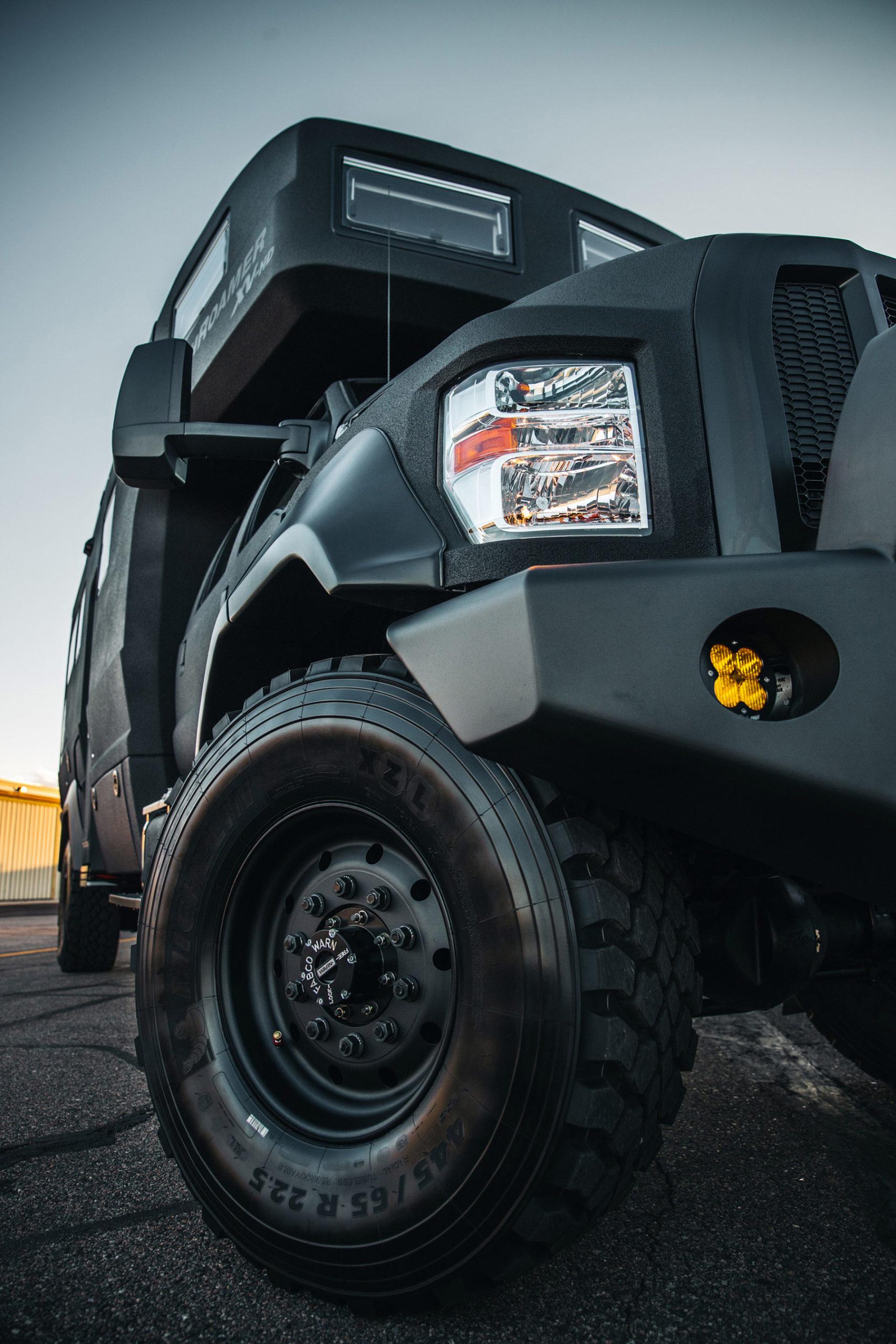 Das Chassis startet mit der starken und leistungsstarken F-750-Plattform. Da das Chassis mit 4WD nicht ab Werk verfügbar ist, ist eine Umrüstung erforderlich. Durch Hinzufügen einer festen Antriebsachse an der Vorderseite und eines vom Benutzer wählbaren Verteilergetriebes verwandelt sich der F-750 in eine sehr leistungsfähige Expeditionsplattform. Eine hintere Luftfederung und ein hydraulisches Nivelliersystem sorgen für ein hervorragendes Handling und eine einfache Nivellierung im Lager.