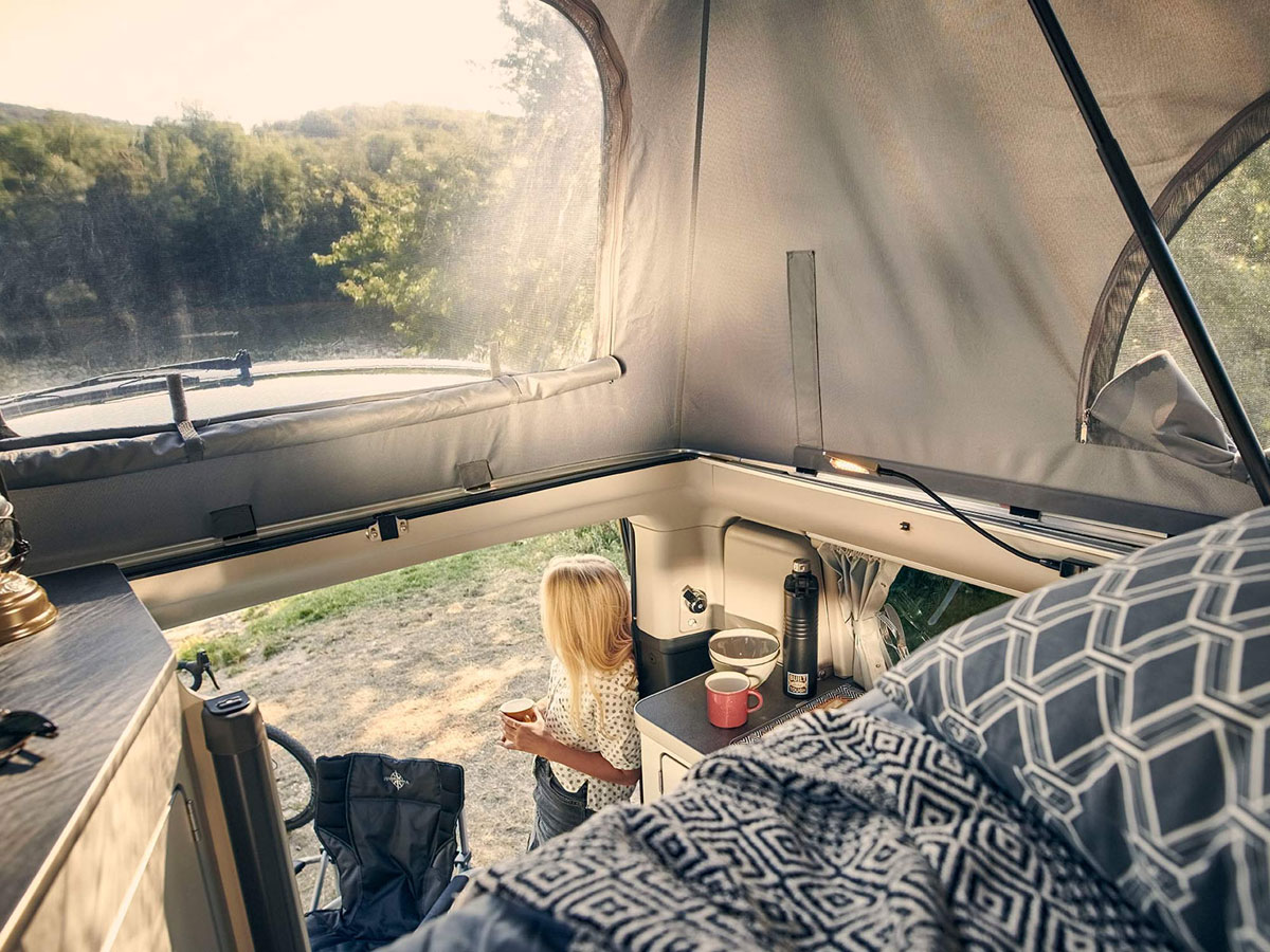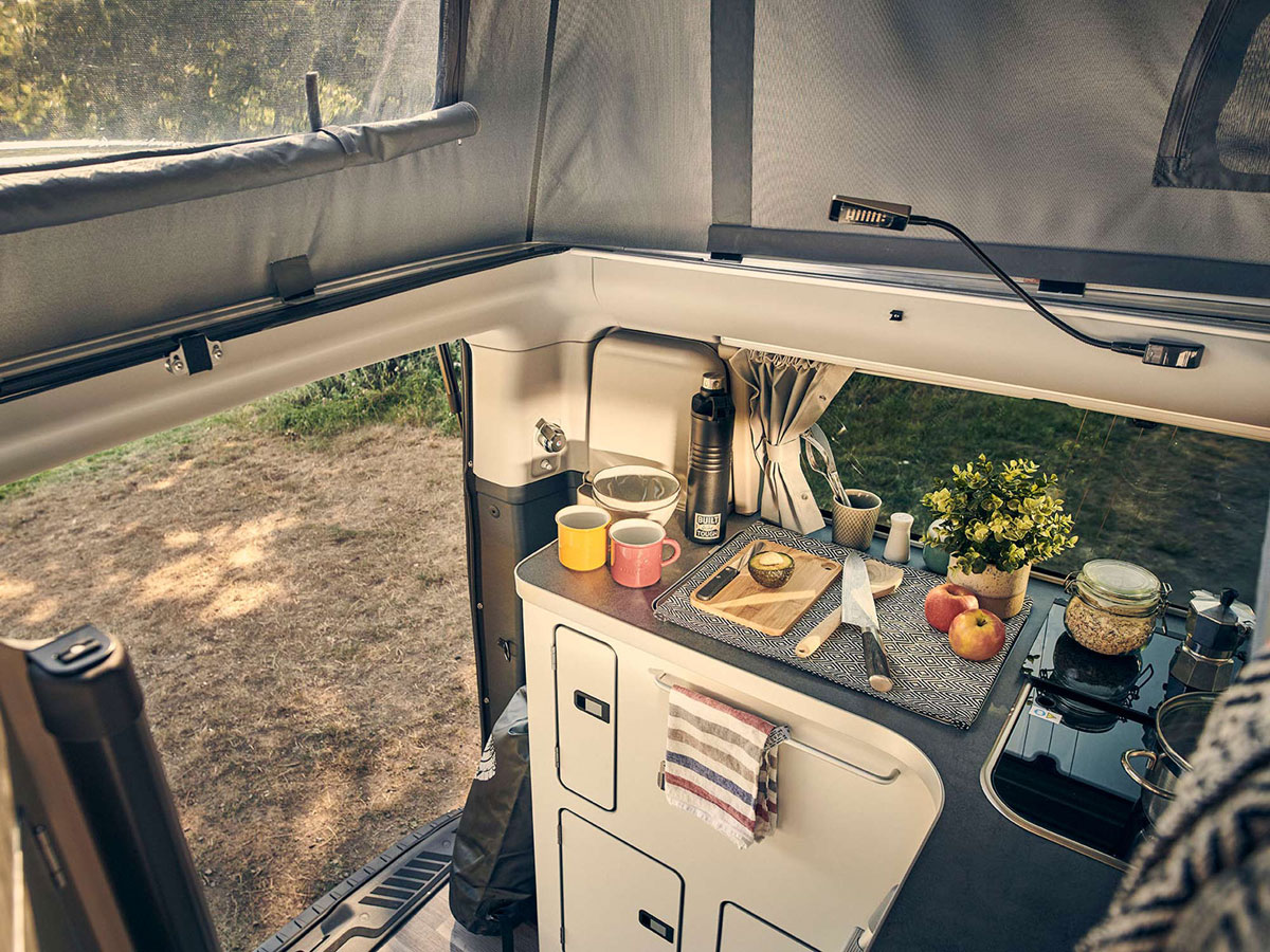 [adrotate group=“1″]Das Plus im Namen zeigt an, dass es sich um die 36 cm längere Neukonstruktion handelt. Erstmalig haben die Konstrukteure von Westfalia, die die Ford-Basismodelle zu Campern weiterveredeln, eine Variante mit Aufstelldach am Start. Nugget-typisch wurde hier das Konzept umgedreht! Das Hubdach wird am Heck aufgestellt und schafft damit Höhe und luftige Atmosphäre im Küchenbereich. Eine kleine Leiter erleichtert den Aufstieg ins Bett und hat gegenüber der Aufstiegsvariante bei der Konkurrenz einen deutlichen Vorteil in der Usability.