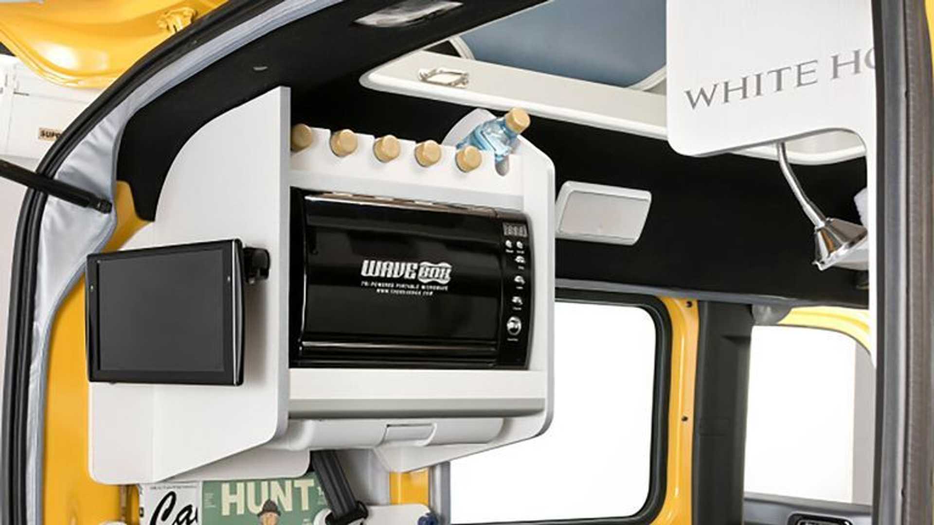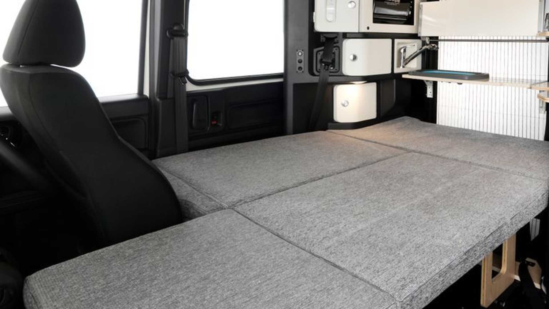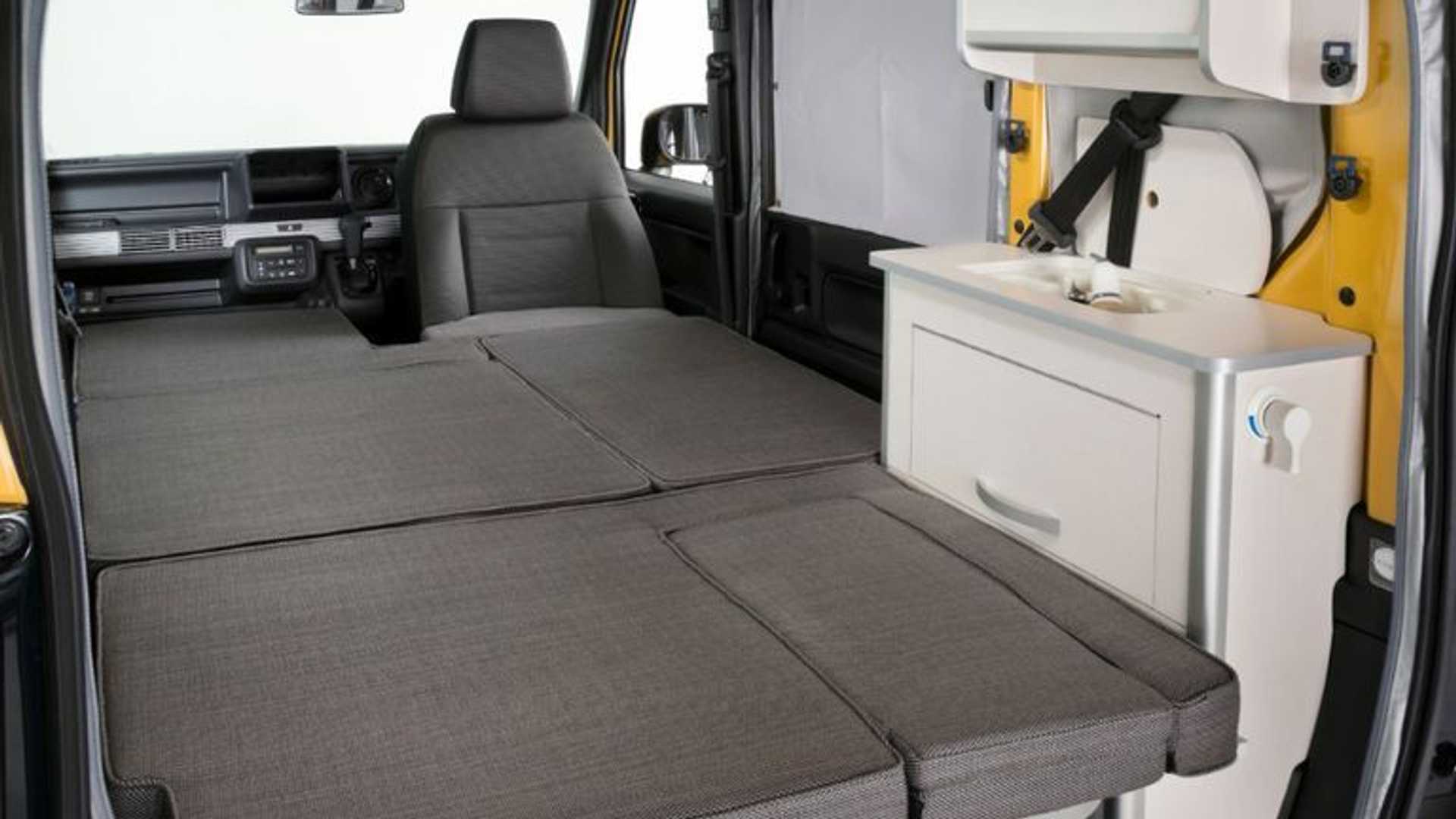 Gerade mal 3,40-m-Länge misst der wie ein Elefantenrollschuh anmutende japanische Camper-Zwerg. Dass es hier nicht um Design, sondern rein um Funktionalität geht, ist auf den ersten Blick ersichtlich. Eine Schönheit ist der Honda N-Van – jedenfalls für mich – nicht. Dafür ist der Innenraum wirklich bis auf den letzten Zentimeter genutzt. Beim Aufzählen der im Van integrierten Features schlackern einem die Ohren: Küche mit Mikrowelle, kleiner Kühlschrank, Spüle, Ablagen und sogar ein Fernseher.