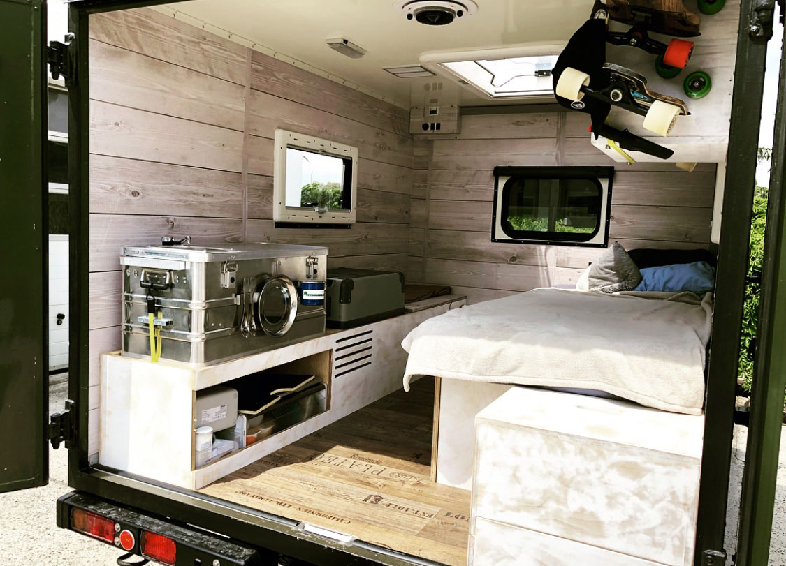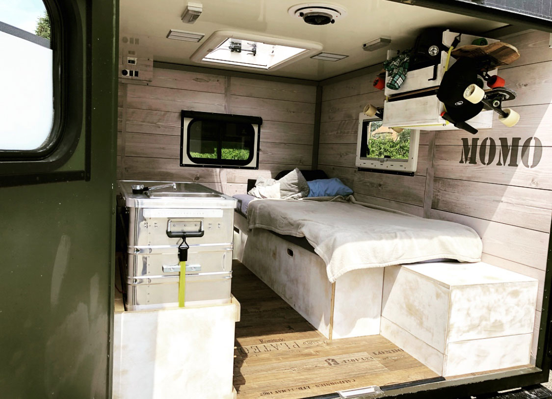 Aufgrund der knapp bemessenen Platzverhältnisse und weil Dirk schon mit wenig zufrieden ist, wirkt Momos Innenleben überschaubar und praktikabel. Vorhanden sind WC, Küche, Schlafplatz für zwei Personen, eine Solaranlage und eine Kühlbox – also alles, was man braucht. Ach ja: Platz für zwei Longboards gibt’s auch noch.