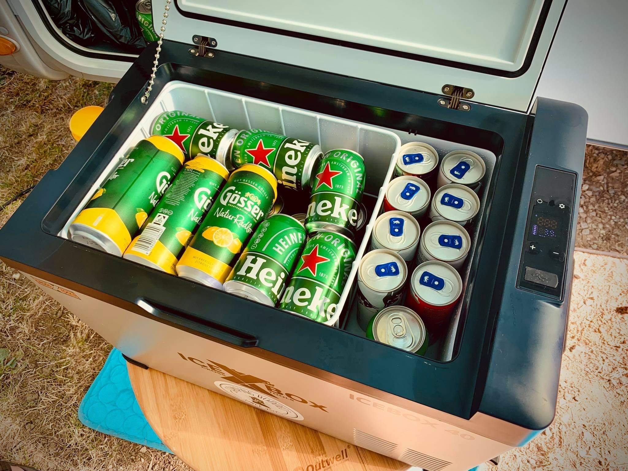 Wir nutzen die Kühlbox im Grunde für zwei unterschiedliche Dinge: Zum einen als Tiefkühltruhe, wenn wir mit dem Camper zum Ferienhaus in DK/Schweden fahren (37 Liter Fassungsvermögen reichen wir echt viel Tiefgekühltes). Und zum anderen als wie oben beschriebenen Zweitkühlschrank für die Sommerurlaube in ES/GR/F. Alles, was nicht „wichtig“ ist, kommt in die Heckgarage – also Bier und Co.