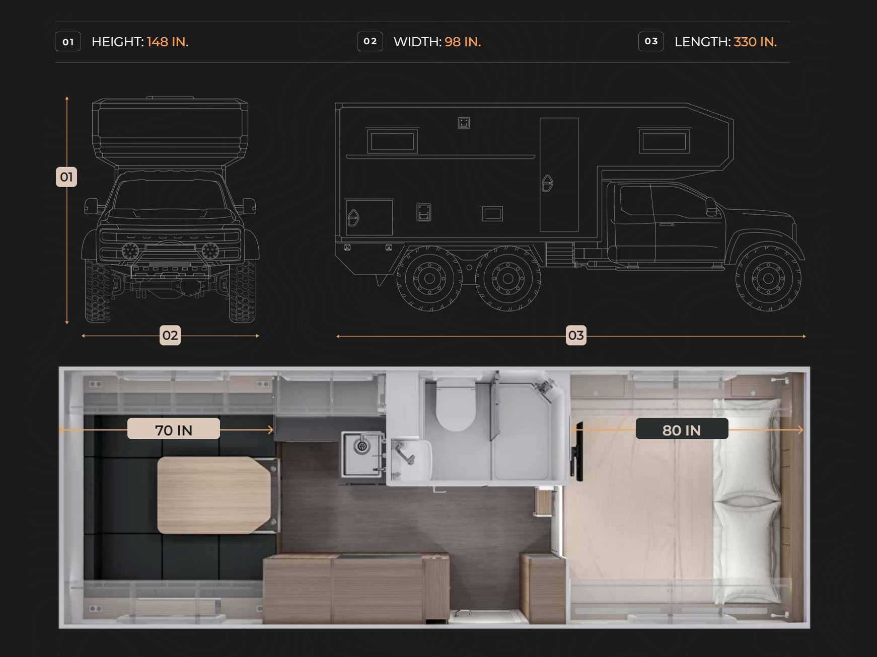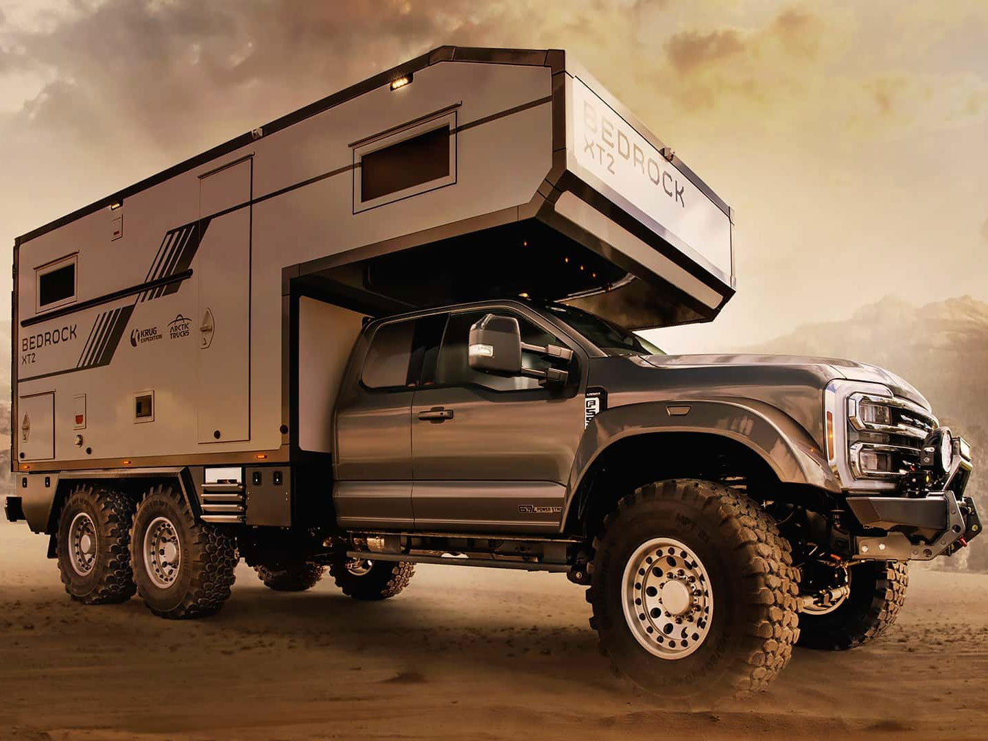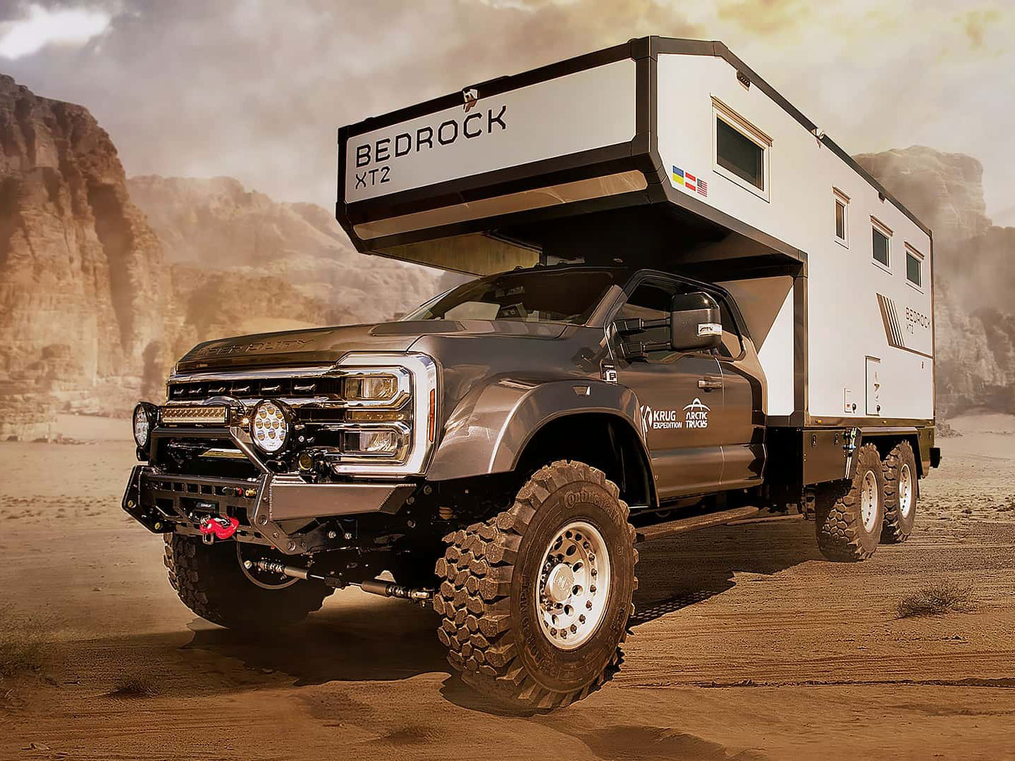 Wie ihr euch vielleicht schon gedacht habt, basiert der XT2 auf dem Ford F-550, der auch die Basis für den LOKI Expedition Falcon X15 stellt. Entwickelt und gebaut wird der Pickup-Camper von der österreichischen Firma KRUG Expedition, die sich dafür mit der isländischen Firma „Arctic Trucks“ zusammen getan hat. Grund für die Kooperation ist die große Nachfrage auf dem US-Markt, der man nun mit dem Bedrock XT2 nachkommen möchte.