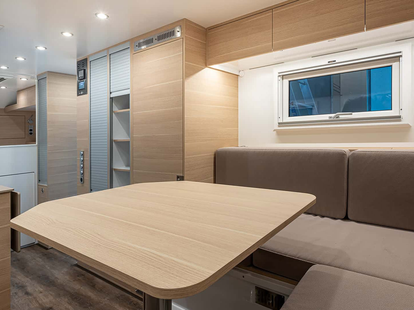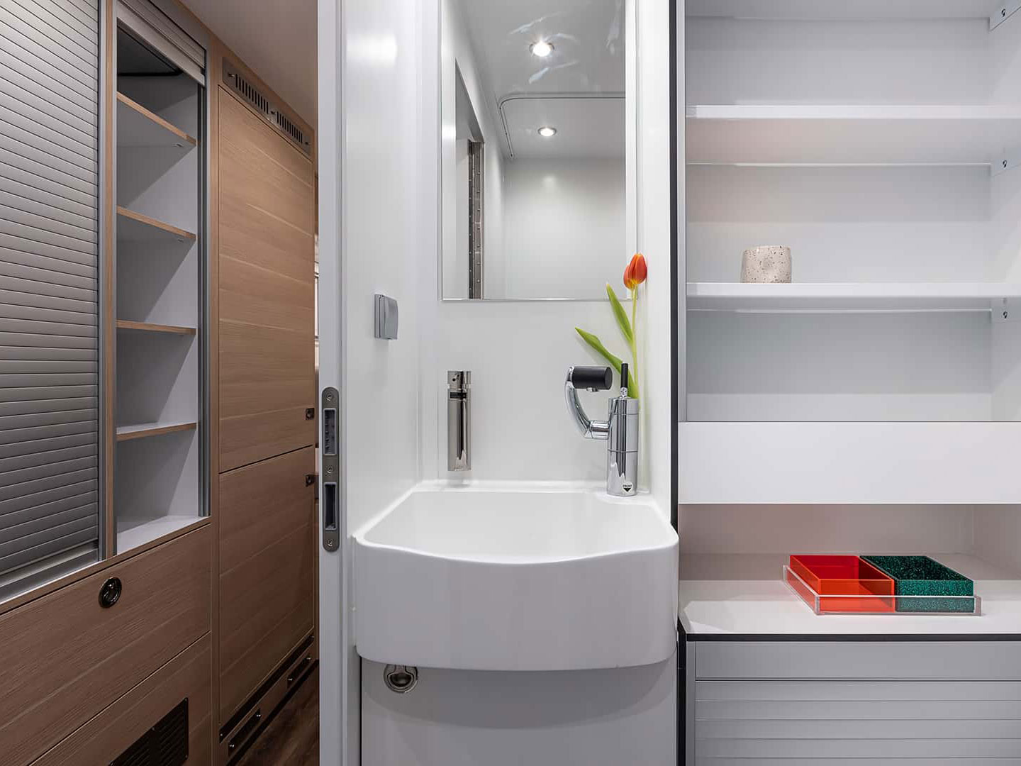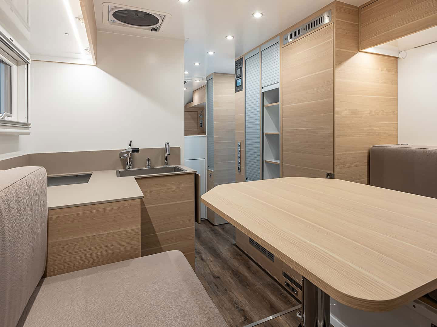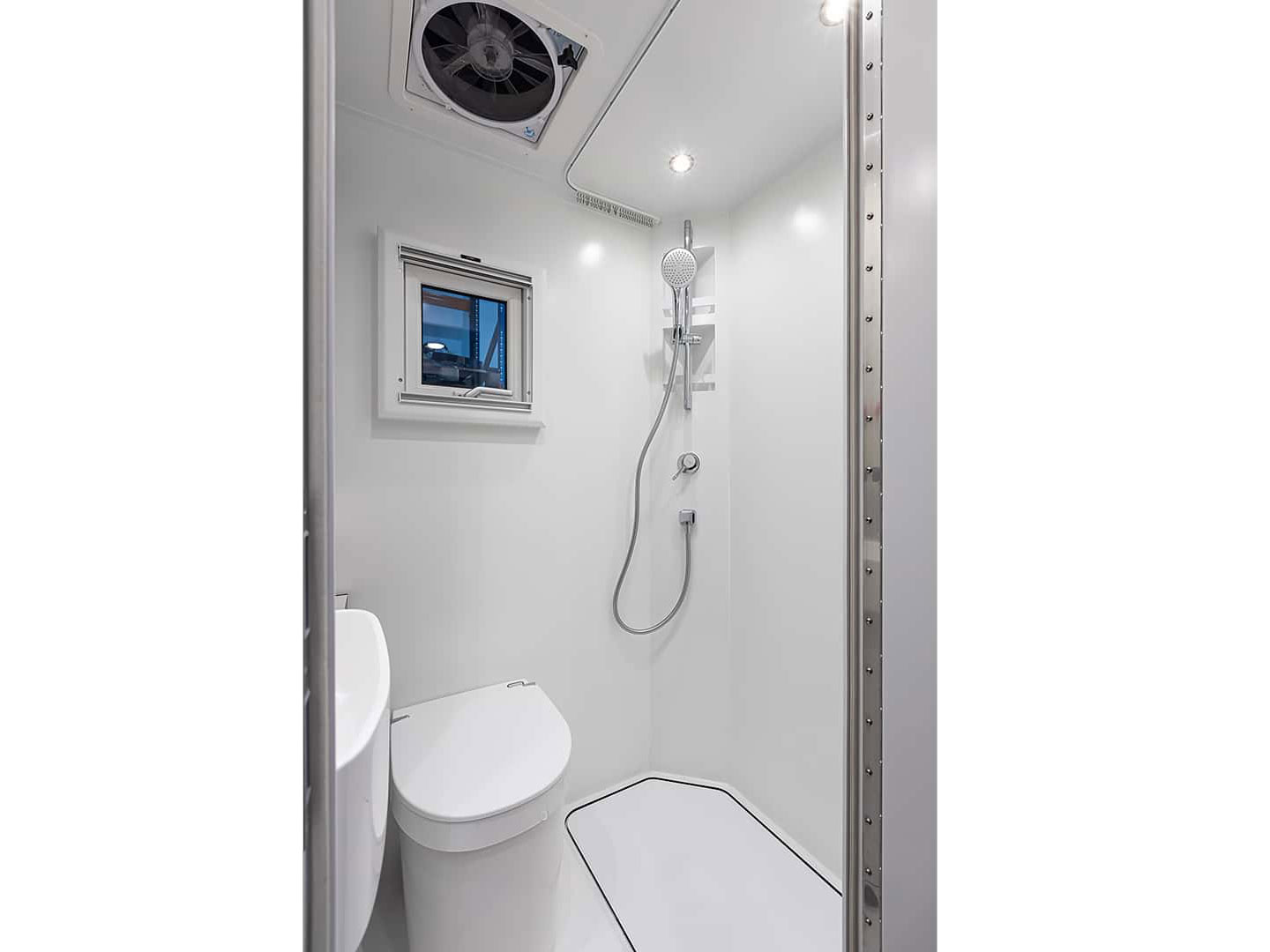 Vorhanden ist natürlich dennoch alles, was man so braucht: Der Frischwassertank (mit vier Filterstufen) fasst 450 Liter, der Abwassertank hat ein Volumen von 225 Liter und beim Schwarzwasser-Tank ist nach 65 Litern Schluss. Optional kann eine Zerhackertoilette geordert werden.