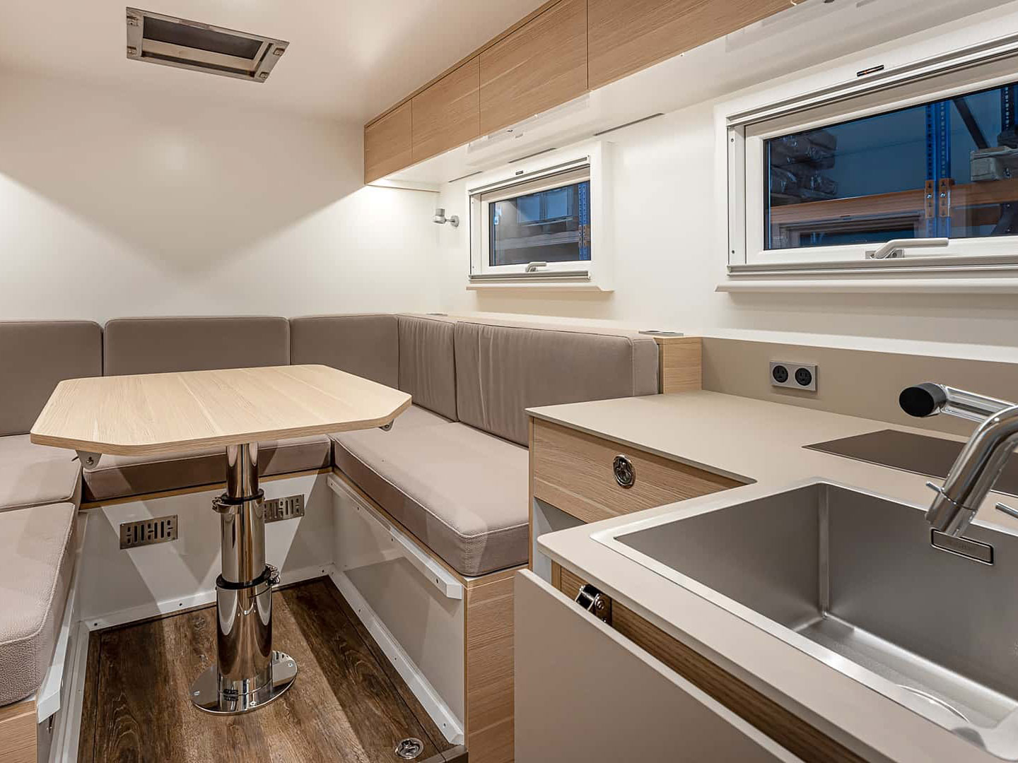 Geschlafen wird entweder auf dem knapp 2×2 Meter messendem Hauptbett im Akoven, oder auf der zum Bett umbaubaren Rundsitzgruppe im Heck.