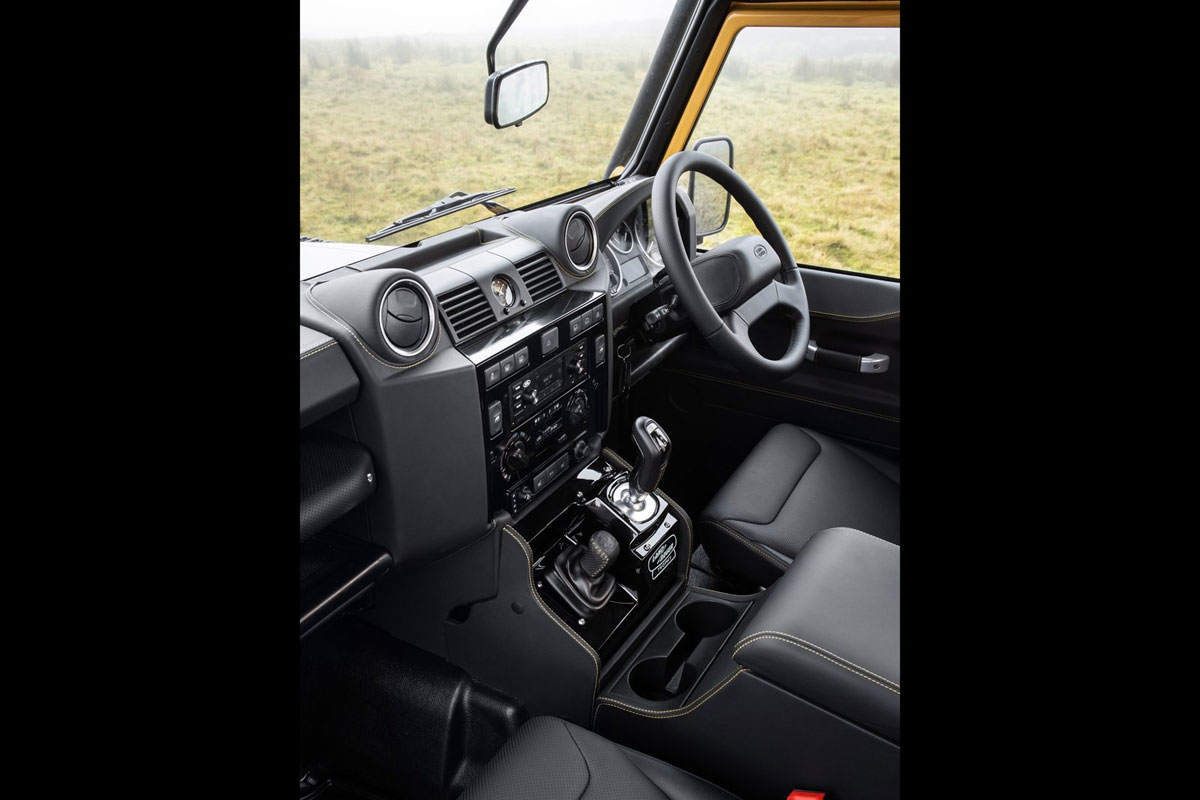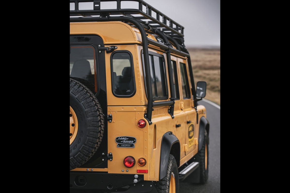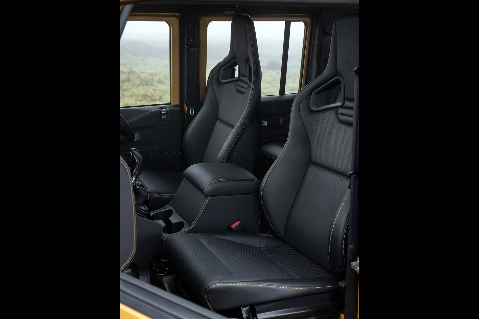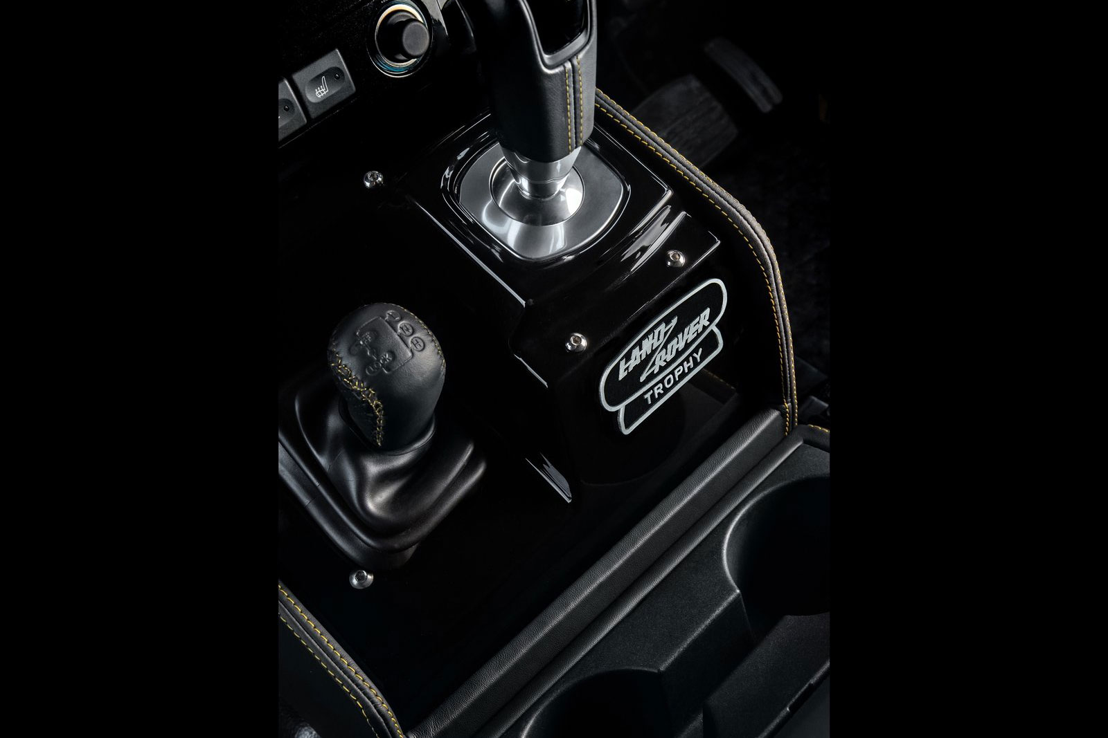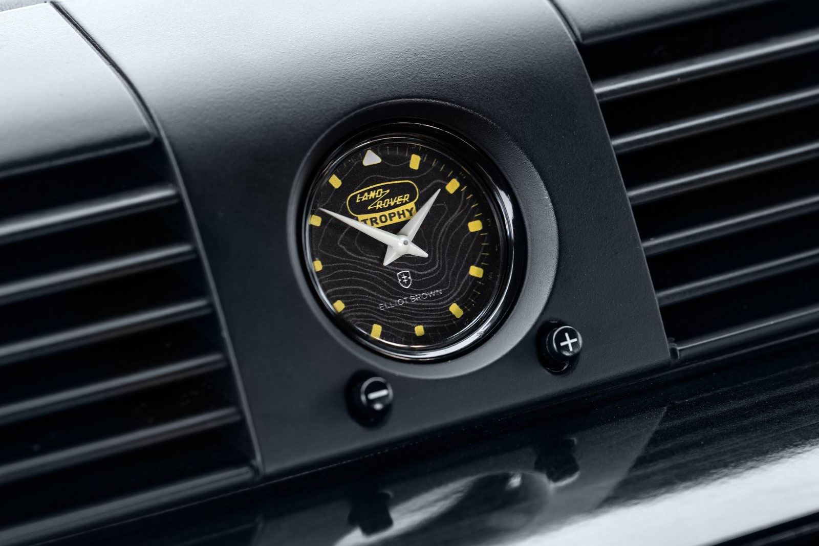 Doch so rustikal der Works V8 Trophy auch daherkommt: im Inneren wird es modern und edel. Volllederausstattung mit schwarzen Windsor-Lederbezügen auf Recaro-Sportsitzen, abgesteppt mit gelben Kontrastnähten. Dazu ein von Land Rover Classic entwickeltes Classic-Infotainment-System mit integrierter Navigation und Mobilgeräte-Konnektivität. Das Ganze wird dann noch abgerundet mit einem exklusiven „Land Rover Trophy“ Ziffernblatt in der Analoguhr des Armaturenbretts, gestaltet von Uhrenhersteller Elliot Brown.