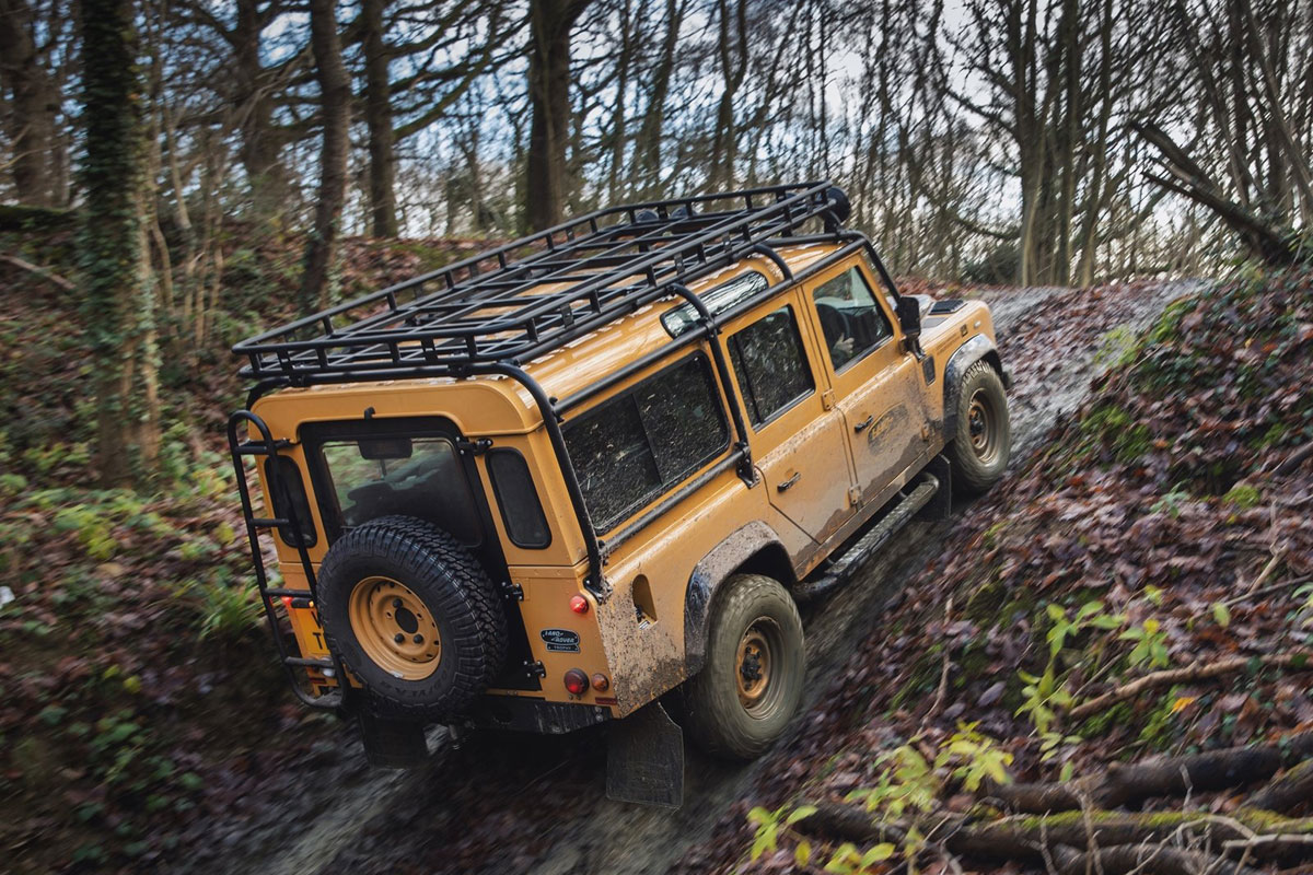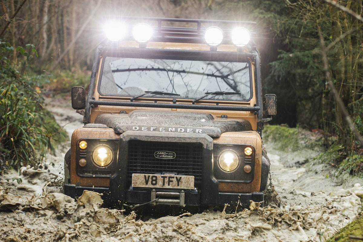 Natürlich werden Fahrwerk, Bremsen und Optik dem Leistungsplus entsprechend angepasst. So wird von der Sonderabteilung “Land Rover Classic“ ein All-Terrain-Kit verbaut, das unter anderem Frontwinde, Mehrpunkt-Expeditions-Überrollkäfig, Dachträger, Unterbodenschutz, Schnorchel, LED-Zusatzscheinwerfer und 235er Mud-Terrain-Reifen umfasst. Diese sitzen auf 16 Zoll Stahlfelgen, die dem Landy zusätzlich diesen unverwüstlichen Look geben.