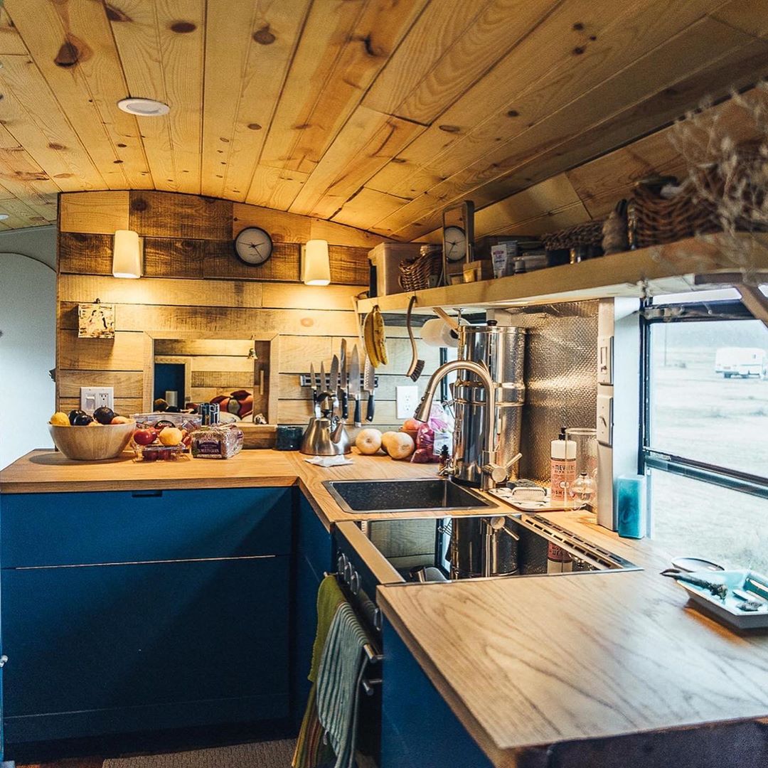 Neu ist die Idee nicht, Schulbusse in Camper umzubauen, aber wie Danny den Umbau gestaltet hat und die Tatsache, dass er die ganze Fläche nur für sich alleine nutzt, das sticht schon heraus. Dank seines Design Hintergrundes spürt man dabei auch die Liebe zum Detail. Sein oberstes Ziel war es, die einzelnen Bereiche optisch klar voneinander zu trennen. So kommt man aus einem kombinierten Wohn-, Ess-, Arbeitsbereich hinter dem Fahrerplatz in eine unglaublich große Küche, die jeder ausgewachsenen Einfamilienwohnung gut zu Gesicht stehen würde. Besonders gut gefallen uns dabei der großzügige Einsatz von Holz und die offenen Regale. Speziell in einem Wohnmobil verwundert das nämlich. Zum einen wegen des Gewichts von massivem Holz und zum anderen, dass Danny wohl keine größeren Probleme mit herumfliegenden Gegenständen hat. Vielleicht liegt das ja an dem gemächlichen Antrieb.