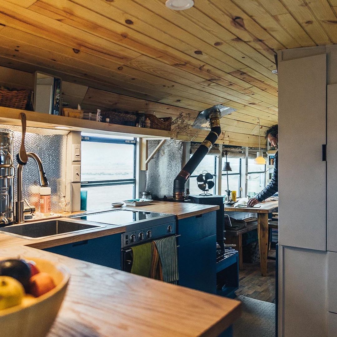 Weiter geht es über den hinteren Radkasten ins Bad (in Zedernholz), samt WC und großzügigem Schlafbereich mit Dachluke und Durchreiche in die Küche. Und wie bekommt Danny seinen Bus im Winter geheizt? Mit einem gusseisernen Holzofen. Das findet er selber zwar auch ein wenig spooky, doch wie seinen ersten Tests bei Eis und Schnee bewiesen haben, bekommt er sein Wohnmobil auch bei Minusgraden gut warm.