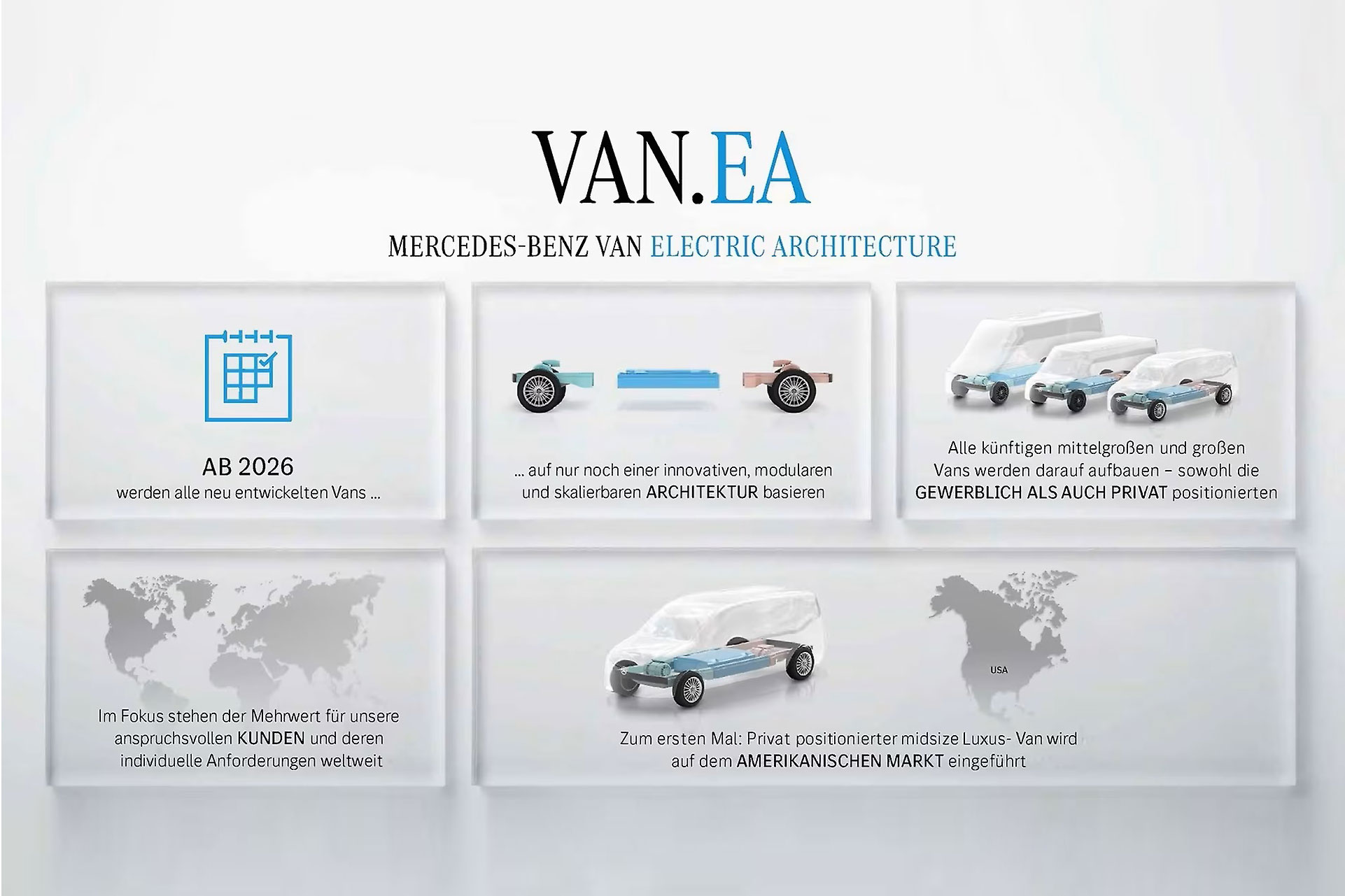 Na, das hört sich doch mal wirklich gut an und lässt hoffen: Ab 2026 baut Mercedes seine mittelgroßen und großen Vans nur noch auf der neuen Plattform „VAN.EA“ (Van Electric Architecture). Die folgt der Strategie „electric only“ und ist konsequent auf die Bedürfnisse elektrisch angetriebener Transporter und Vans ausgelegt.