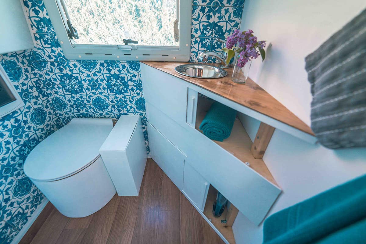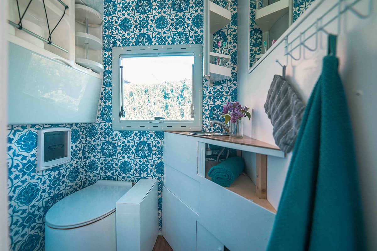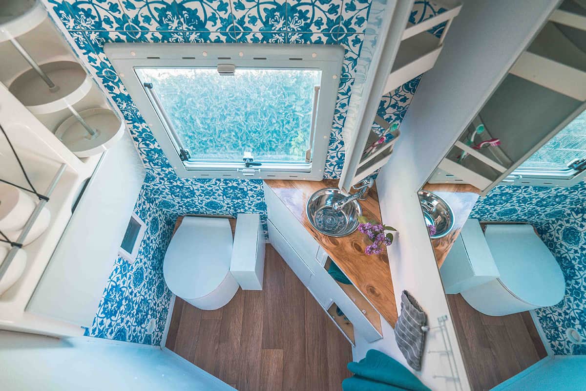 Wir haben eine Trockentoilette eingebaut. Denn die verbaute Kassetten-Toilette ist für uns ein ganz besonderes Grauen. Als wir angefangen haben, die Toilette zu entfernen, standen wir vor unserem alten vergilbten Badezimmer und haben beschlossen, gleich alles zu erneuern. Auf das Ergebnis sind wir aktuell besonders stolz.