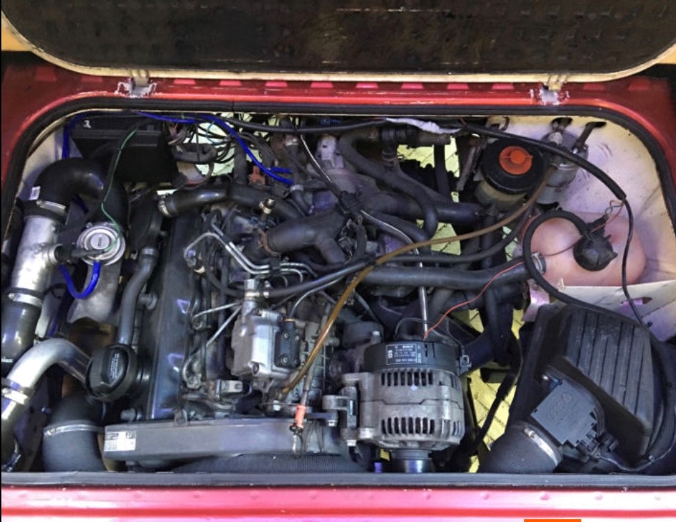 Das wirkliche Highlight befindet sich aber unter der Motorhaube im Heck. Denn der Bus wird von einem 1,9-Liter-TDI-Motor aus dem Golf 3 angetrieben. Dieser leistet maximal 110 PS.