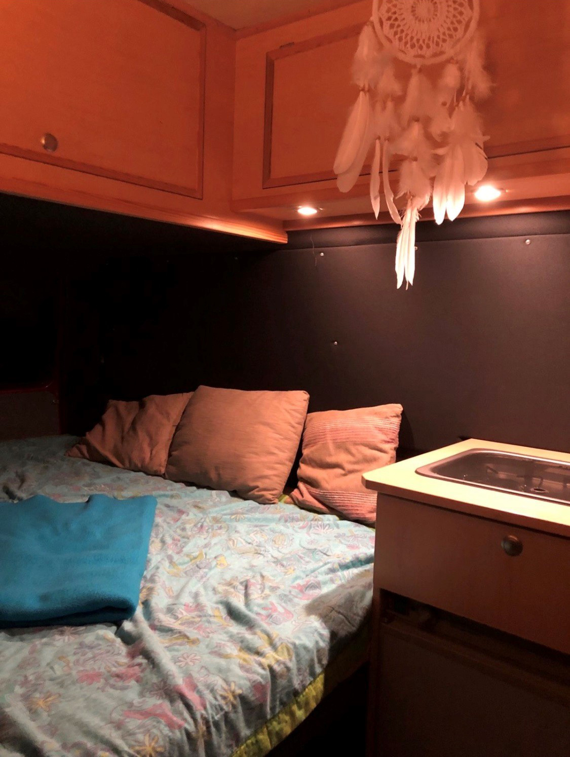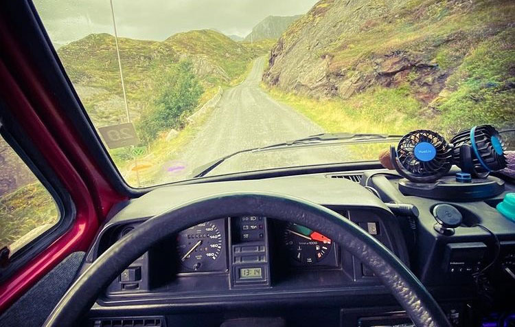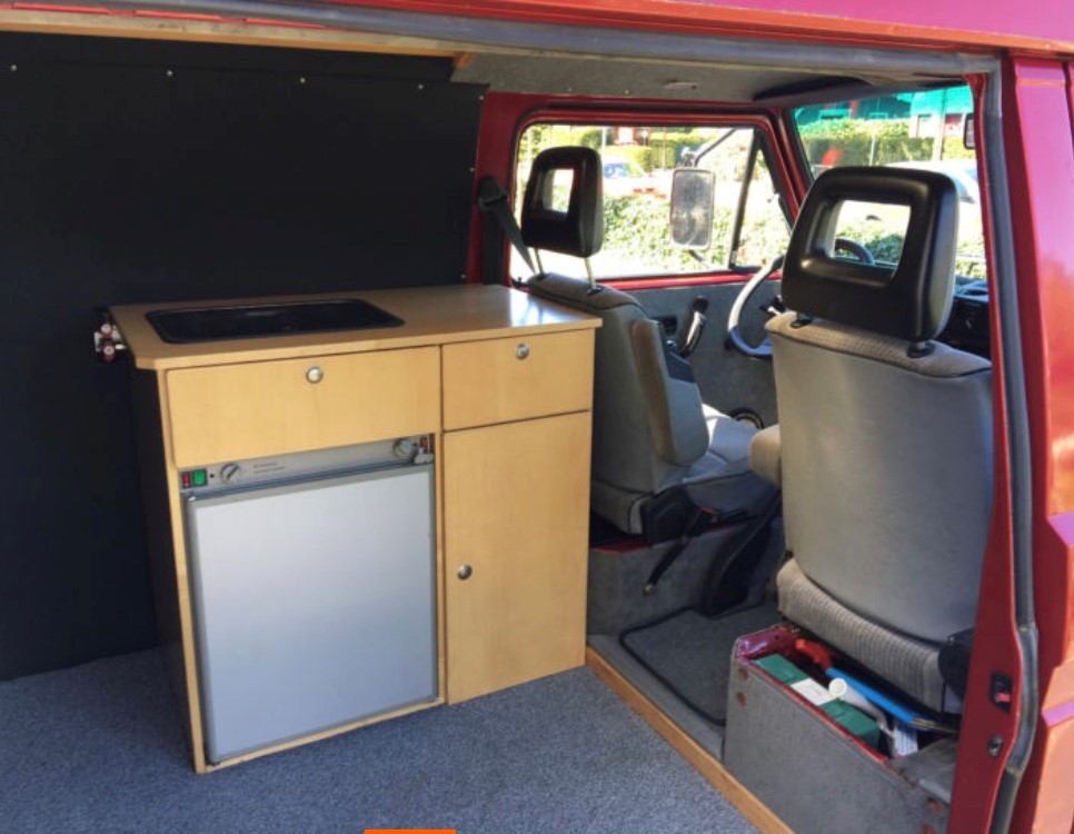 Unterwegs bin ich mit einem echten VW „Bully“ aus dem Jahr 1989. Es handelt sich um ein T3, an dem nicht mehr viel original ist. Schon meine Vorbesitzer hatten den ehemaligen Transporter zu einem Wohnmobil umgebaut. Das fest verbaute Hochdach aus GFK ermöglicht eine angenehme Stehhöhe und viel Stauraum. Die Rückbank geht über die komplette Breite und wird mit wenigen Handgriffen zu einem 1,60 x 1,90 Meter großem Doppelbett. Im Küchenblock gibt es einen 2-Flammen-Gaskocher und einen geräumigen Kühlschrank sowie weitere Staufächer und Schubladen.