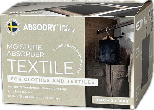 ABSODRY® DUO FAMILY in der Einweg-Minimalausführung: Der kleine 100 g-Beutel wird einfach in seiner im Lieferumfang enthaltenen Hülle mit zur Kleidung in z. B. die Schublade oder die Sporttasche gelegt. Er bindet die Feuchtigkeit auf kleinsten Flächen, damit besonders wichtige Wäschestücke möglichst lange frisch bleiben und muffiger Geruch verhindert wird.Der Entfeuchter des schwedischen Herstellers Everbrand Sweden verwendet feuchtigkeitsabsorbierende Granulatbeutel, um überschüssige Feuchtigkeit zu…