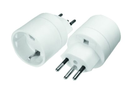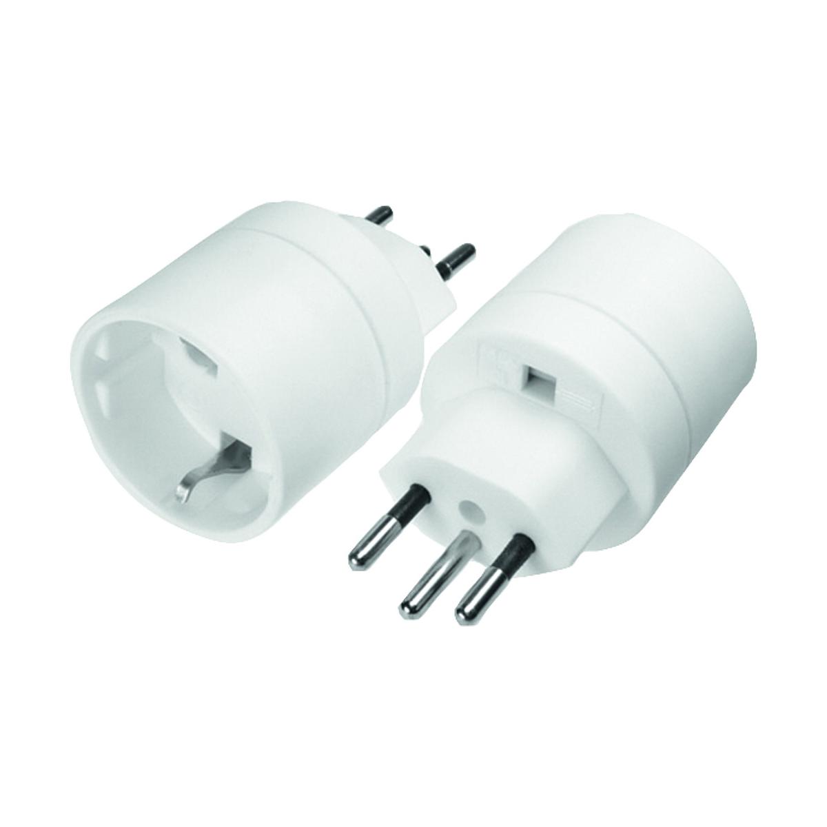 Übergangsstecker mit Schutzkontakt von Schweizer Steckdose Typ 13 auf Steckdose mit Universalkontakt, mit Feinsicherung 10 A. Technische Daten: Produktfarbe: weiß Spannung: 250 V Ø 45 mm Gewicht: 0,055 kg