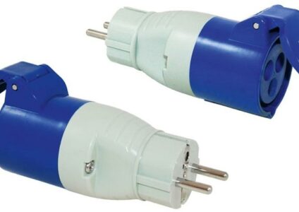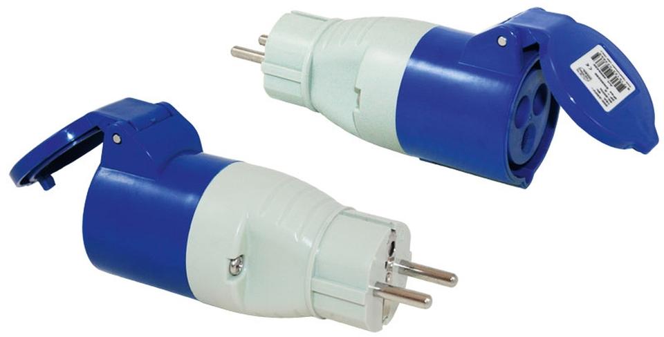 Kurzadapter mit Schukostecker und CEE-Steckdose mit Klappdeckel.