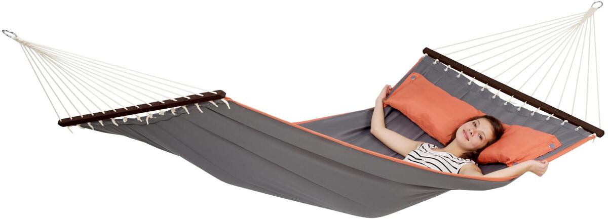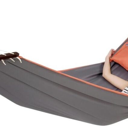 Eine Hängematte im amerikanischen Design. Groß, weich gefüttert, wie die XL Hängematten aus den Südstaaten der USA. Hängematte für max. 2 Personen Extradichter Webstoff Abknöpfbares Kissen Technische Daten: Material: Polyester (recycelt), 20% Baumwolle Material Spreizstab: Hartholz Liegefläche ca. 200 x 120 cm Hängemattenlänge außen: 335 cm Holzstablänge: 120 cm Belastbarkeit: max. 180 kg Gewicht: ca. 3,3 kg Bodenabstand: ca. 40 – 50 cm Farbe: grau Lieferumfang: American Dream Hängematte Kissen…