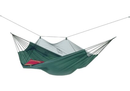 Eine Seite ist komplett mit fest angenähtem Moskitonetz, die andere Seite als ',normale', Hängematte nutzbar. Das Moskitonetz hält Ihnen störende Fluginsekten fern, schützt vor fallenden Blättern und gewährt so die Ruhe, die man in der Hängematte sucht. Die Hängematte ist trotz der großen Ausmaße sehr klein zu verpacken. Das Netz mit einer Maschenweite von 250 Mesh besitzt eine kleine Innentasche (z. B. für Brille oder Uhr). Der Einstieg ins Netz ist mit einem Reißverschluss versehen. Ein…