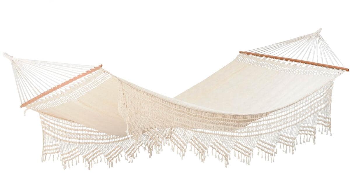 Brasilianische XXL Premium Stabhängematte für die ganze Familie. Die XXL Stabhängematte Palacio ist groß wie ein französisches Bett und lädt zum Träumen und Entspannen ein. Hängematte für bis zu 3 Personen Weicher, fest gewebter Hängemattenstoff (mind. 85% recycelte Baumwolle) Per Hand eingewebte Nadelstreifen Handgearbeitete Macraméeabschlüsse an beiden Enden der Hängematte Punktueller Belastungsauszugleich an beiden Enden der Hängematte durch extra dicke Schnüre Spreizstäbe aus Hartholz 400 g/m2…