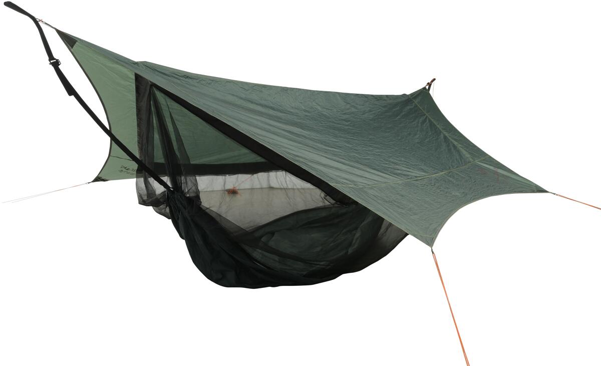Das Traveller Camp besteht aus einer ultraleichten Hängematte, die über ein extragroßes Moskitonetz fest mit einem Tarp verbunden ist. So bietet es Schlafplatz, Moskitonetz und Schutz vor Wind und Regen in einem. Das All-in-one Set-Up ist ultraleicht und weißt ein sehr geringes Packmaß auf. Das Moskitonetz ist bereits direkt angenäht und muss nicht mehr aufgespannt werden. Dabei ist sie äußerst robust, bei einer Belastbarkeit von bis zu 200 kg. Das Traveller Camp kann auch als Tarp verwendet werden….