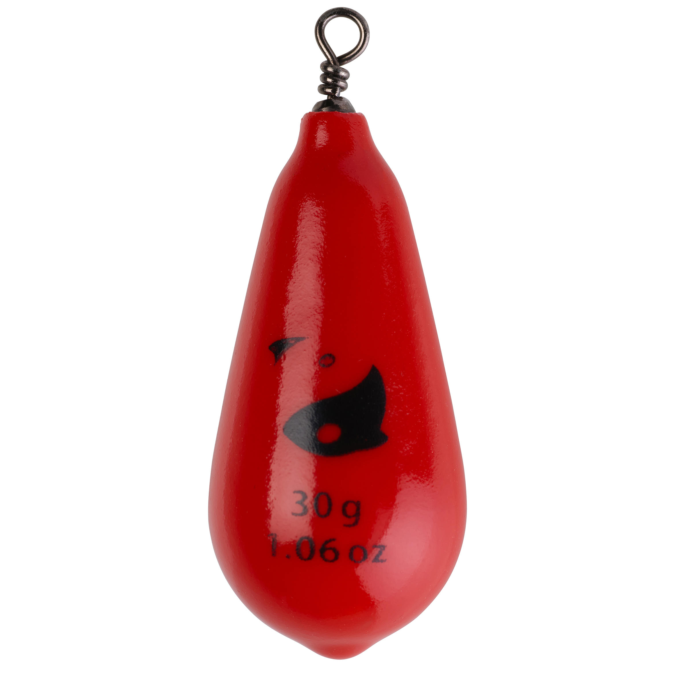 Die rote Kunststoffbeschichtung weckt die Neugierde der Fische. Halt::Das Blei stabilisiert die Montage auf dem Grund.|Aerodynamik::Seine aerodynamische Birnenform ermöglicht weite Würfe. |Einfacher Auf- und Abbau::Der Wirbel begrenzt die Gefahr des Verdrehens beim Einholen.|Visuelle Wirksamkeit::Die rote Kunststoffbeschichtung lockt Fische an.|Vielseitigkeit::Dieses Blei kann für Paternoster verwendet werden.